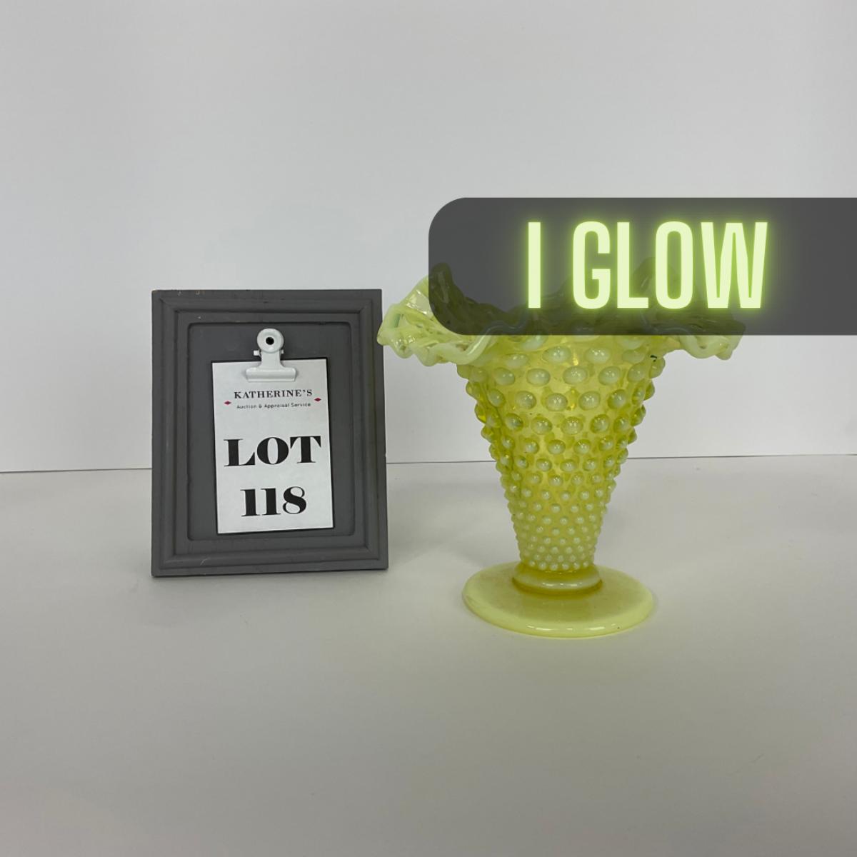 One Fenton Vaseline glass opalescent hobnail vase. I am Uranium glass so I DO GLOW under blacklight. Please see photos for details and condition. ::: Shipping is available on this lot. If you require shipping you must let us know at the close of the auction. We will coordinate with you after the item has been won. Shipping fees will include insurance up to or exceeding the value of all items being mailed. If you have any questions regarding this lot please contact the auctioneer either via this website, by direct email or by phone. PICK UP TIMES and other important information can be found in the TERMS and DESCRIPTION of the auction. Please take a look for pertinent information. Thanks!