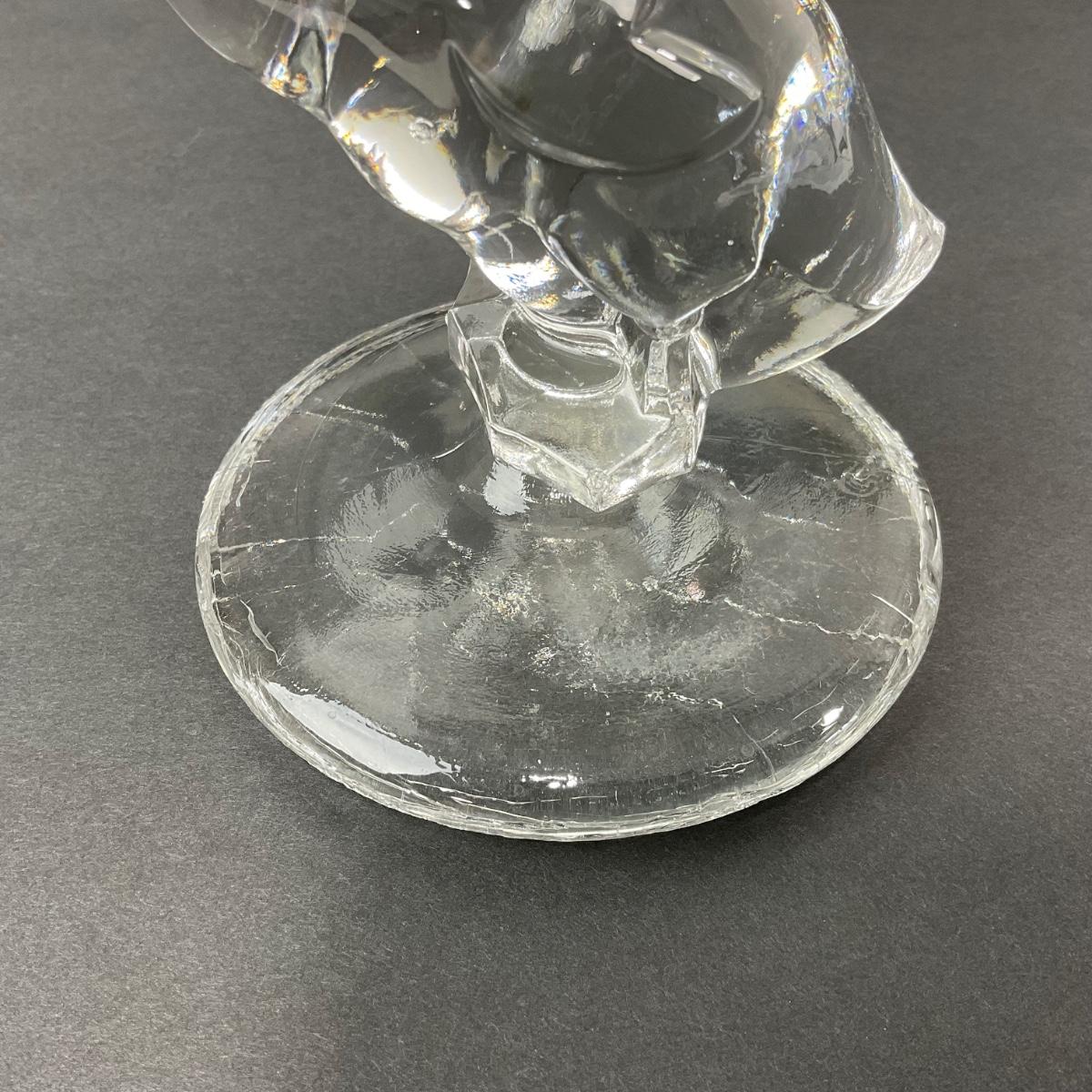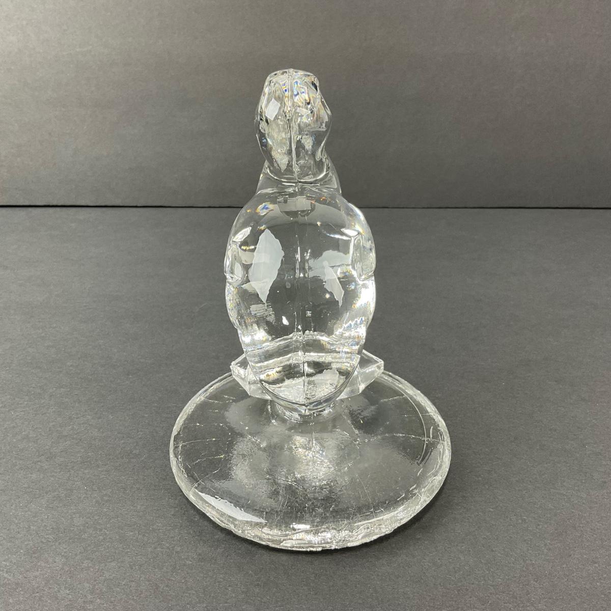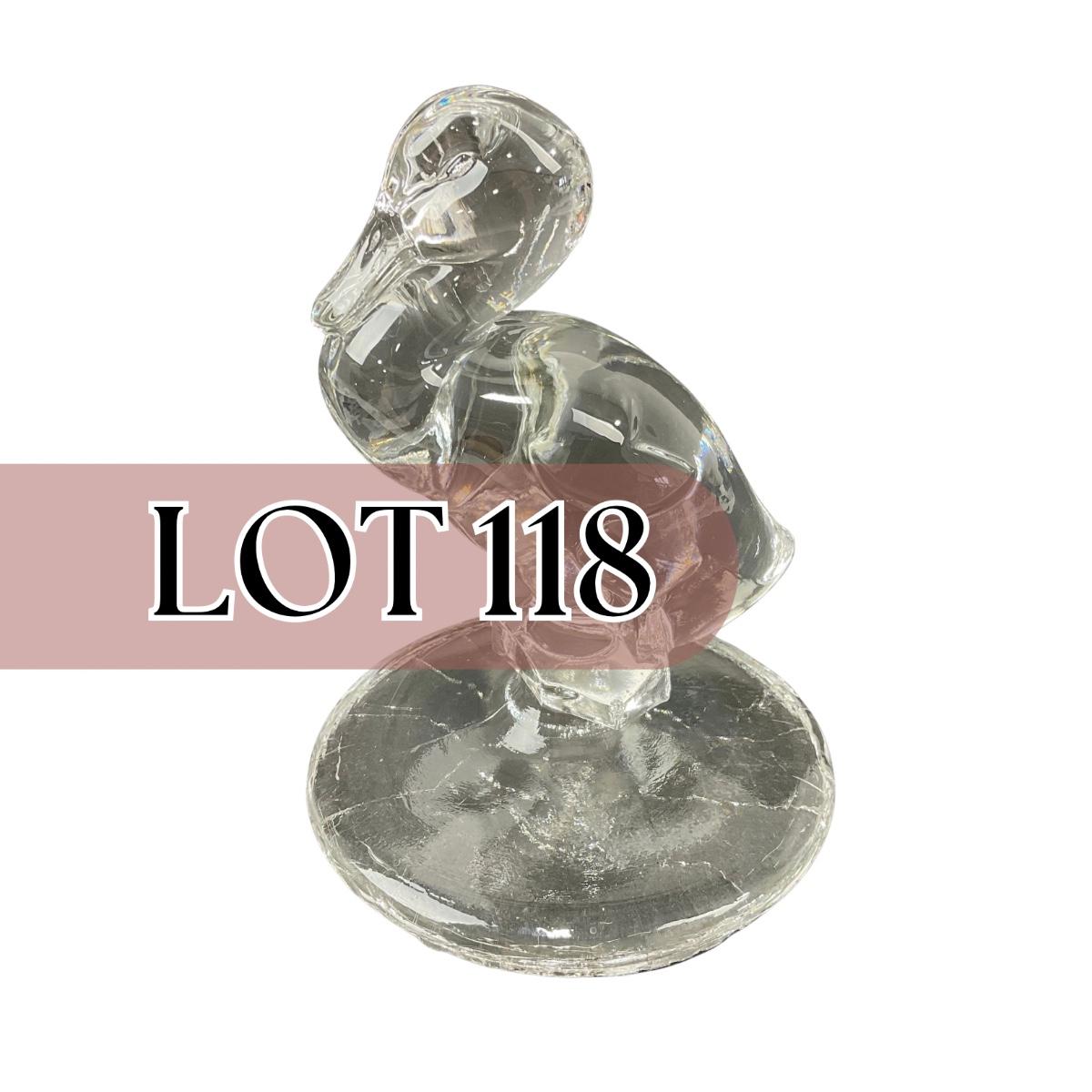 One very unique art glass duck figure. This appears to almost look like it was made to be a lid of a jar as the boom base looks like it has an inner rim. This piece has a very damaged base. Lots of scuff marks and chips. All mainly located at the base. For that reason this piece with be a local pickup item only. If you are out of state and understand it has damage. Please feel free to contact the Auctioneer and we can talk about shipping. Please see photos for details and condition. Any condition statement is given as a courtesy to a client, is an opinion, and should not be treated as a statement of fact. Reference to condition written, oral or within a condition report shall not be regarded as a full account of condition and may not include all defects, alterations, or restorations. Absence of a condition report does not imply a lot is flawless or lacking imperfections or damage. Katherine’s Auction & Appraisal Service shall have no responsibility for any error or omission. Returns shall not be accepted on the basis of condition. ::: Shipping is NOT available on this lot. If you have any questions regarding this lot please contact the auctioneer either via this website, by direct email or by phone. PICK UP TIMES and other important information can be found in the TERMS and DESCRIPTION of the auction. Please take a look for pertinent information. Thanks!