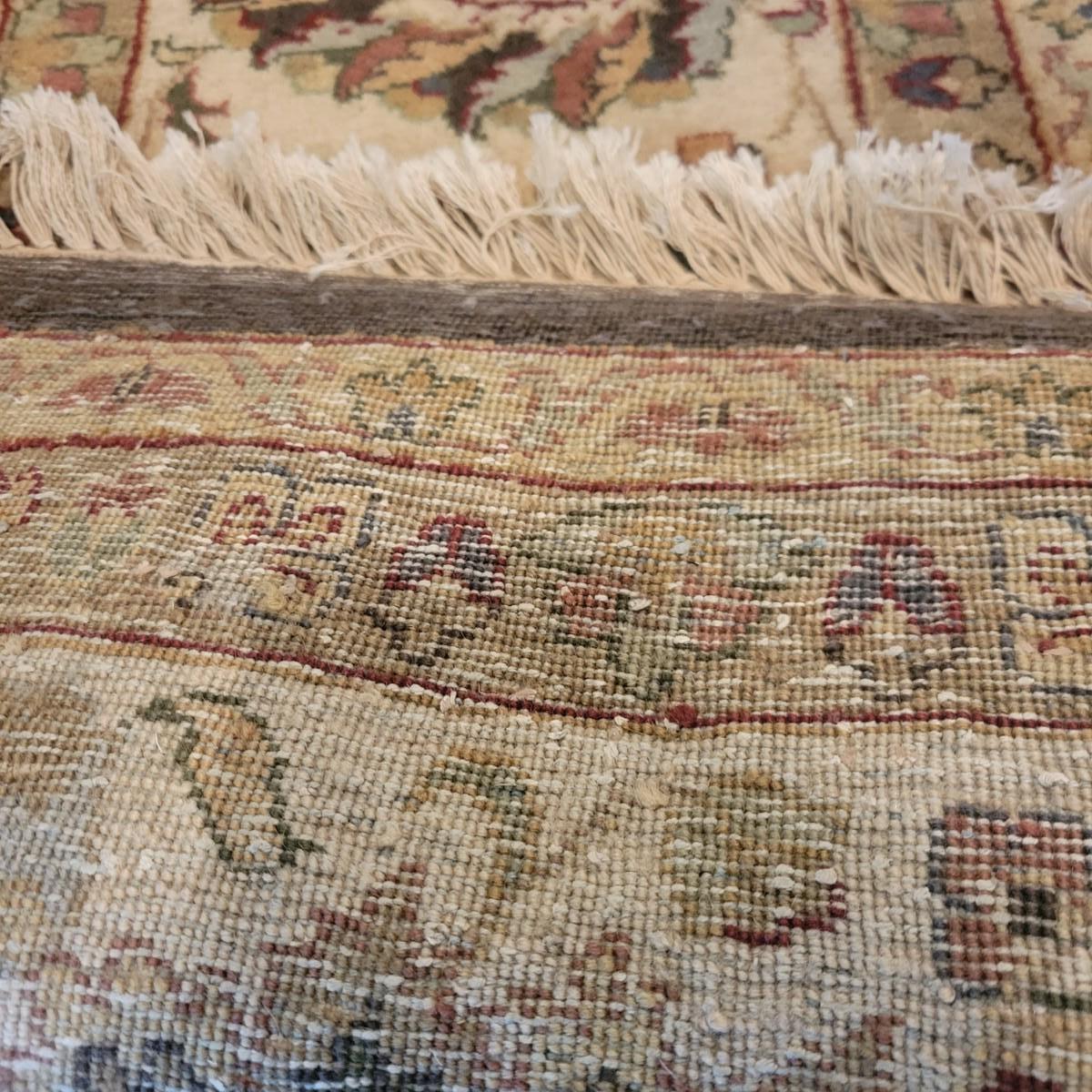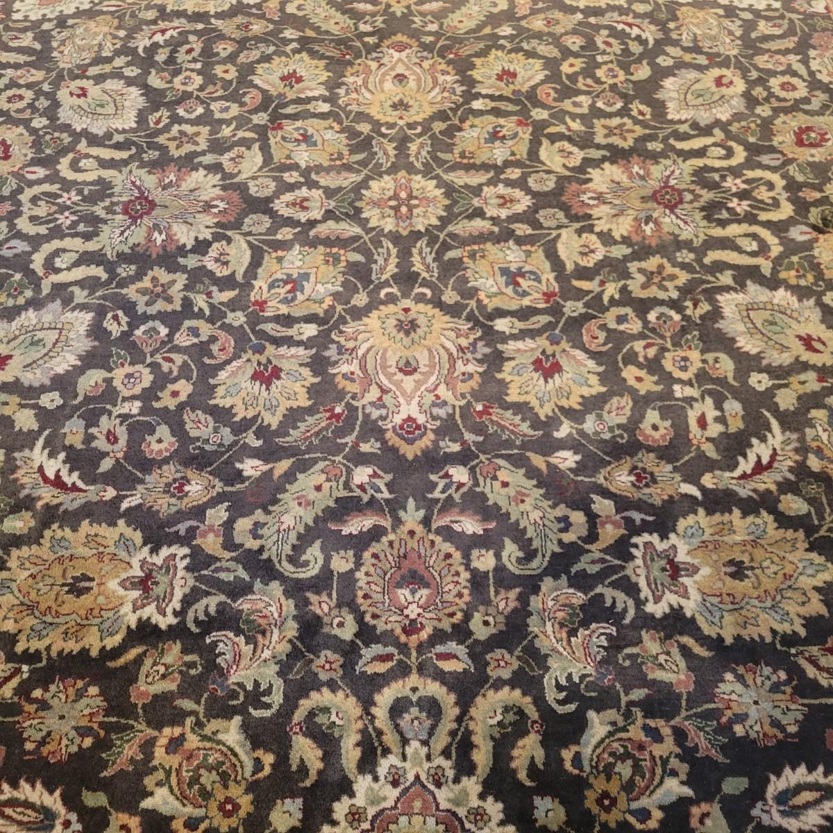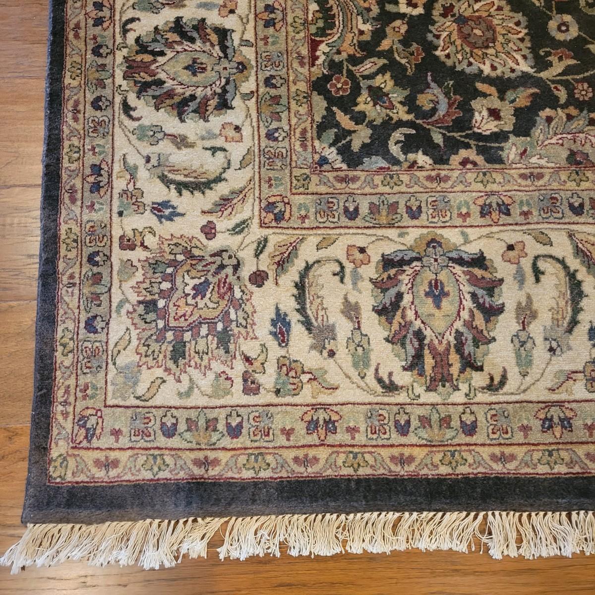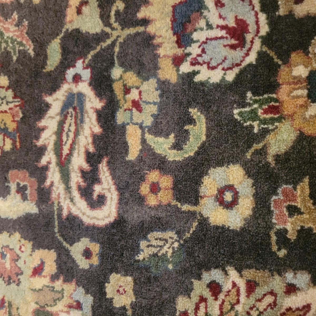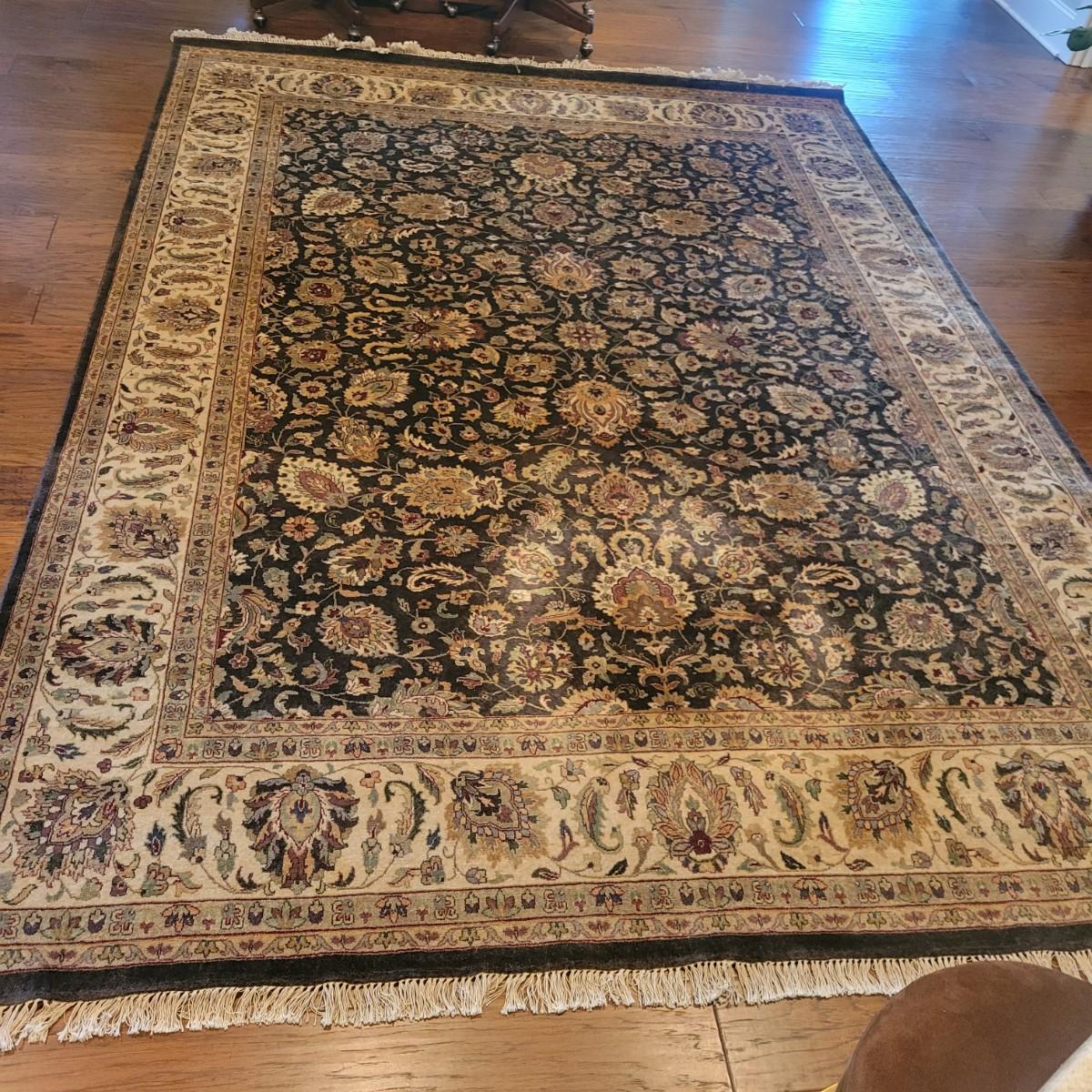 A large area rug that appears to 100% wool pile that the estate owner states is a Surya Heirloom rug HLM-6001. It features a black background with accents of cream, greens and reds. It measures approximately 11'8" x 8'5". This rug matches another Surya rug in this auction (receipt shown for smaller rug). Local pickup only. Winning bidder must bring assistance to help move and load this item due to its weight and/or size.