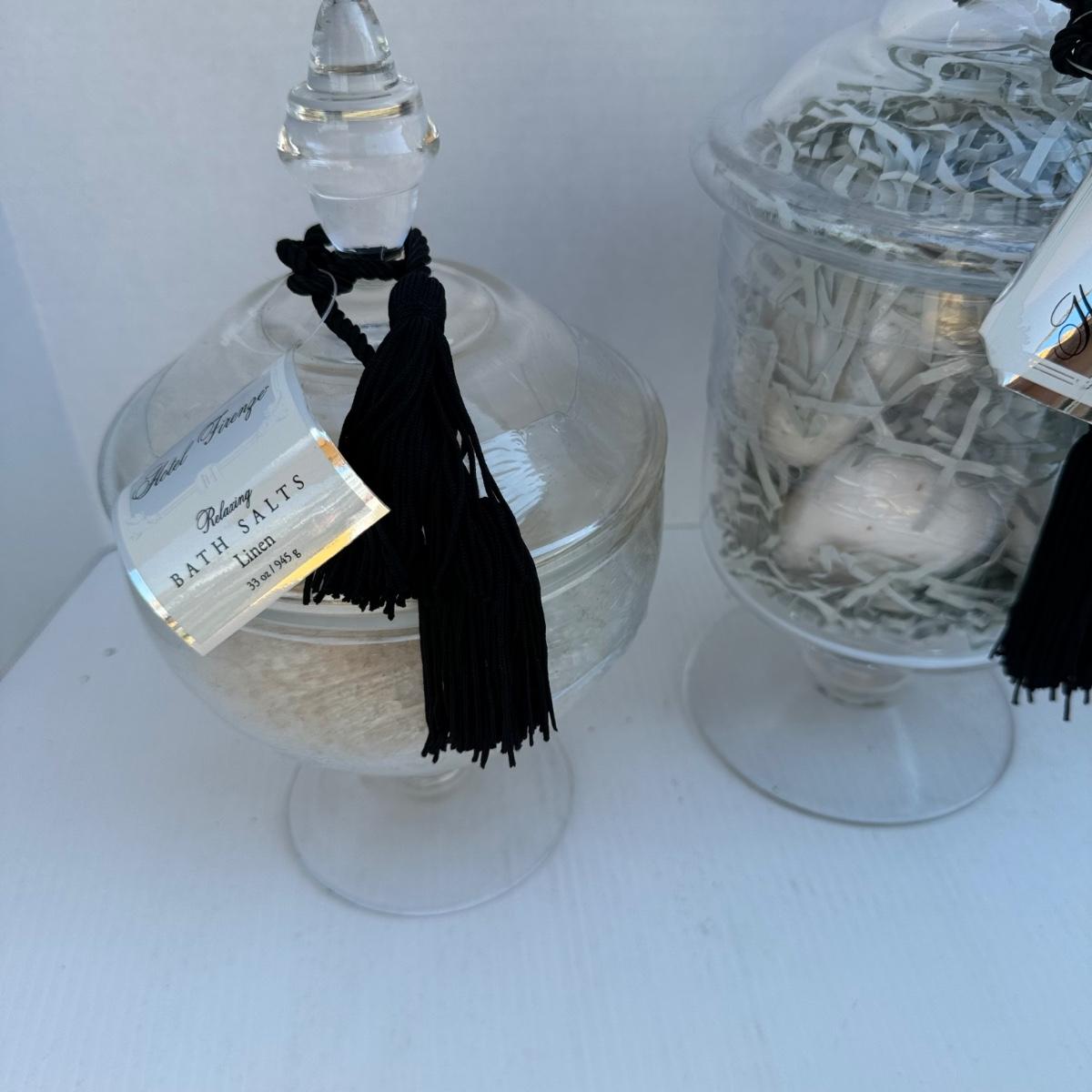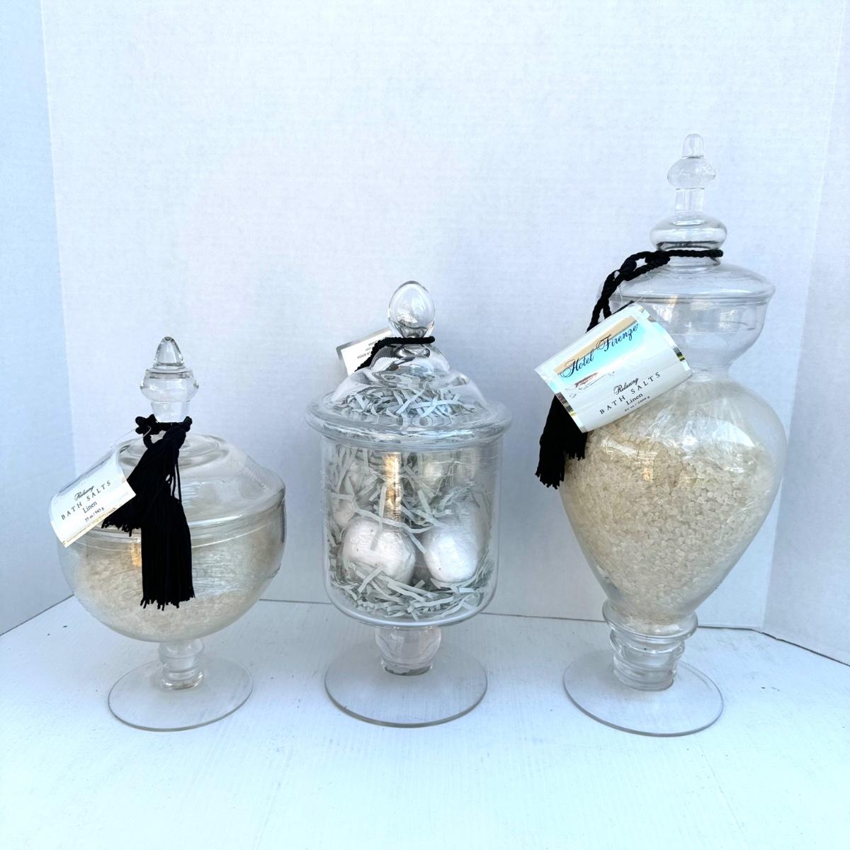 1180 Set of Three New Sealed Bath Salt Glass Apothecary Jars
