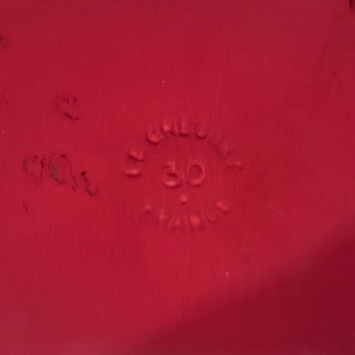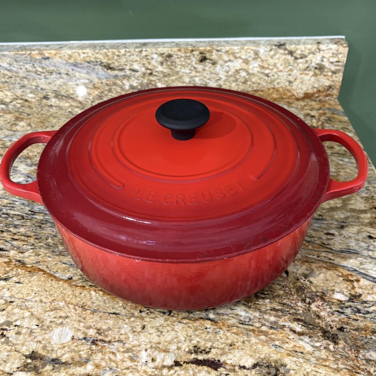 This Res Le Creuset Dutch Oven measures at 12" in diameter and has a depth of approximately 4". It appears to be in sturdy condition with signs of wear on the inside and several blemishes on the outer lid. See pictures.