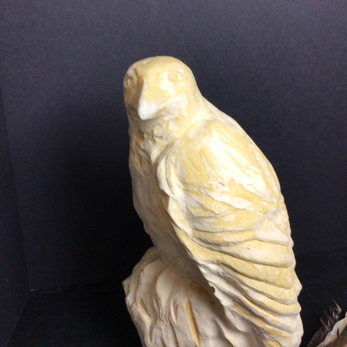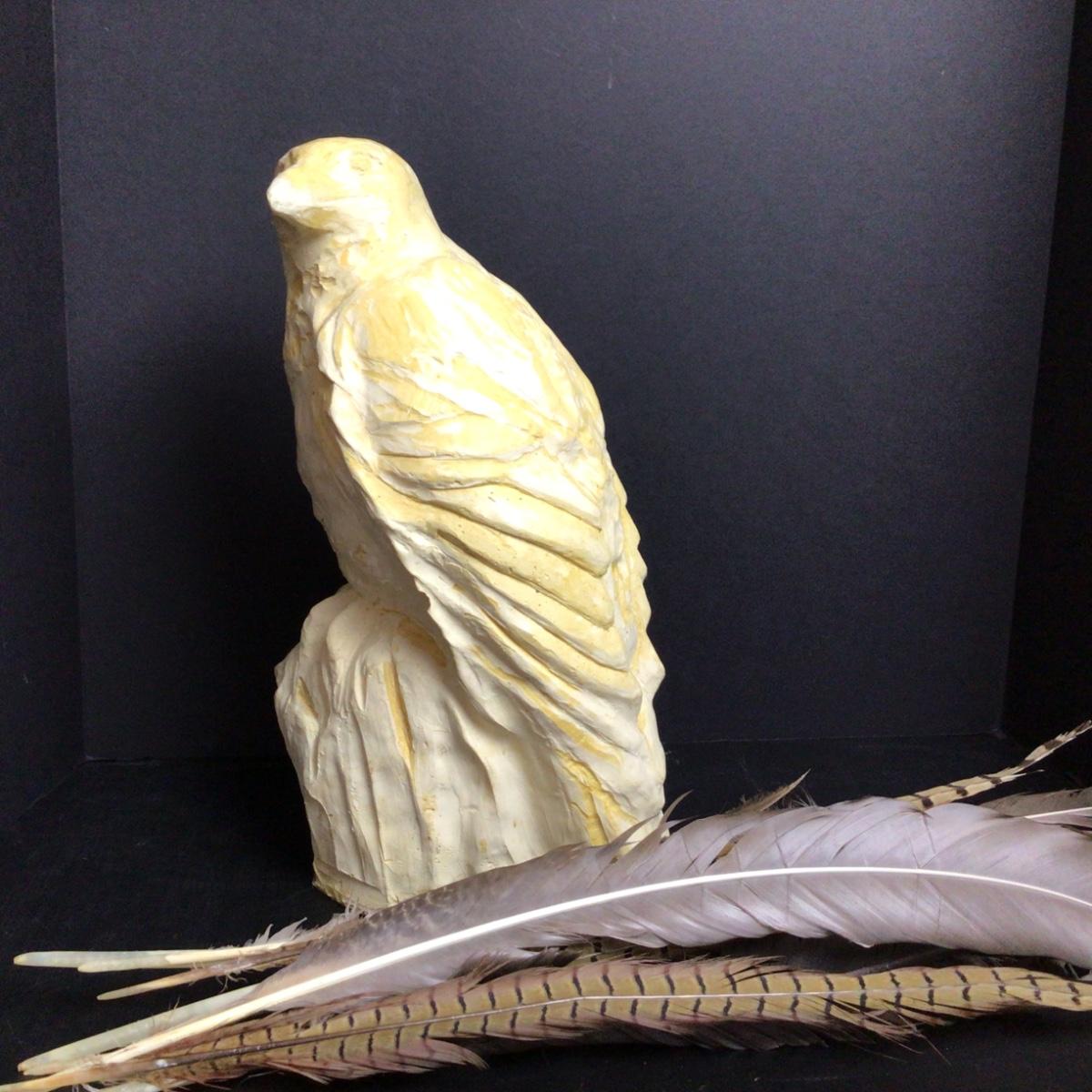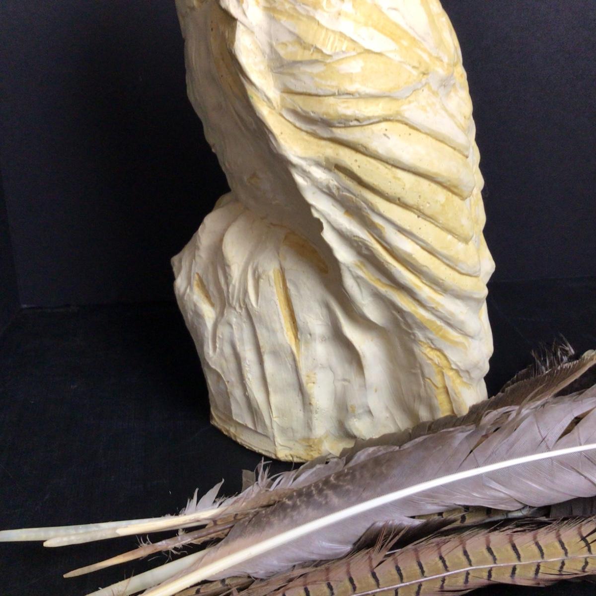 The sculpture is 14” tall and 7” wide, composition and very heavy. Assorted wild bird feathers.