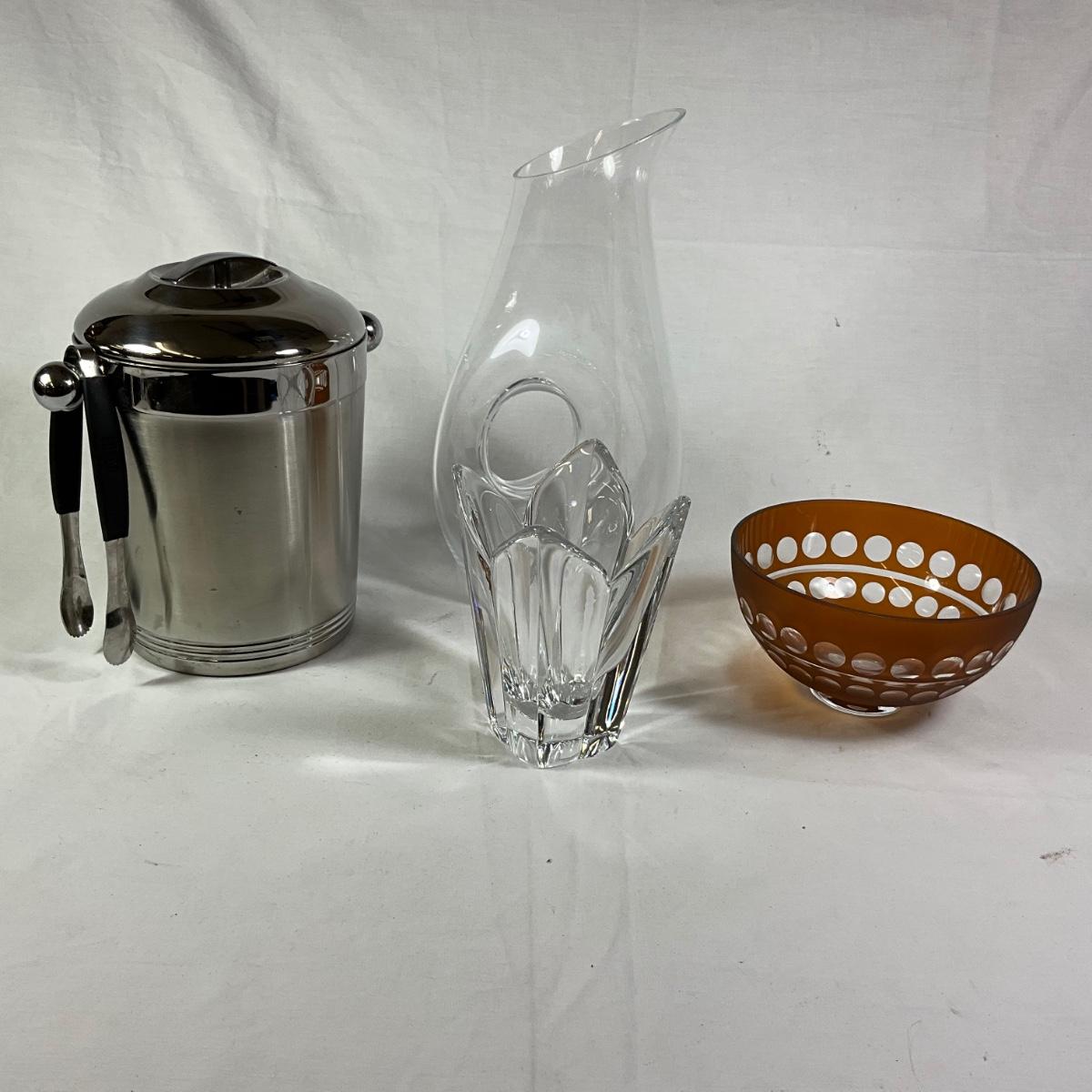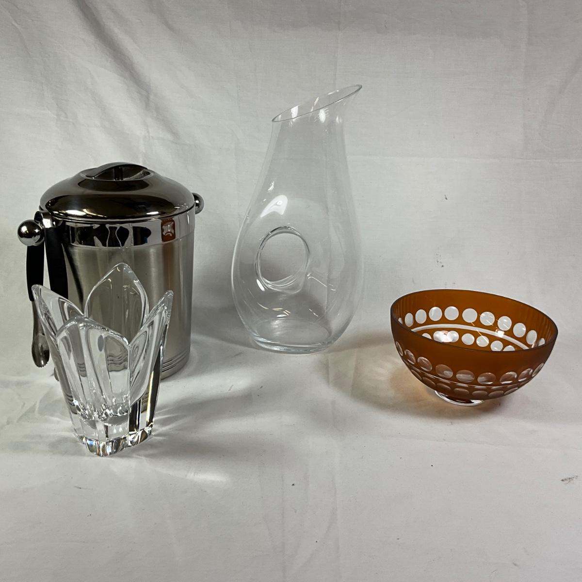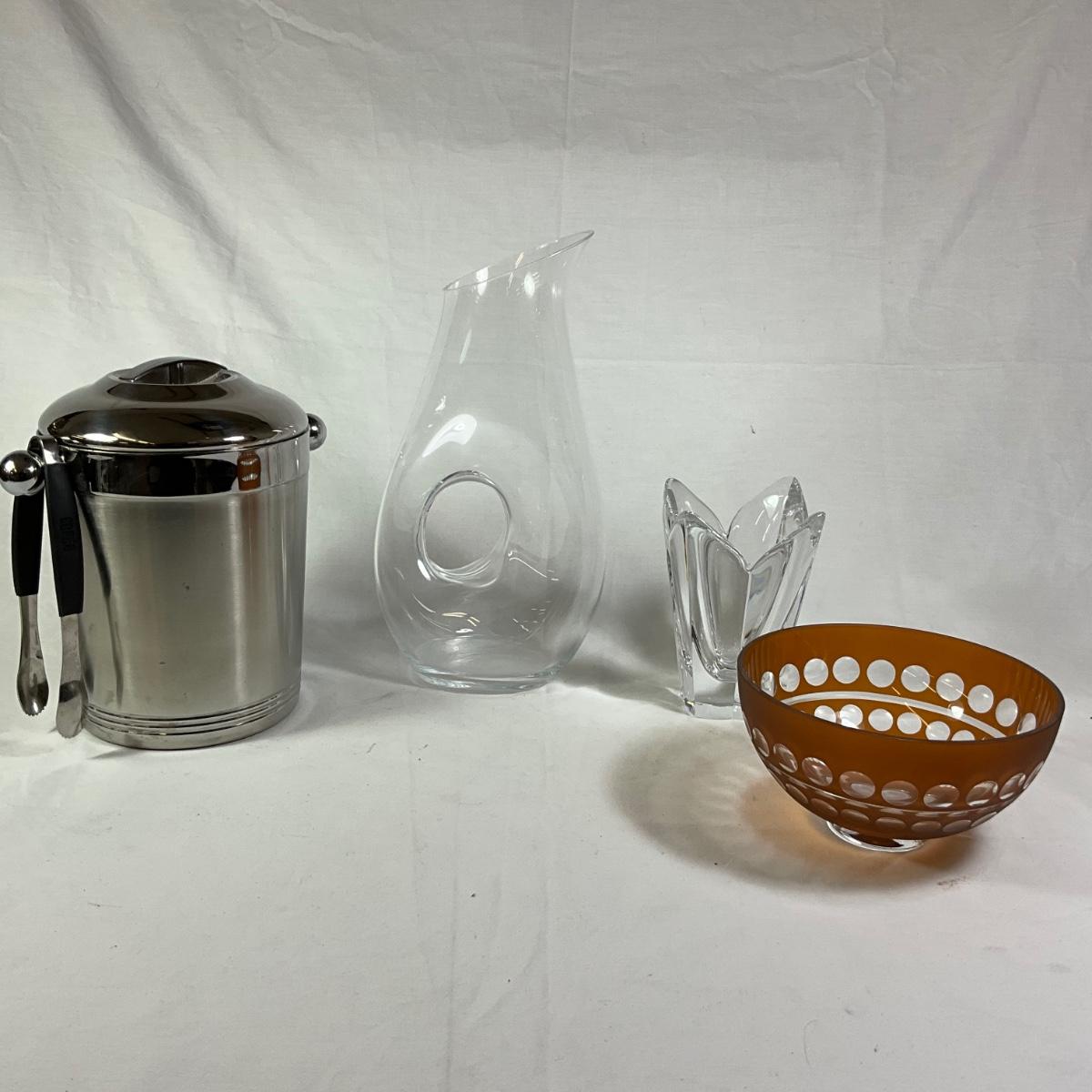 1185 Copco Ice Bucket with Orrefors Vase, Wine Carafe , and Colored Glass Bowl