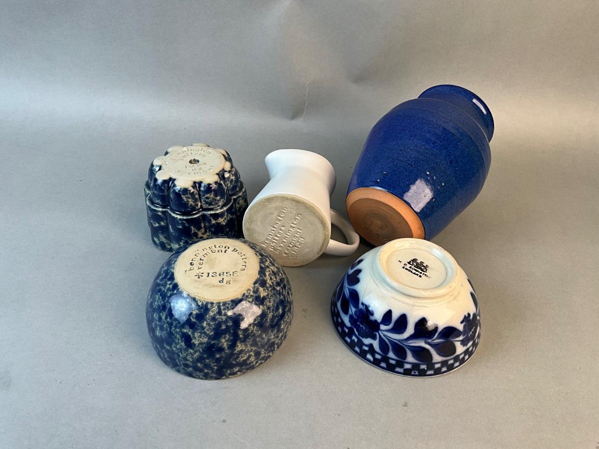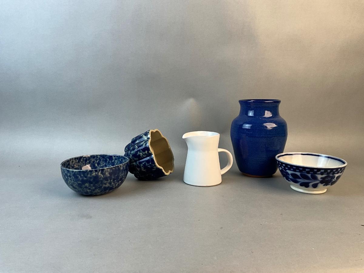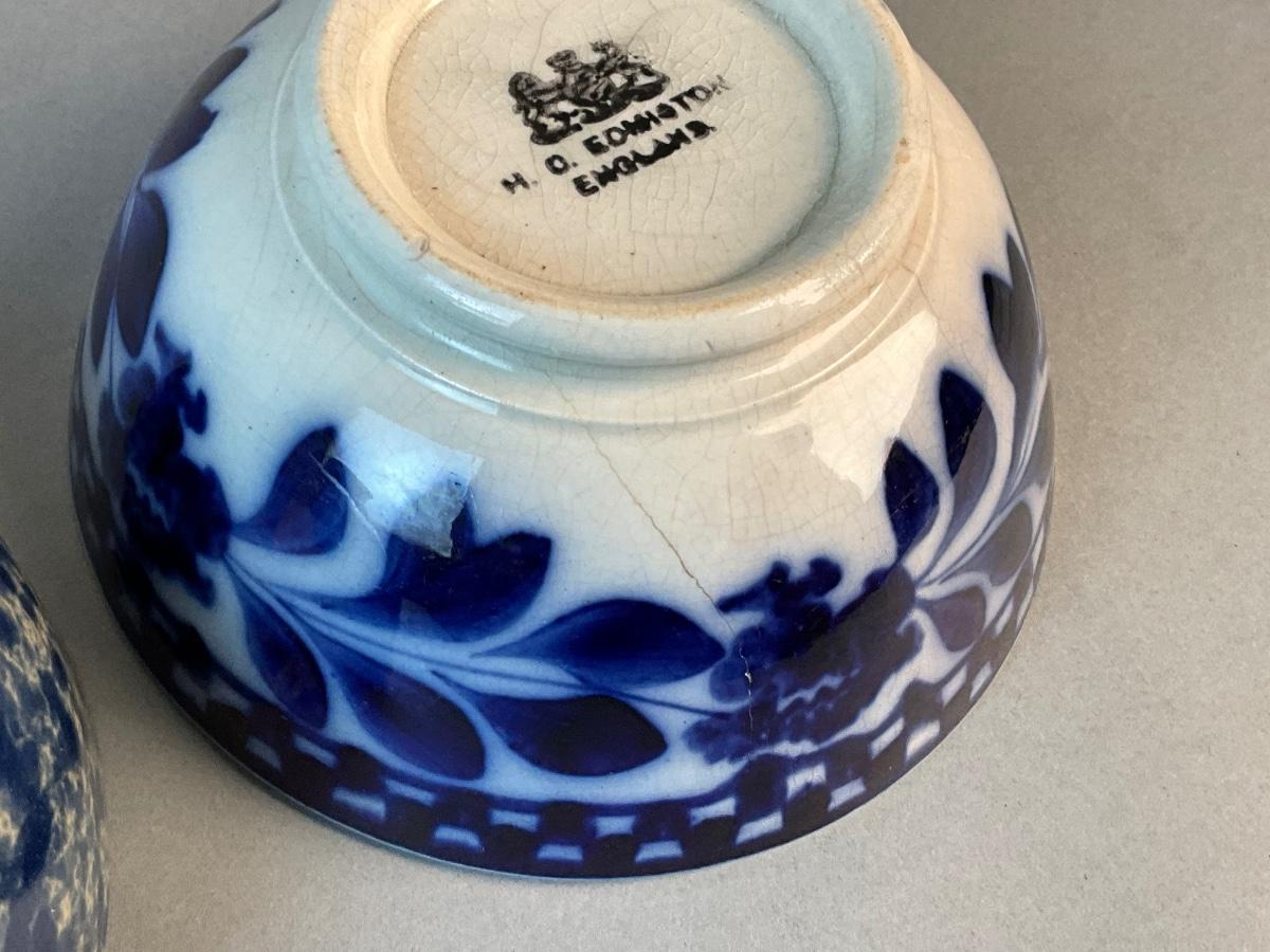 One flow blue bowl is English and there is a round bennington bowl with a mold and white pitcher /jug