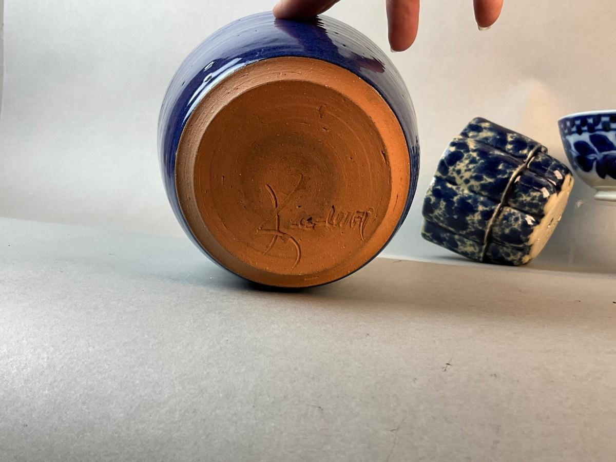 Blue pottery vase is by Diane Kingman and measures 7.5" high
