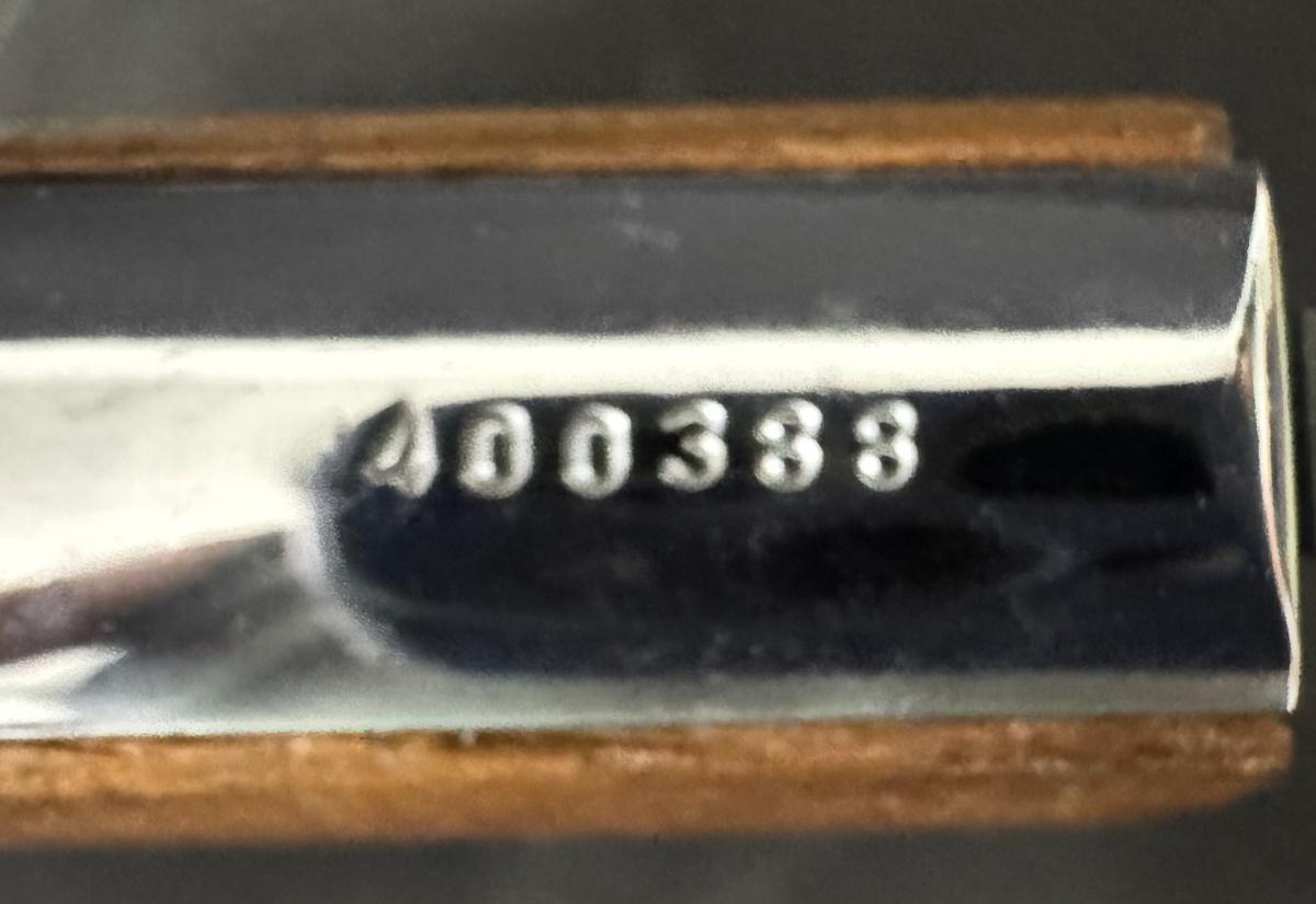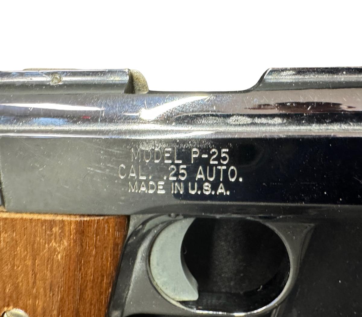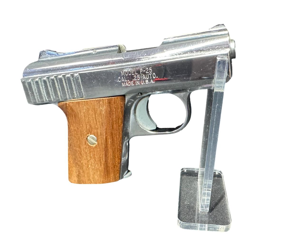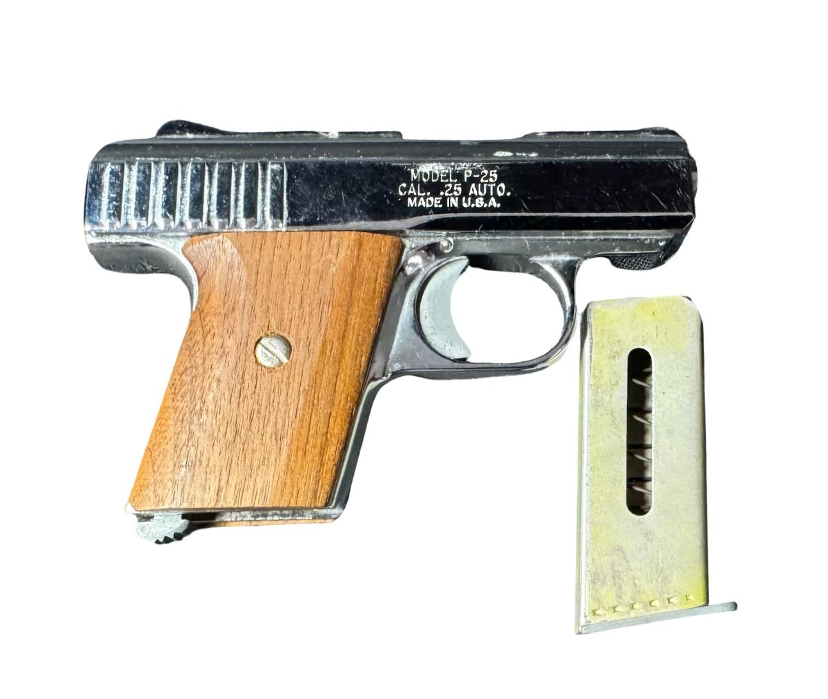 This is a .25 caliber semi-automatic, nickel plated pistol. It comes with one six-round magazine. It has smooth walnut grips. The barrel length is 2.5 inches. Overall length is 5.25 inches. These pistols were produced between 1970 and 1984. Serial number 400388. Not tested. [PM]