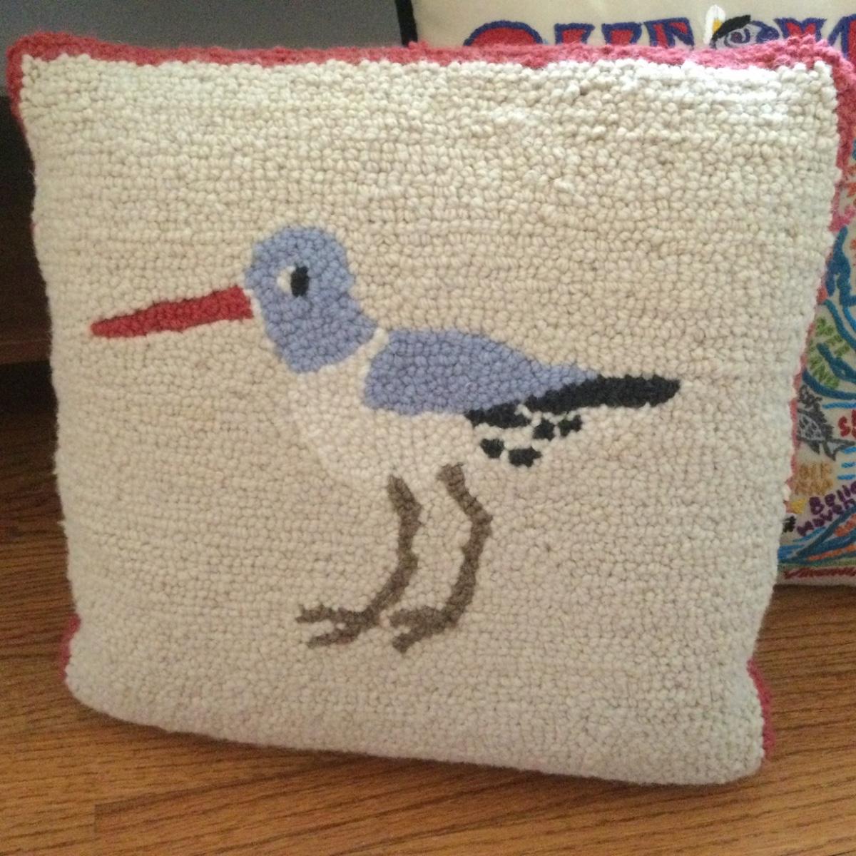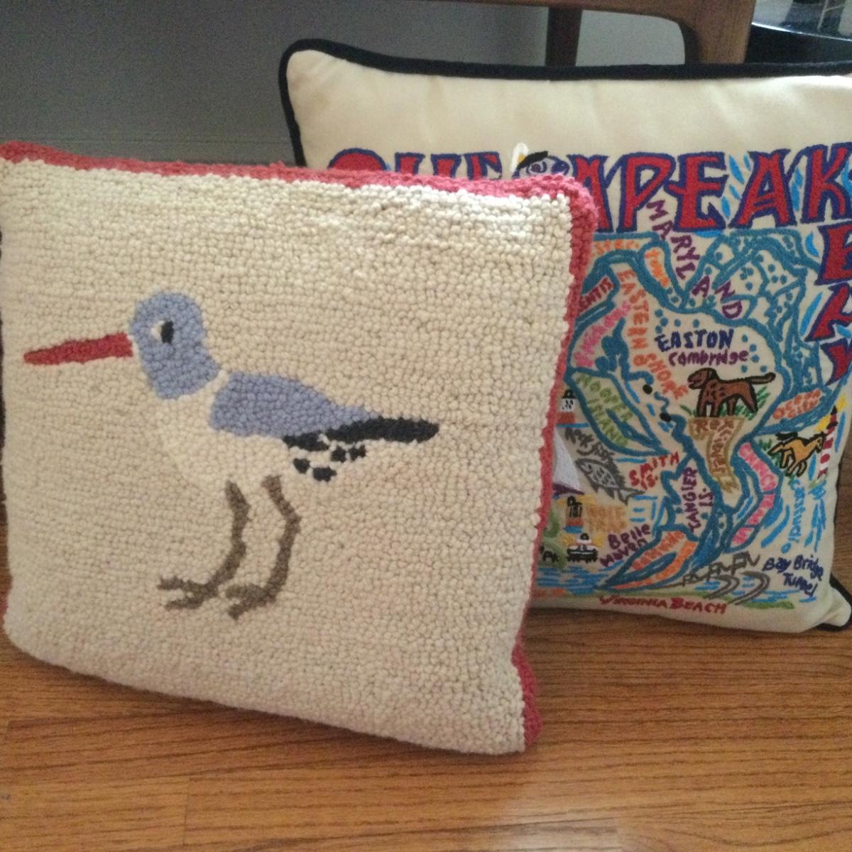 The Cat Studio pillow of the Chesapeake Bay is 18” square, and the L.L. Bean Woven pillow is a shorebird and measures 16” square.
