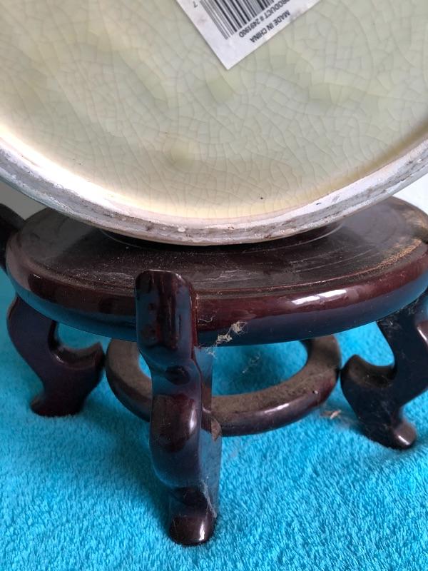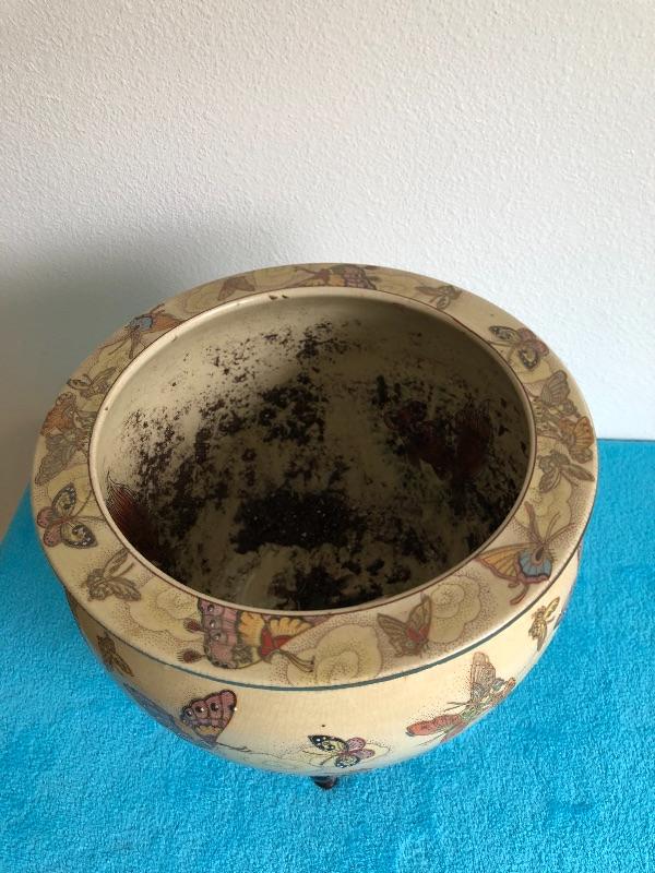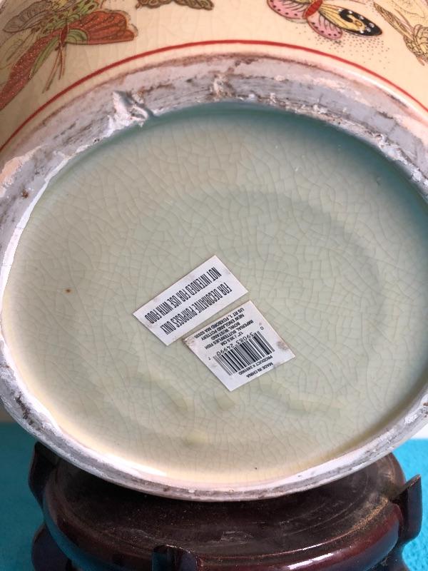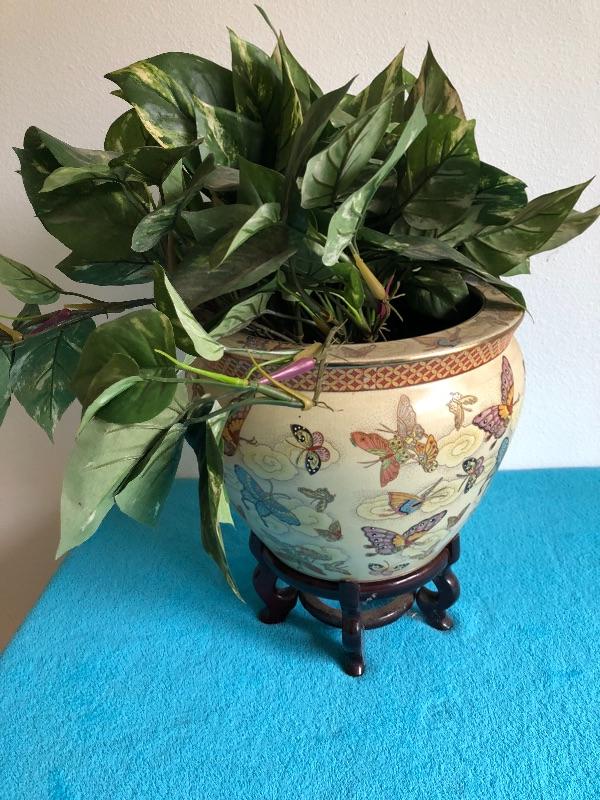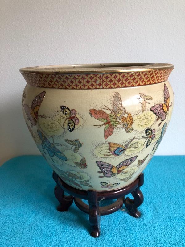 14 inches Tall x 12 Wide Cloisonne' style butterfly glazed pot. Wood Oriental stand included.