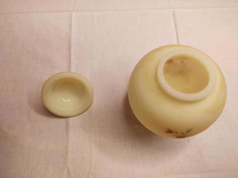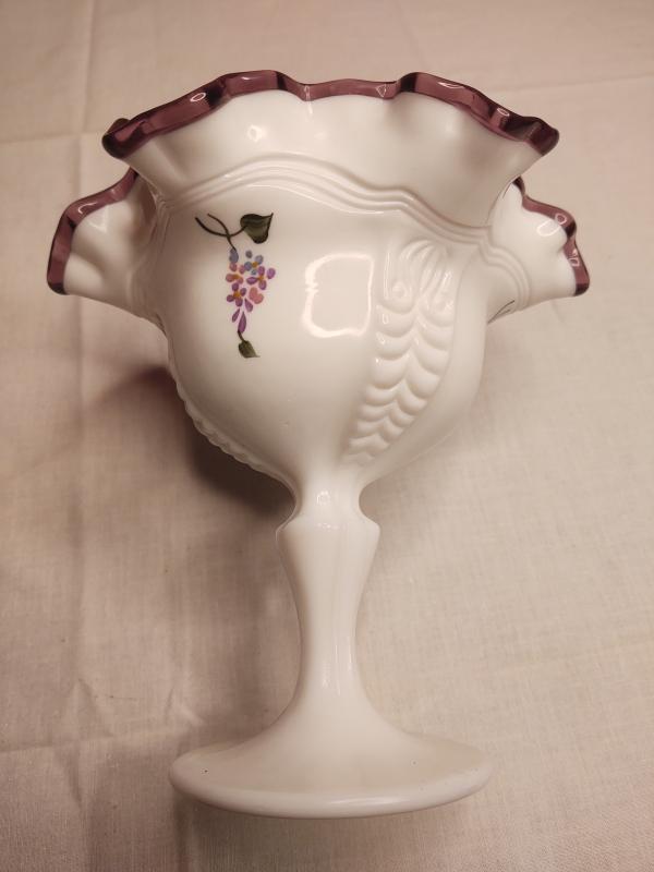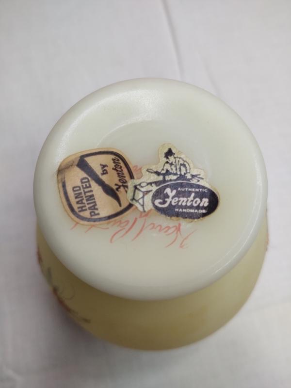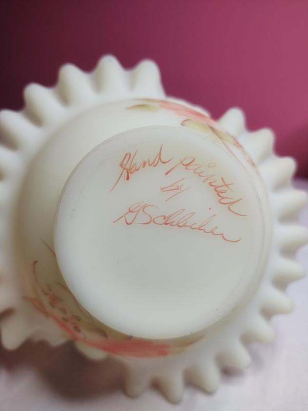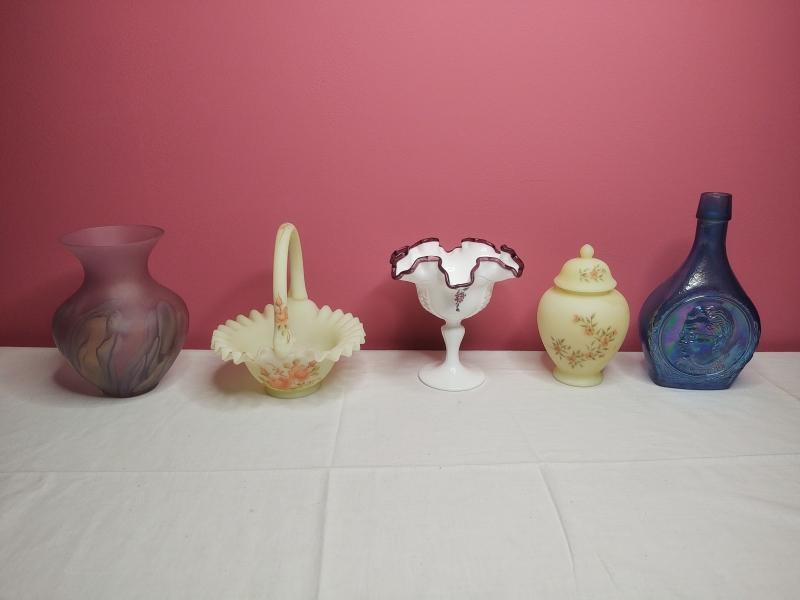 Fenton, signed pieces, and others. Basket has a chip in the handle and a crack on the side. Please see pictures for inspection.