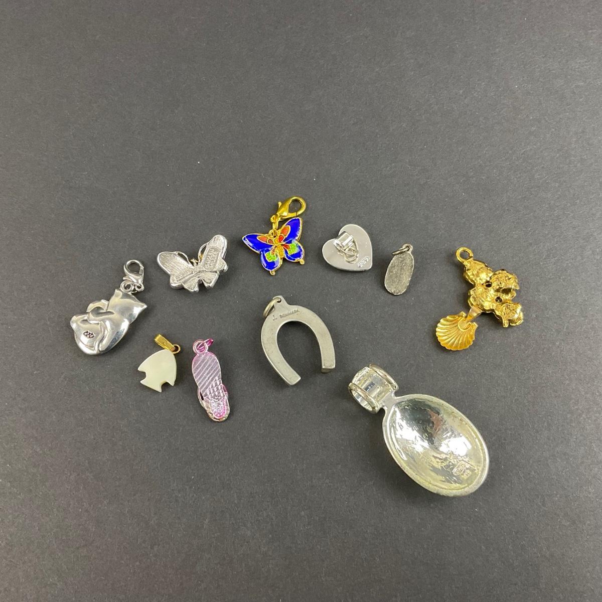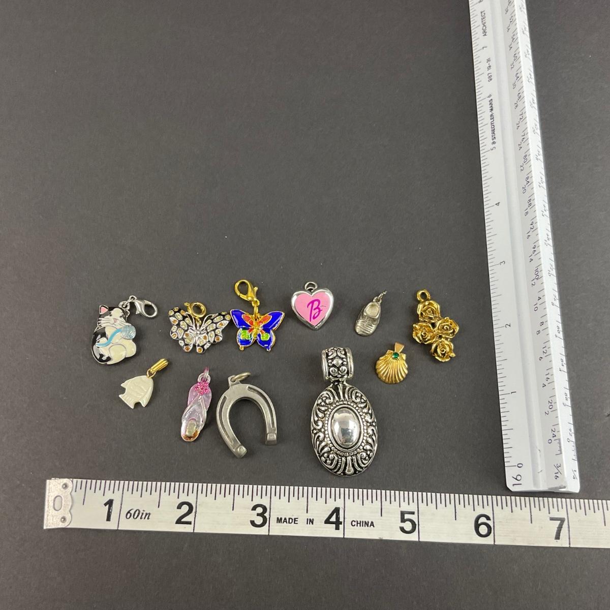 Eleven miscellaneous assorted charms. Please see photos for details and condition. Any condition statement is given as a courtesy to a client, is an opinion, and should not be treated as a statement of fact. Reference to condition written, oral or within a condition report shall not be regarded as a full account of condition and may not include all defects, alterations, or restorations. Absence of a condition report does not imply a lot is flawless or lacking imperfections or damage. Katherine’s Auction & Appraisal Service shall have no responsibility for any error or omission. Returns shall not be accepted on the basis of condition. ::: Shipping is available on this lot. If you require shipping you must let us know at the close of the auction. We will coordinate with you after the item has been won. Shipping fees will include insurance up to or exceeding the value of all items being mailed. If you have any questions regarding this lot please contact the auctioneer either via this website, by direct email or by phone. PICK UP TIMES and other important information can be found in the TERMS and DESCRIPTION of the auction. Please take a look for pertinent information. Thanks!
