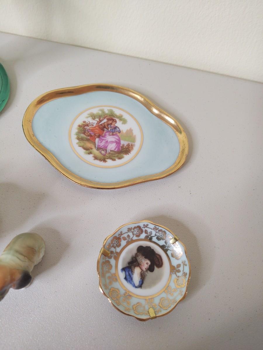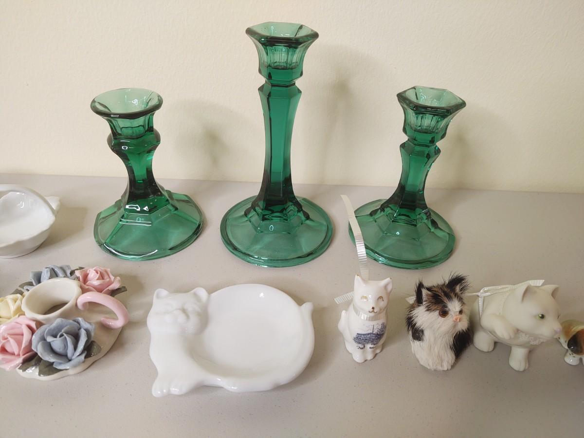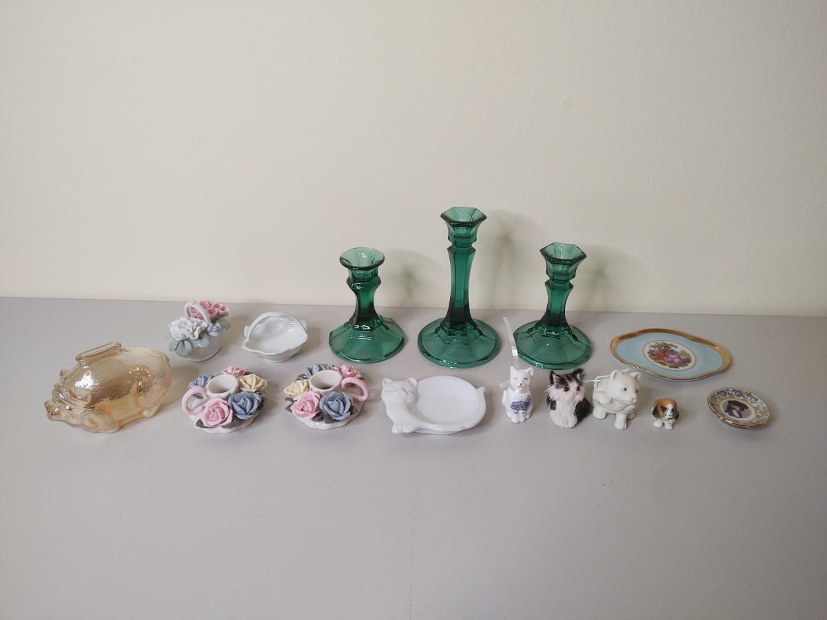 Various items including candlesticks, tea bag caddies, and two small Limoges pieces.