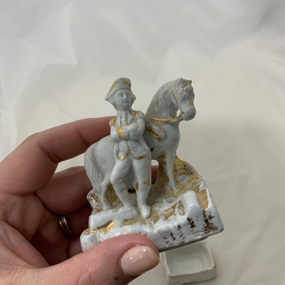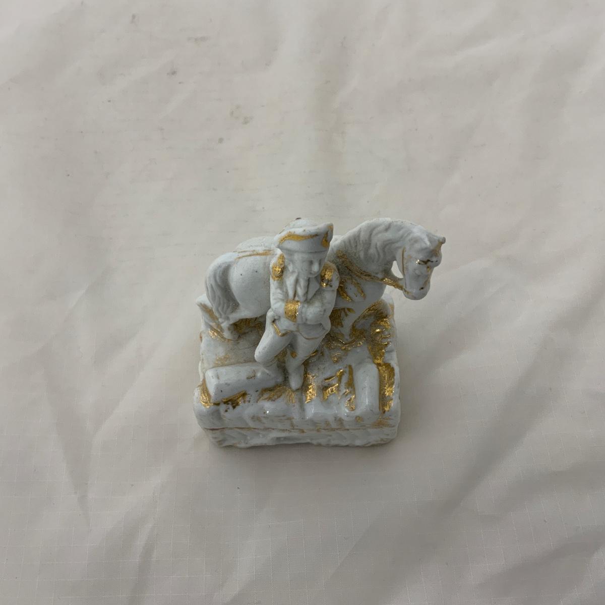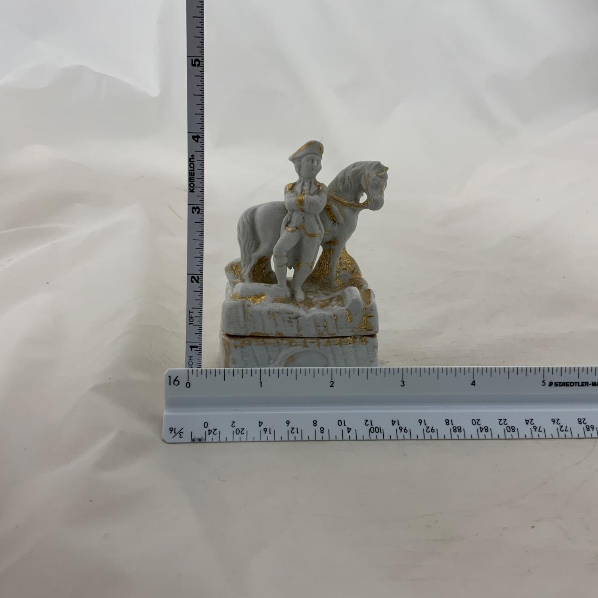 Unique and Exceptional George Washington with his horse, atop a trinket dish, circa 1860. Piece is in exceptional condition. Some gold loss over the years. Please see photos for details and condition. ::: Shipping is available on this lot. If you require shipping you must let us know at the close of the auction. We will coordinate with you after the item has been won. Shipping fees will include insurance up to or exceeding the value of all items being mailed. If you have any questions regarding this lot please contact the auctioneer either via this website, by direct email or by phone. PICK UP TIMES and other important information can be found in the TERMS and DESCRIPTION of the auction. Please take a look for pertinent information. Thanks!