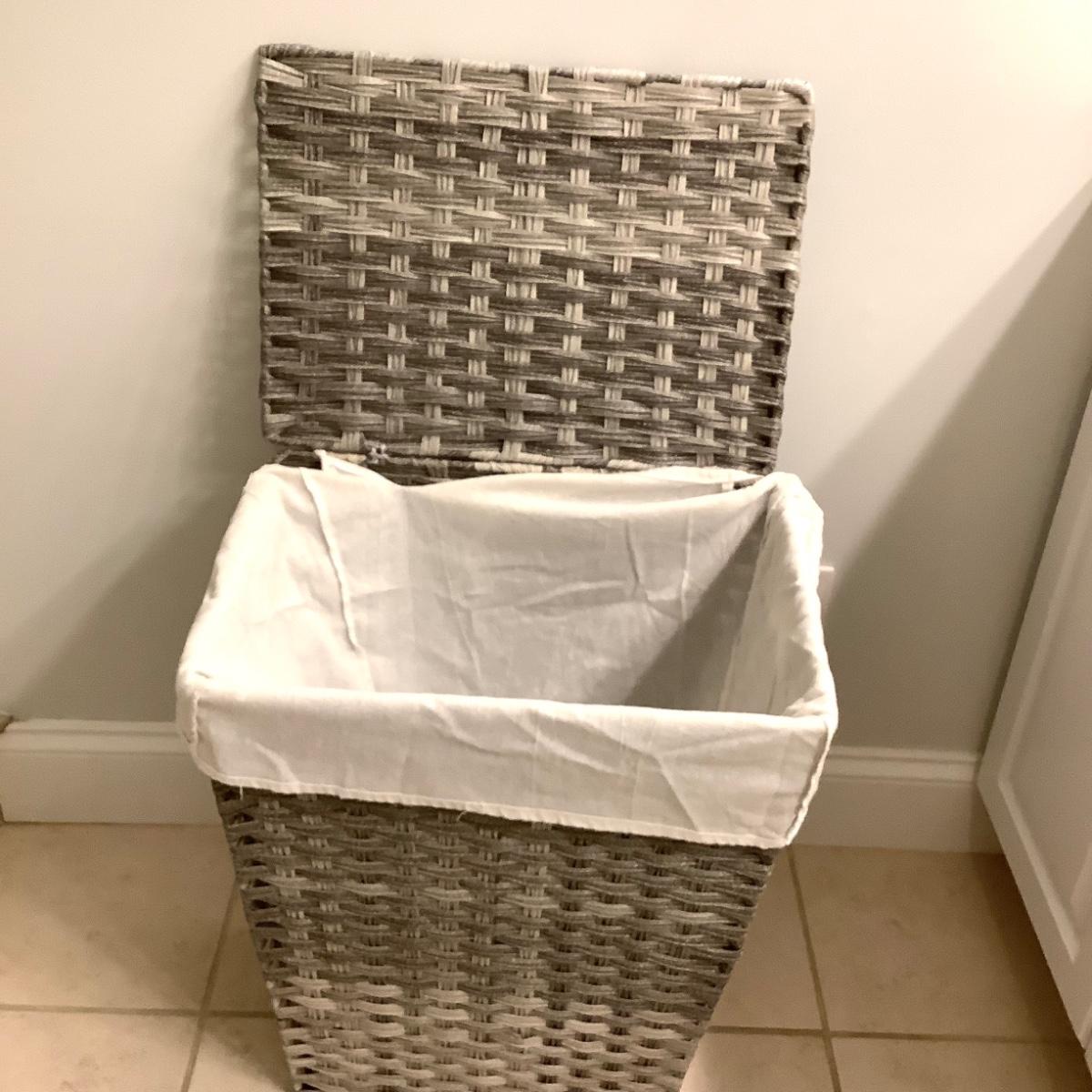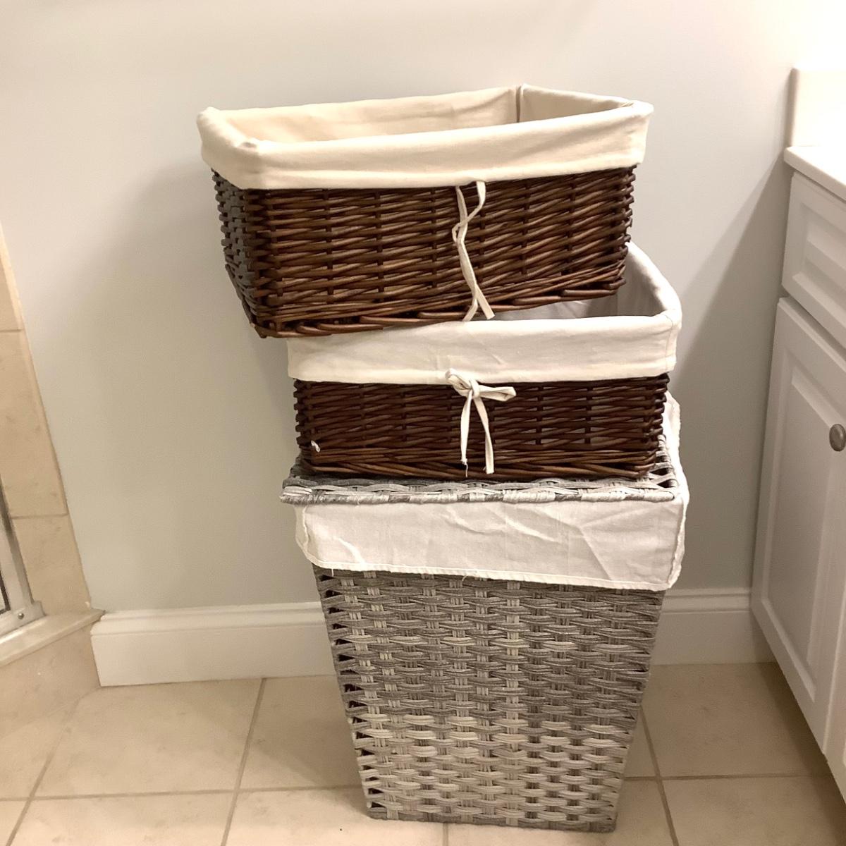 Basket hamper is 17" wide x 12" d x 21" high, the 2 smaller baskets are 17" x 13" x 8".