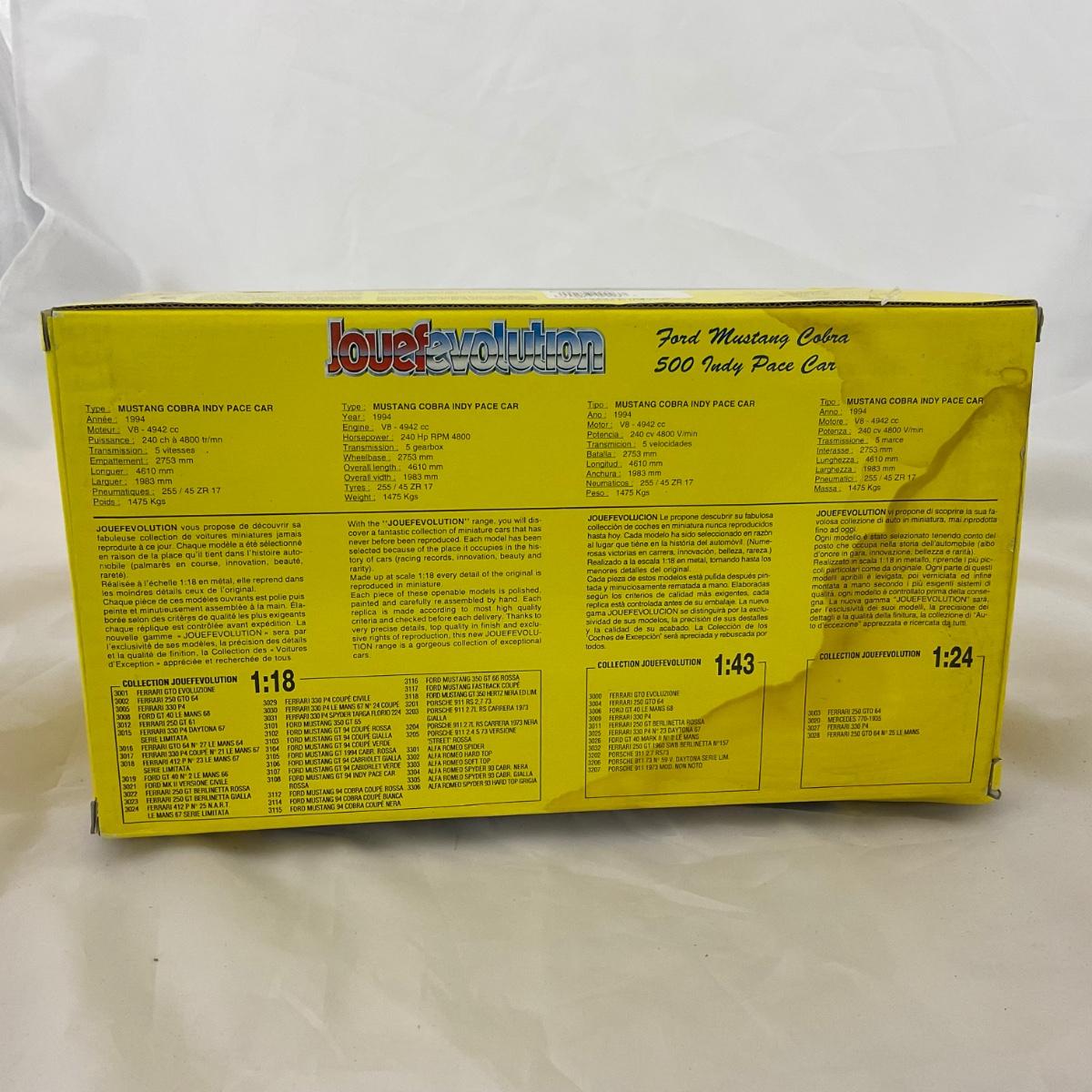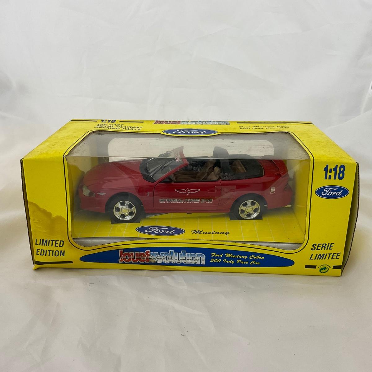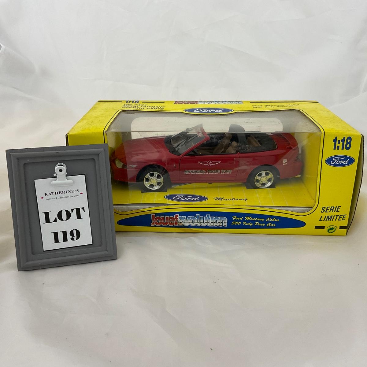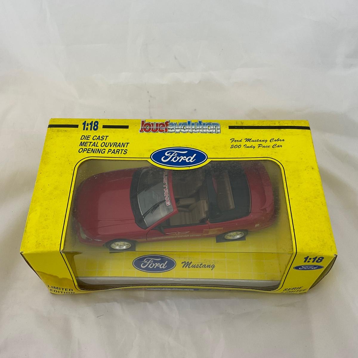 One die cast 1:18 scale Ford Mustang Cobra 500 Indy Pace Car in box. Box has some stuck on dirt and has some damage. Please see photos for details and condition. ::: Shipping is available on this lot. If you require shipping you must let us know at the close of the auction. We will coordinate with you after the item has been won. Shipping fees will include insurance up to or exceeding the value of all items being mailed. If you have any questions regarding this lot please contact the auctioneer either via this website, by direct email or by phone. PICK UP TIMES and other important information can be found in the TERMS and DESCRIPTION of the auction. Please take a look for pertinent information. Thanks!