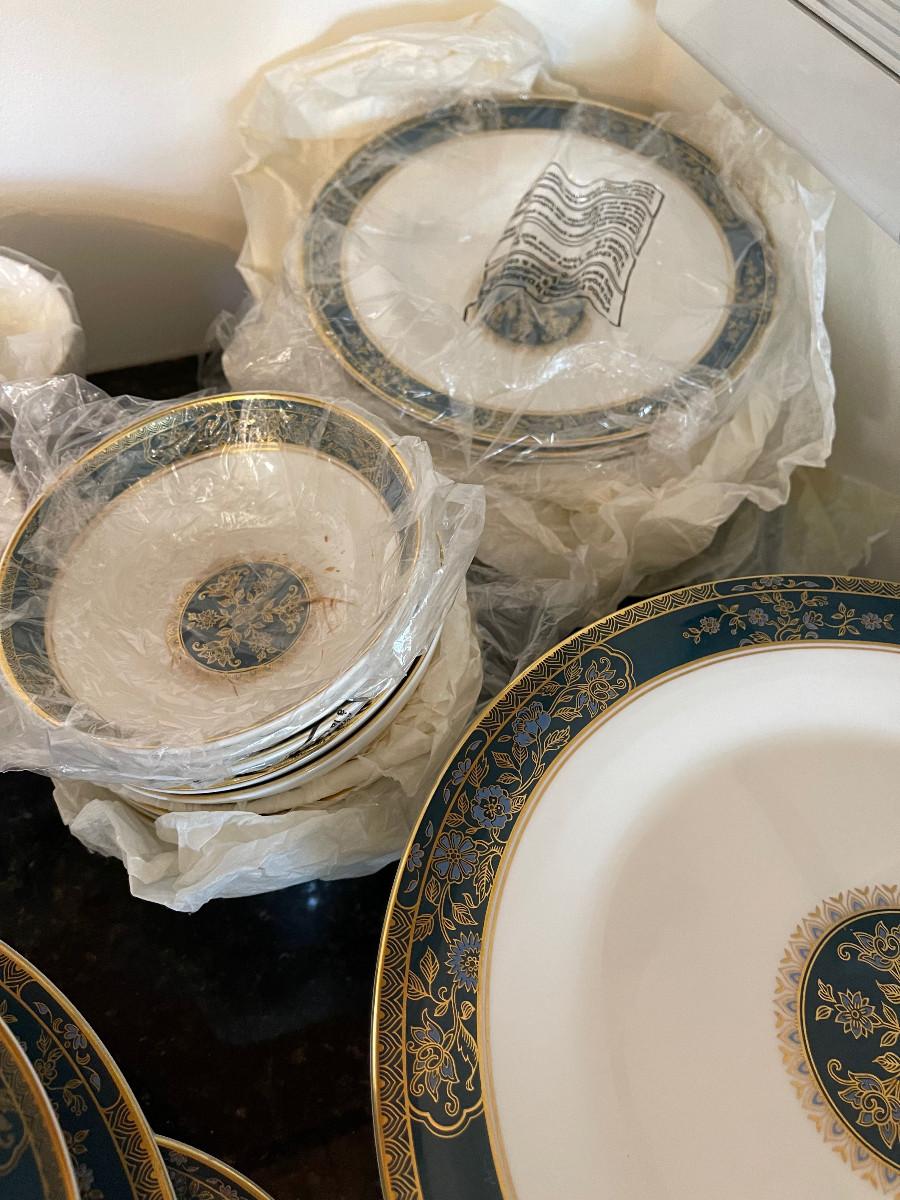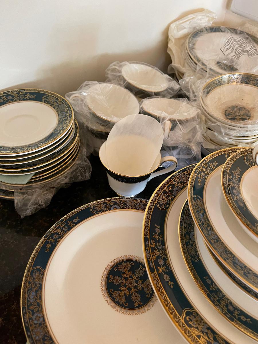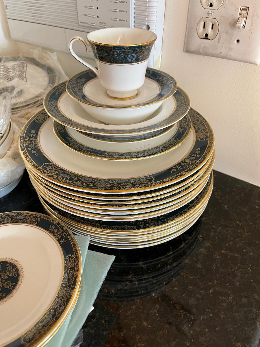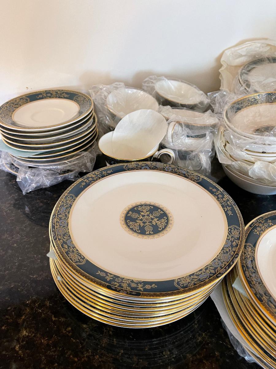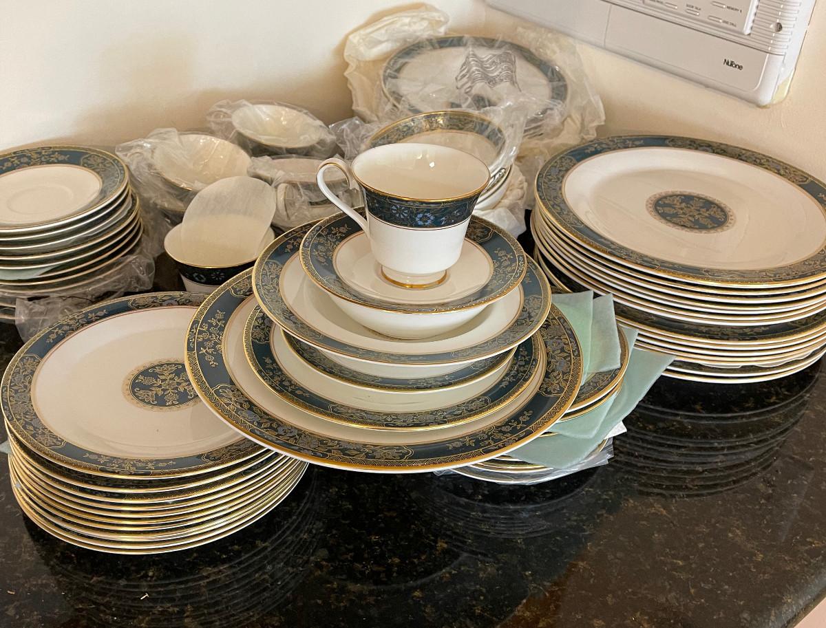 China is in excellent lightly used condition with some pieces that have never been used. Set contains 15 Dinner plate, 12 saucers, 8 cups, 12 salad plates, 12 bread & butter plates, 12 soup bowls, 12 dessert bowls.