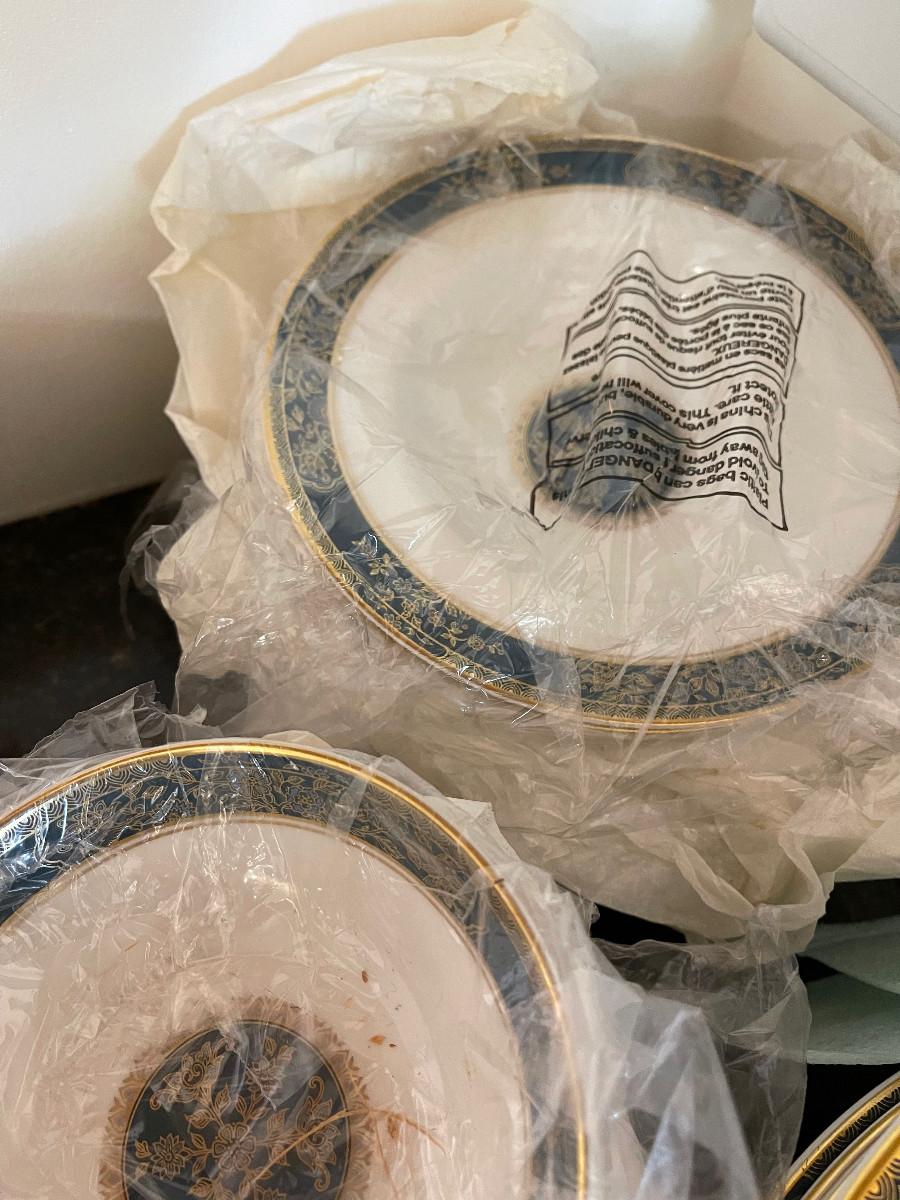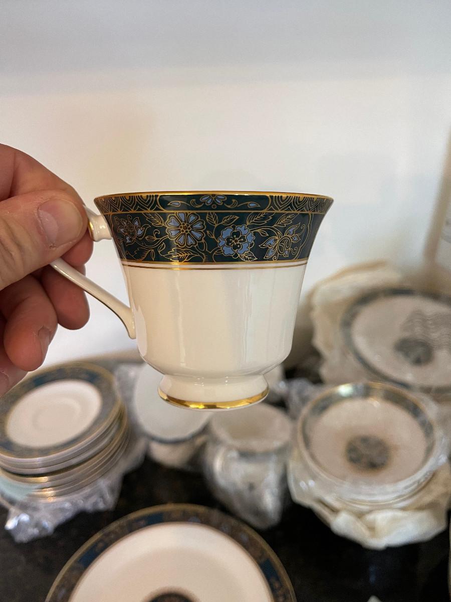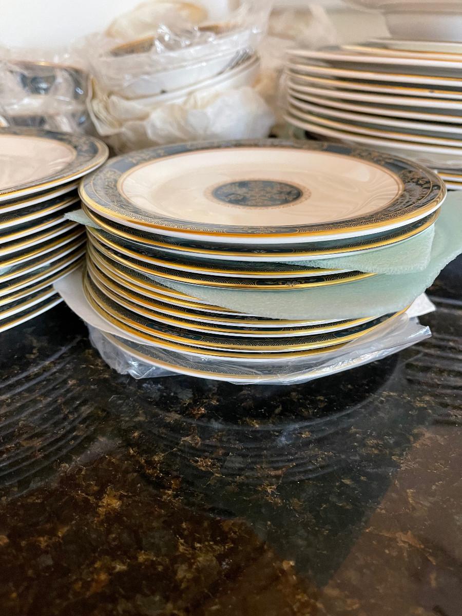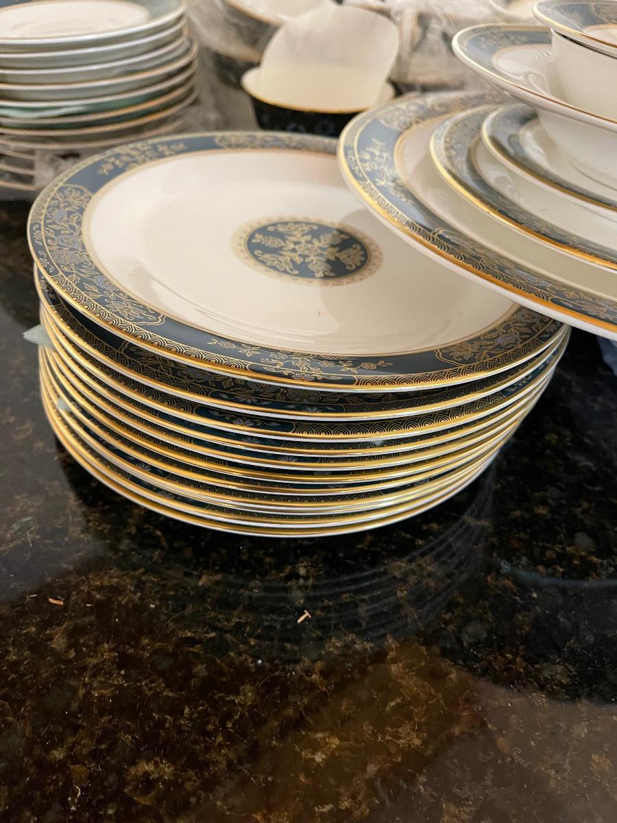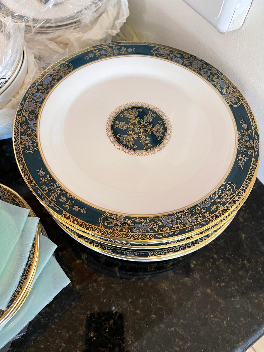 China is in excellent lightly used condition with some pieces that have never been used. Set contains 15 Dinner plate, 12 saucers, 8 cups, 12 salad plates, 12 bread & butter plates, 12 soup bowls, 12 dessert bowls.