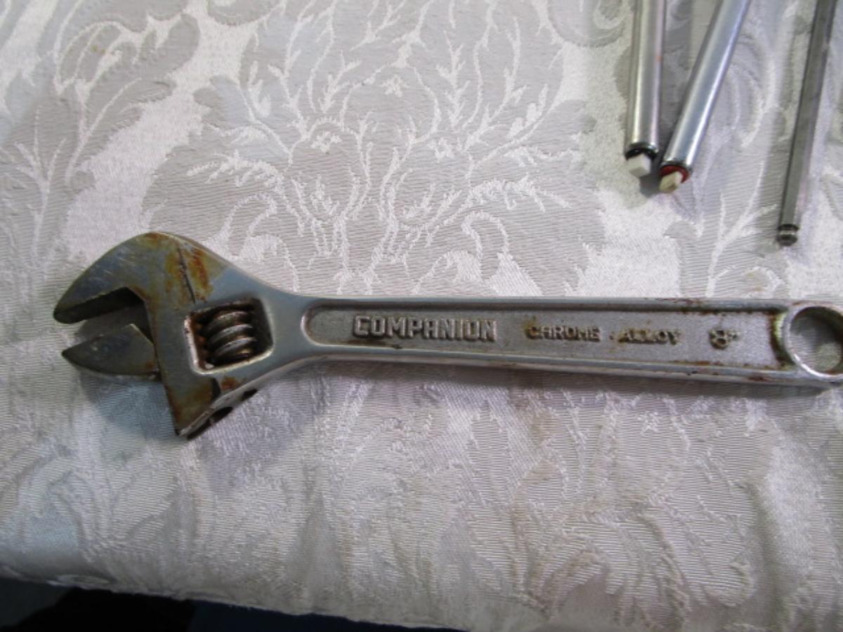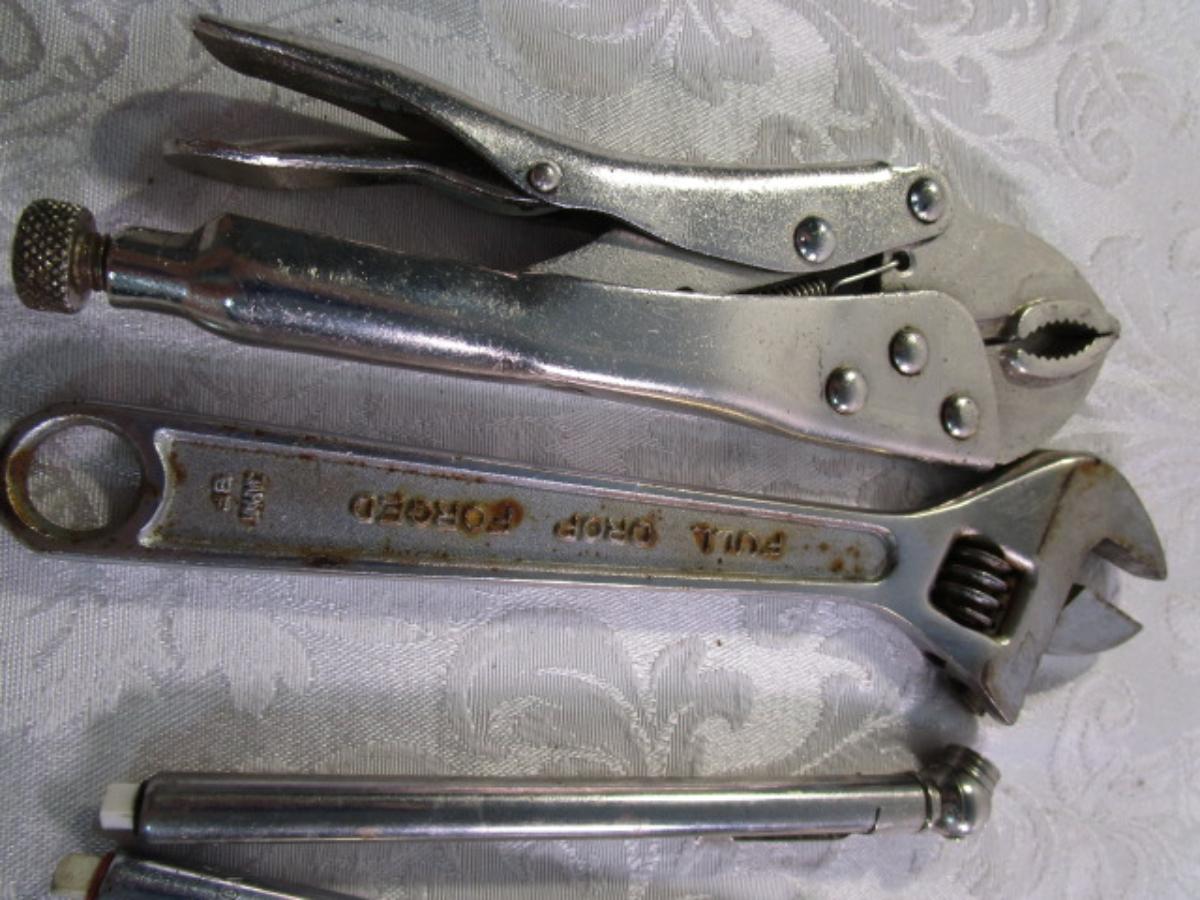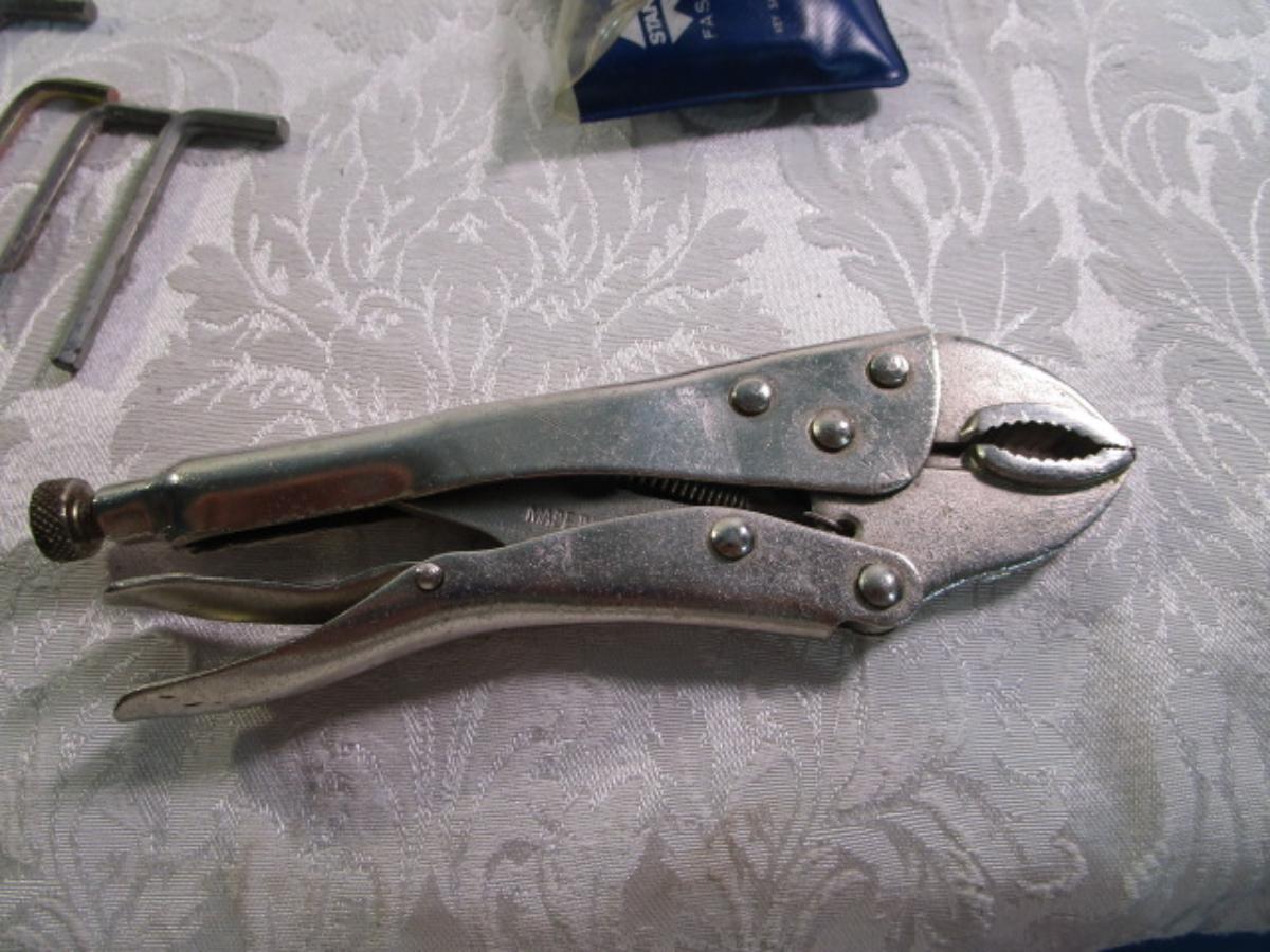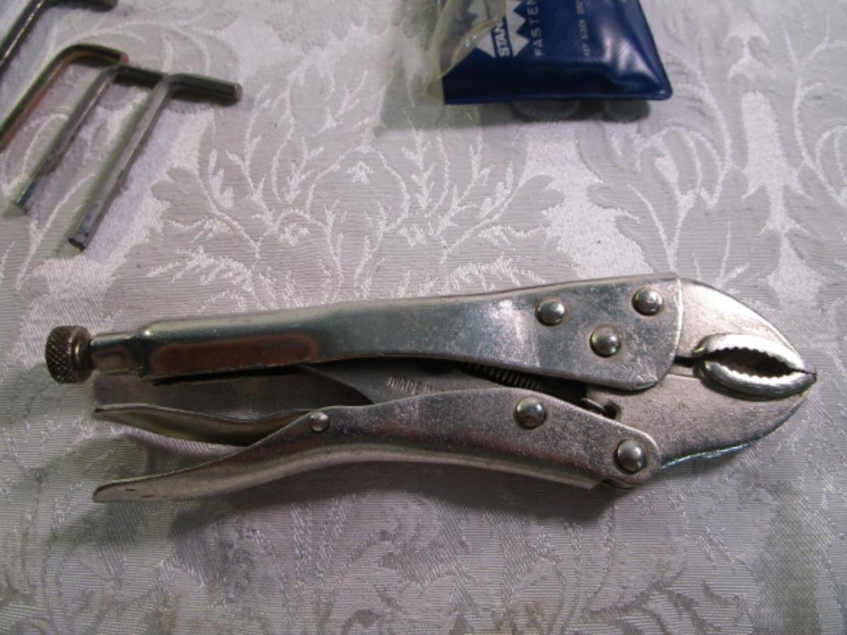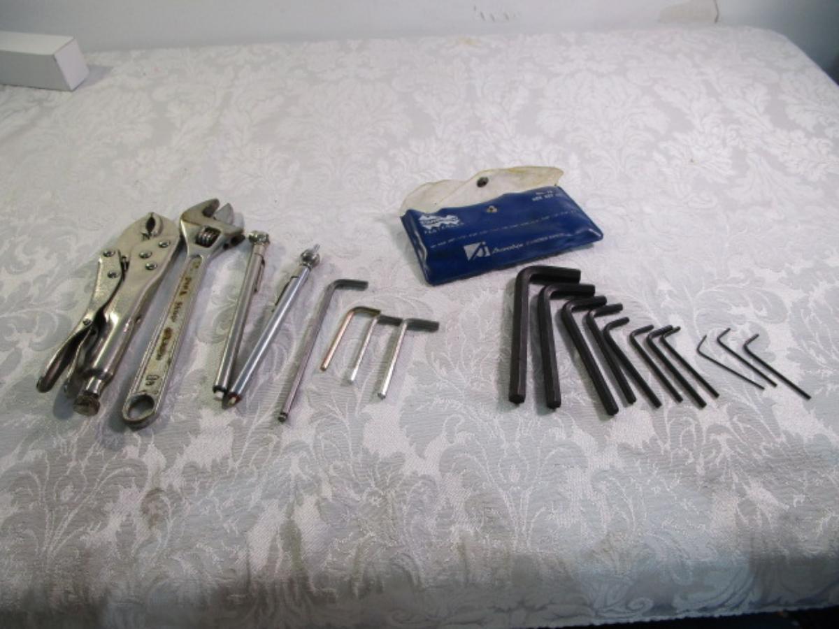 11-Hex key set & extra hex keys, adjustable wrench, vice grips, 3 tire guages