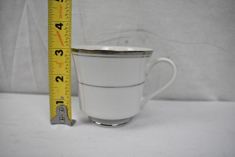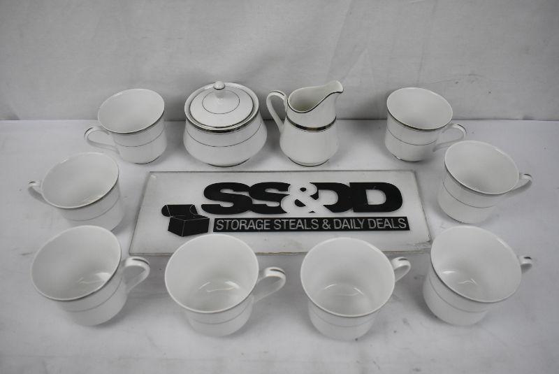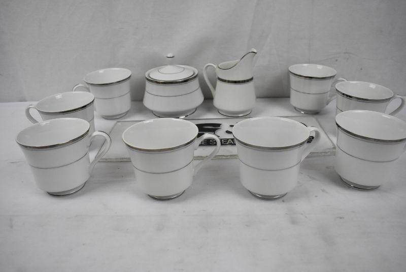 11 pc Tea Set, White & Silver: 8 Cups, 1 Creamer, 1 Sugar with Lid. Wallace Heritage Fine Porcelain China Newport Japan