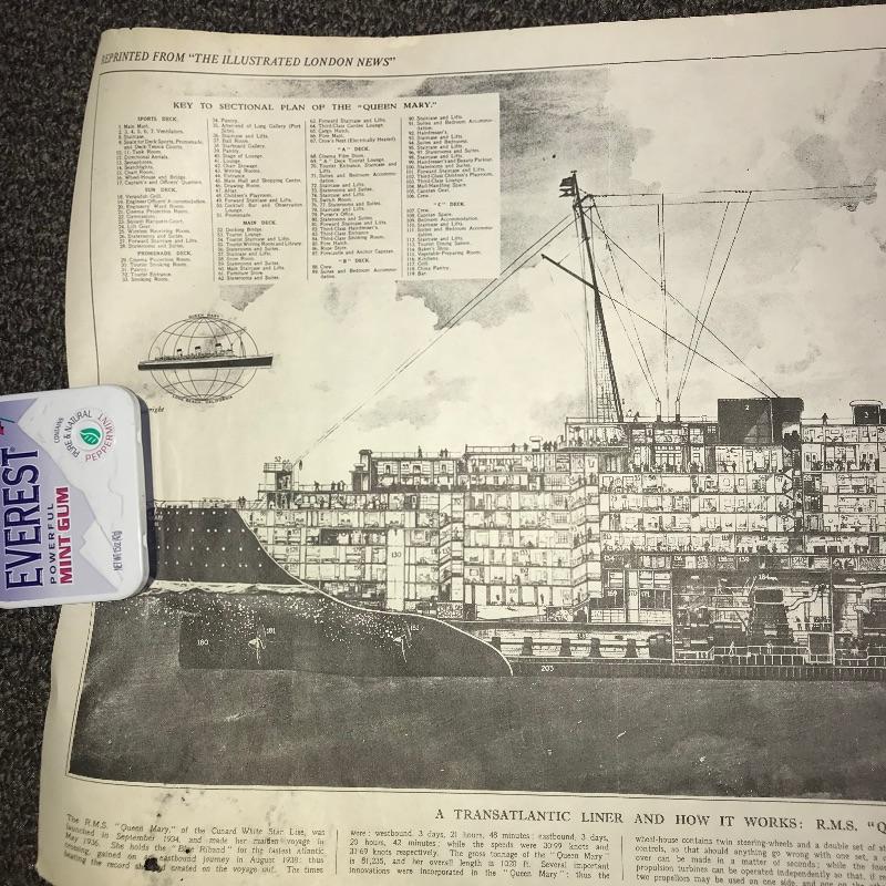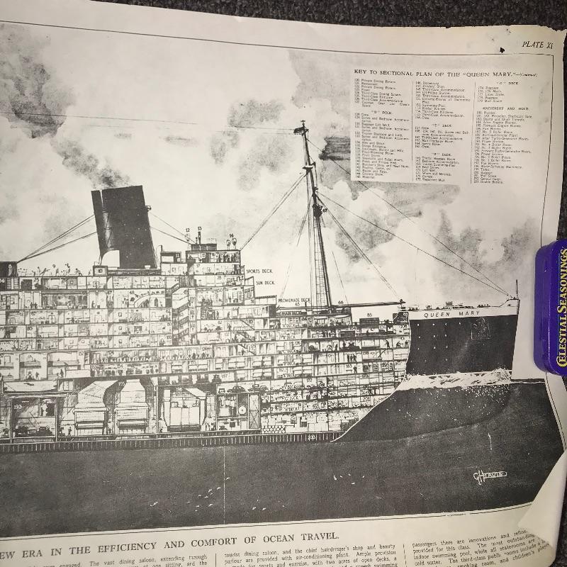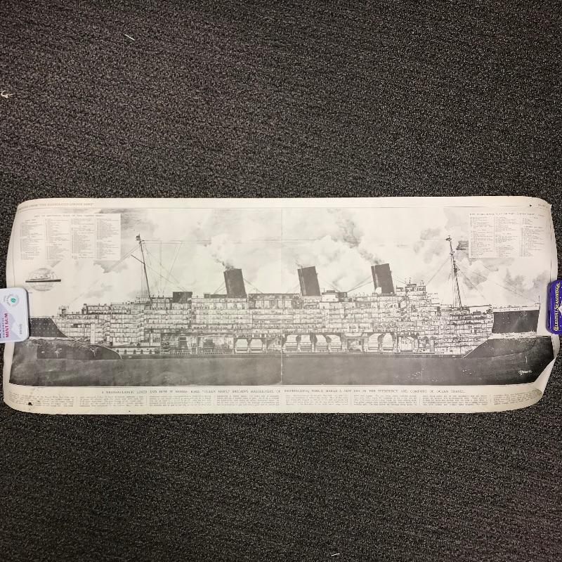 Up for auction is one 11“ x 33“ sectional chart of the RMS Queen Mary. It features a large cutaway diagram of the ship with annotations, and an article of the history of the vessel on the bottom. The chart states that it has been reprinted from The Illustrated London News. This comes rolled-up.