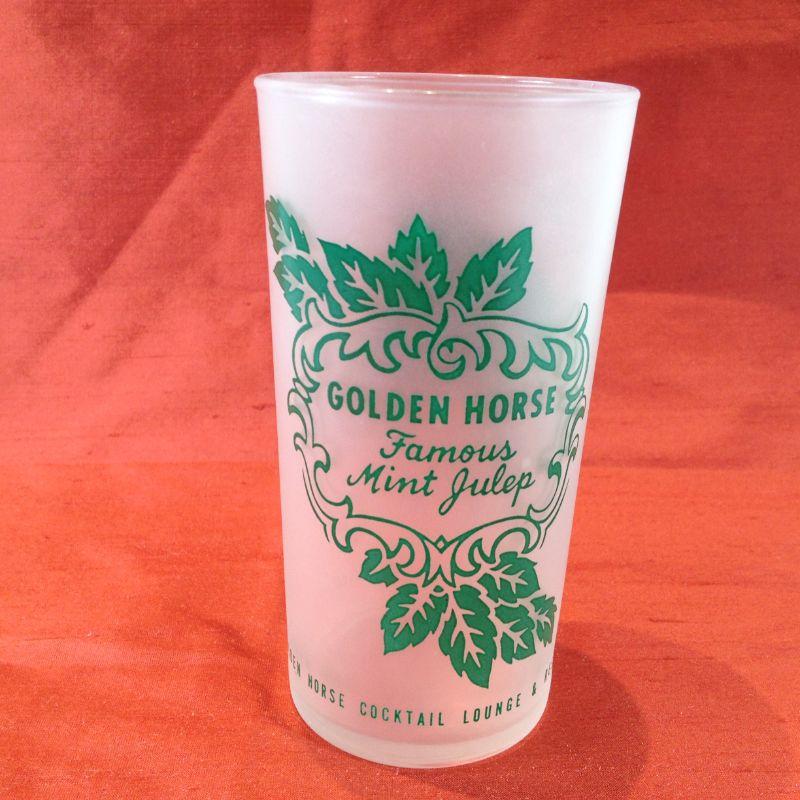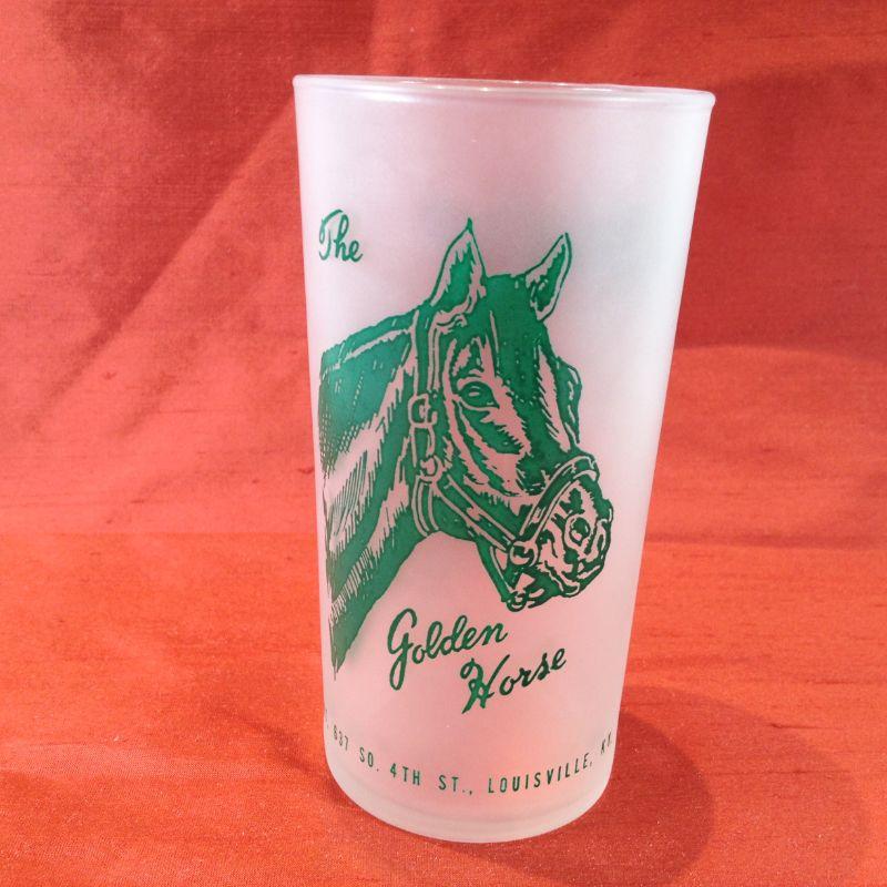The Golden Horse Lounge and Restaurant was a quasi-famous Louisville landmark frequented by locals and visitors during the 1950 - 70s. It was located at 637 South 4th Street and was distinct as it had a large gold horse statue atop its entrance. It was said to have produced a mean Mint Julep Cocktail and is noted in its later years for being one of the first such facilities to openly welcome a gay/lesbian clientele. The glass measures about 5-inches tall X 2.5-inches in diameter. It is nicely frosted and the green screening is in excellent condition. Made by Federal Glass Company. Reserve/Starting Bid is $10.