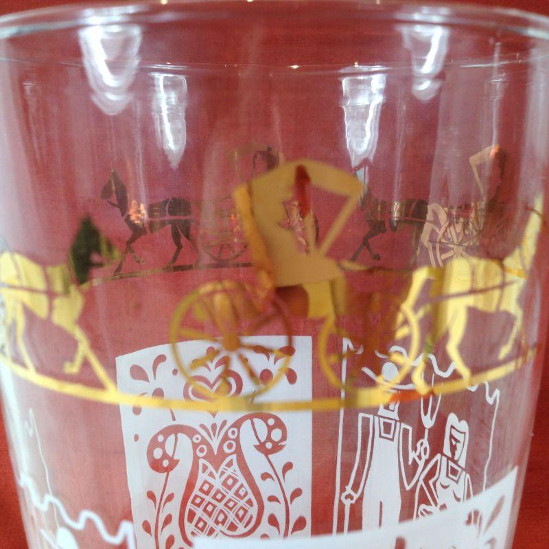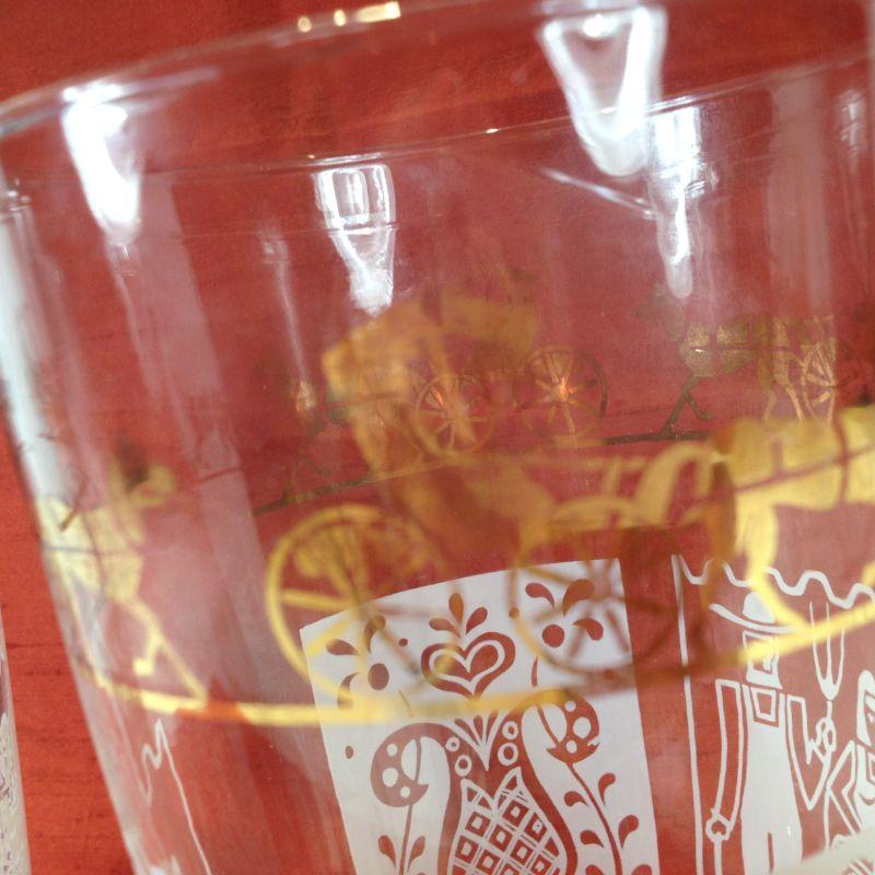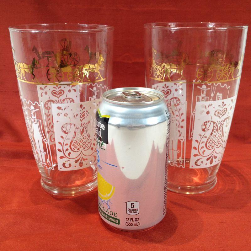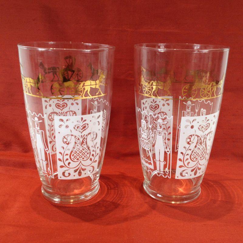 This lot is for a pair of clear glass, farmer pattern Giant Glasses or Vases. One of the pieces has some dimming on the upper gold screen print of the design, the second glass is in pristine condition. Use them for a massive iced tea or fill with your garden flower boutique.