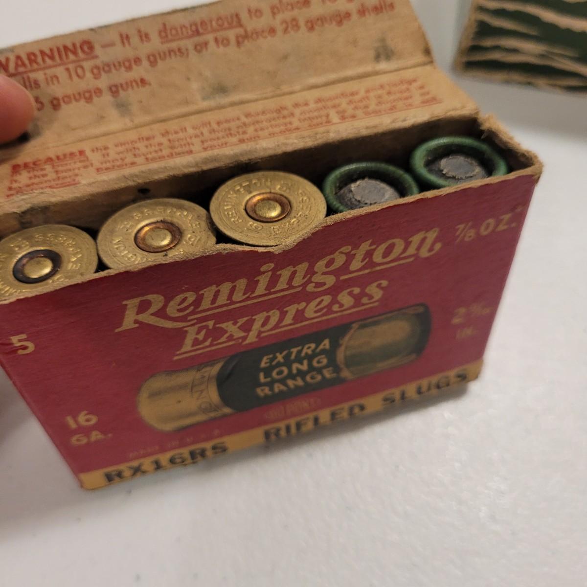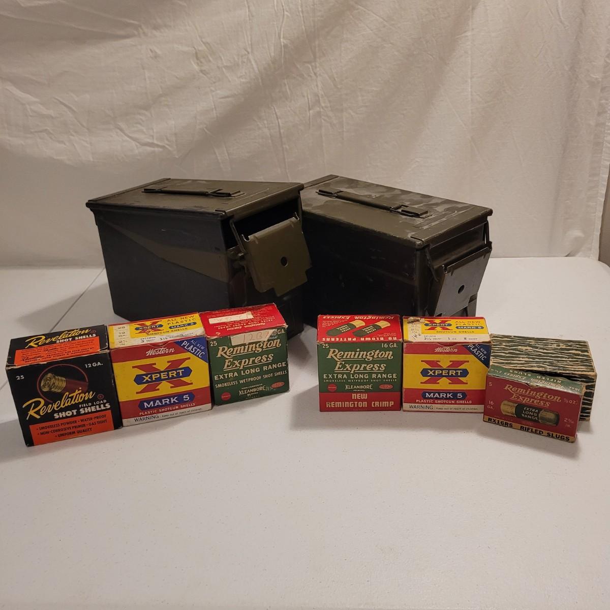 This lot includes opened and unopened boxes of 12 and 16 gauge shotgun shells and two metal ammo boxes. There are approximately 60 16-gauge rounds and 75 12-gauge rounds of varying types and brands. This ammunition is dated and will likely need inspection before firing. Also included are two metal ammo boxes. These boxes are older but fully functional and perfect for storing ammunition.