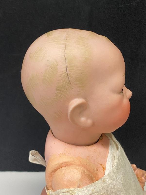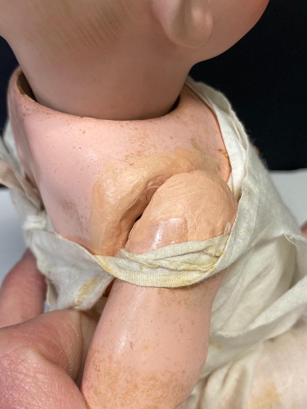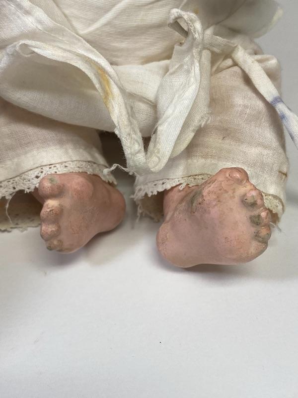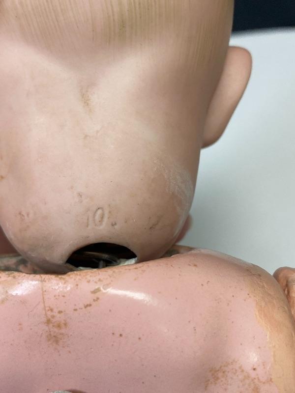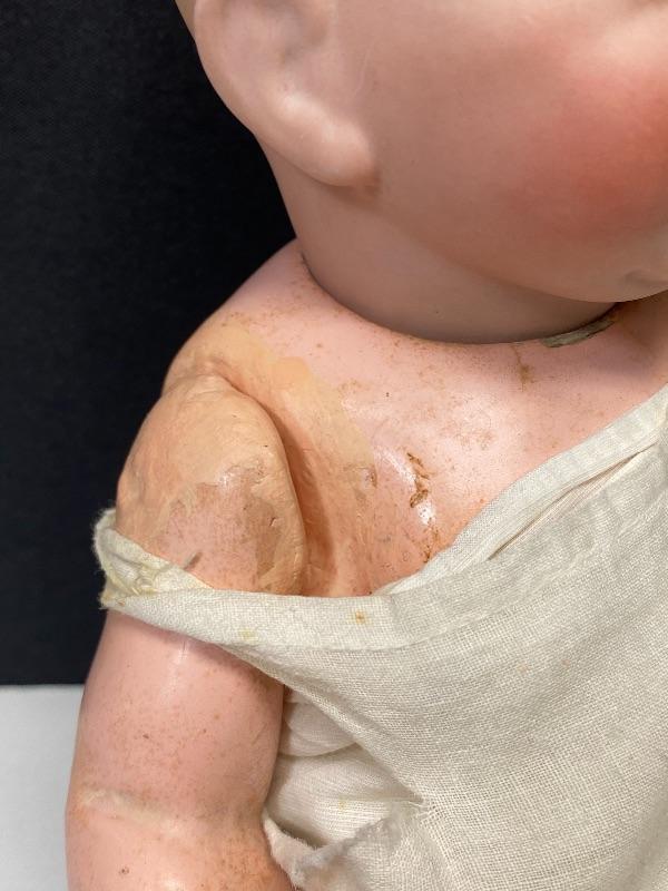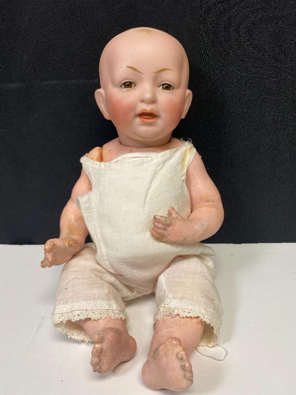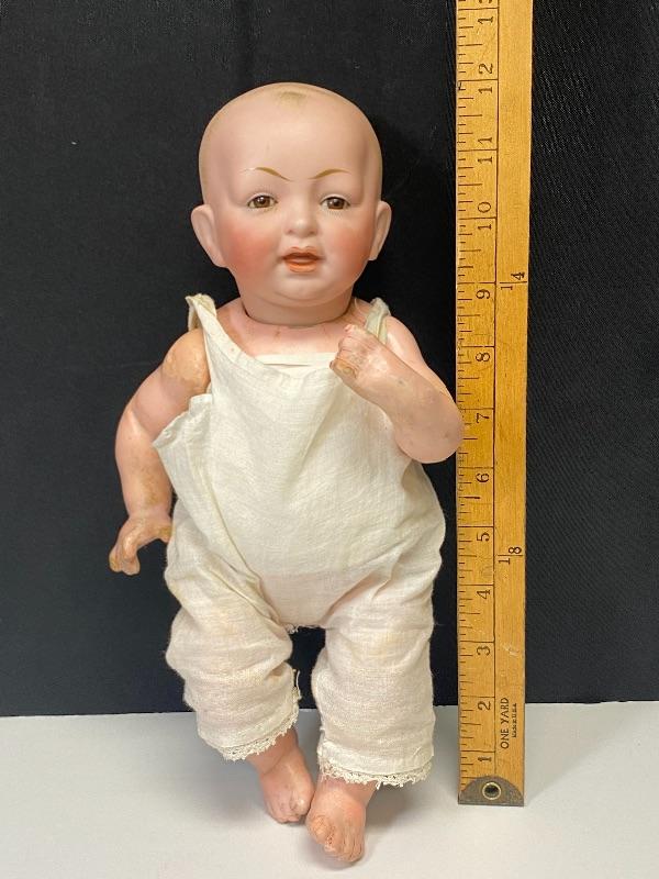 Antique 12" baby doll. Porcelain head with composite body. Only marking found is the number 10 on the back of neck. Brown glass eyes. Composite body is jointed at limbs, has some wear. Looks like someone may have tried to repainted damaged areas of the composite. Composite is speckled in places as well.