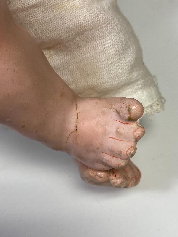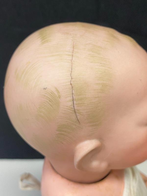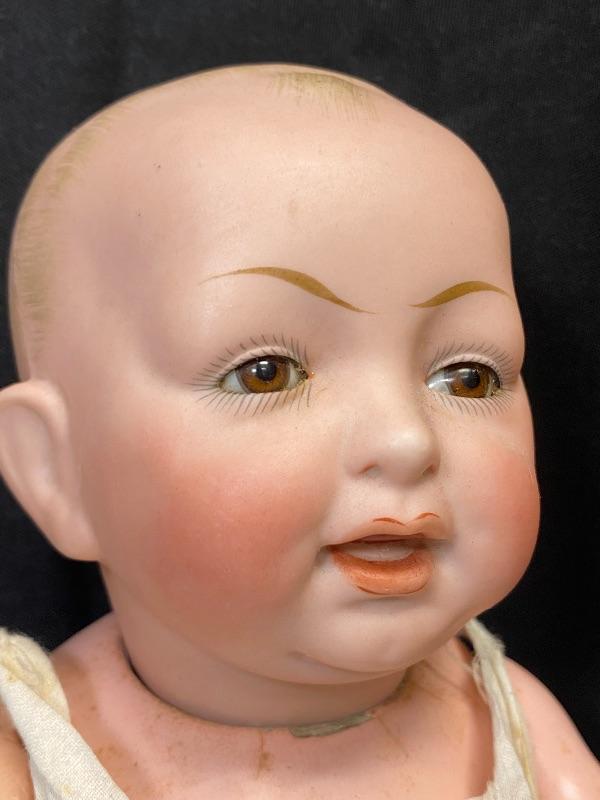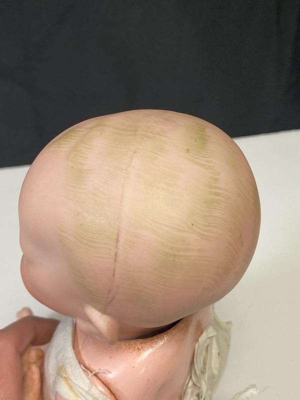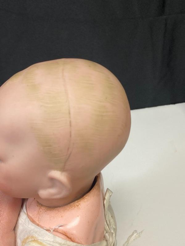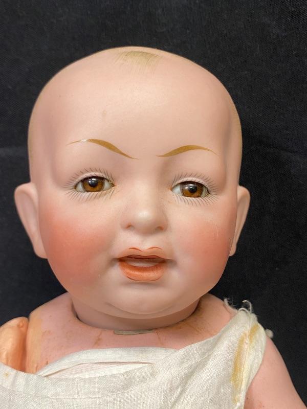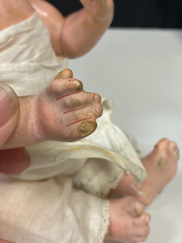 Antique 12" baby doll. Porcelain head with composite body. Only marking found is the number 10 on the back of neck. Brown glass eyes. Composite body is jointed at limbs, has some wear. Looks like someone may have tried to repainted damaged areas of the composite. Composite is speckled in places as well.