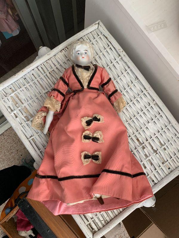 Orange/Pink-ish dress with black trim Old doll RETAIL APPRISAL: $250