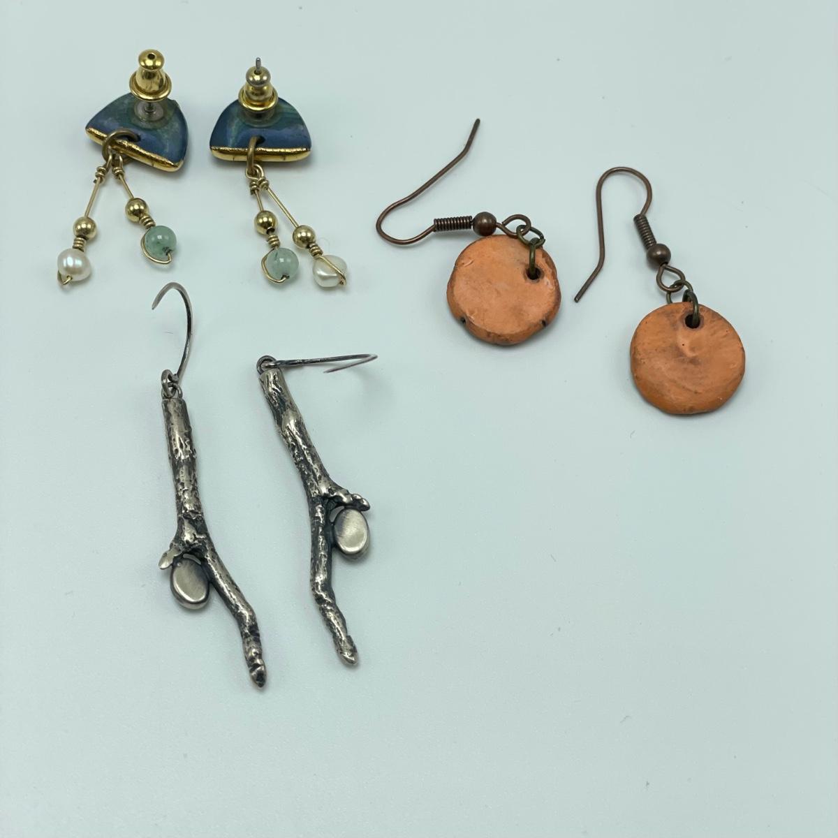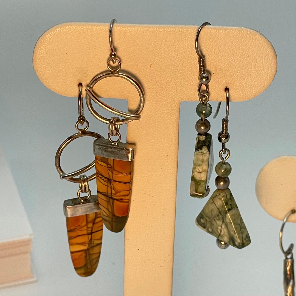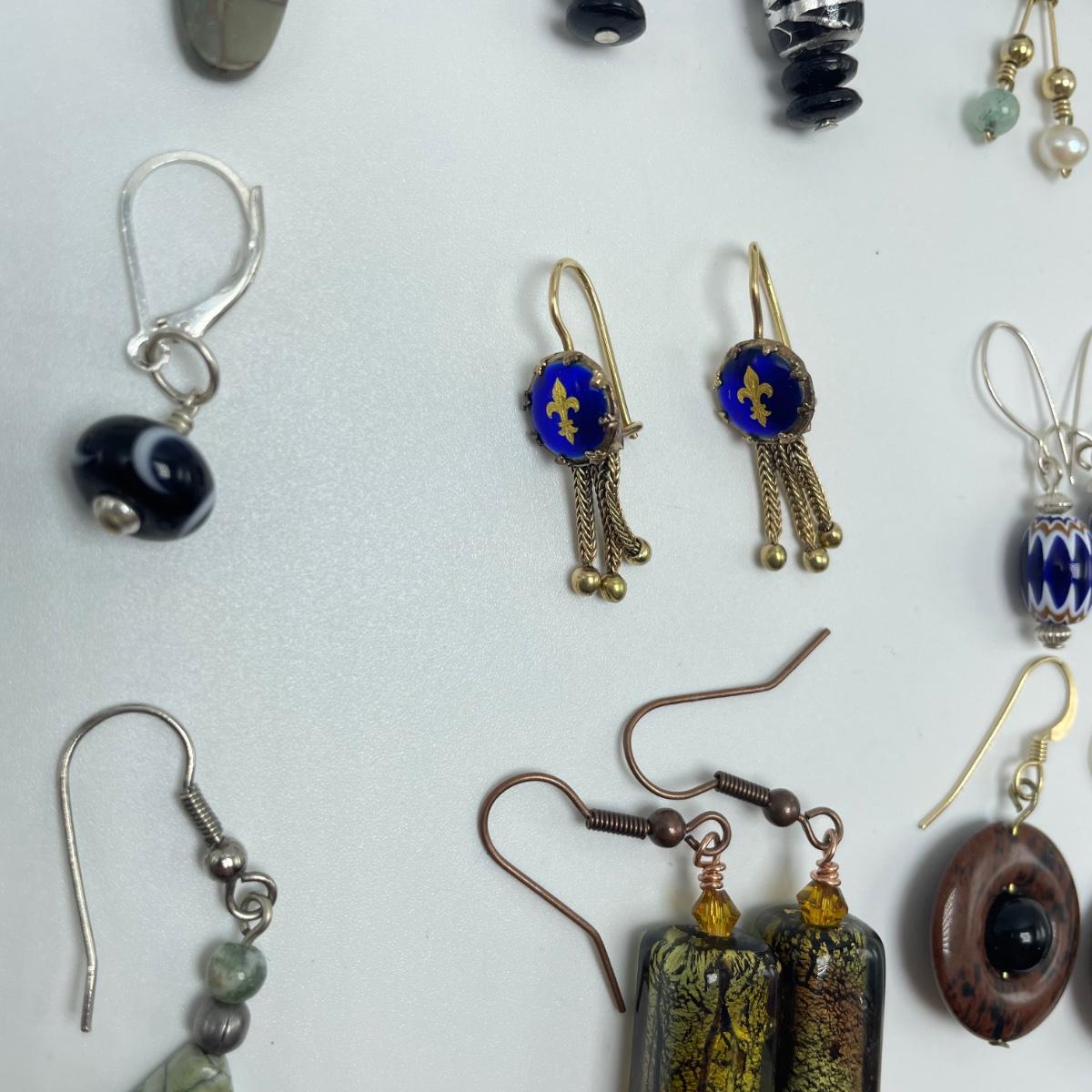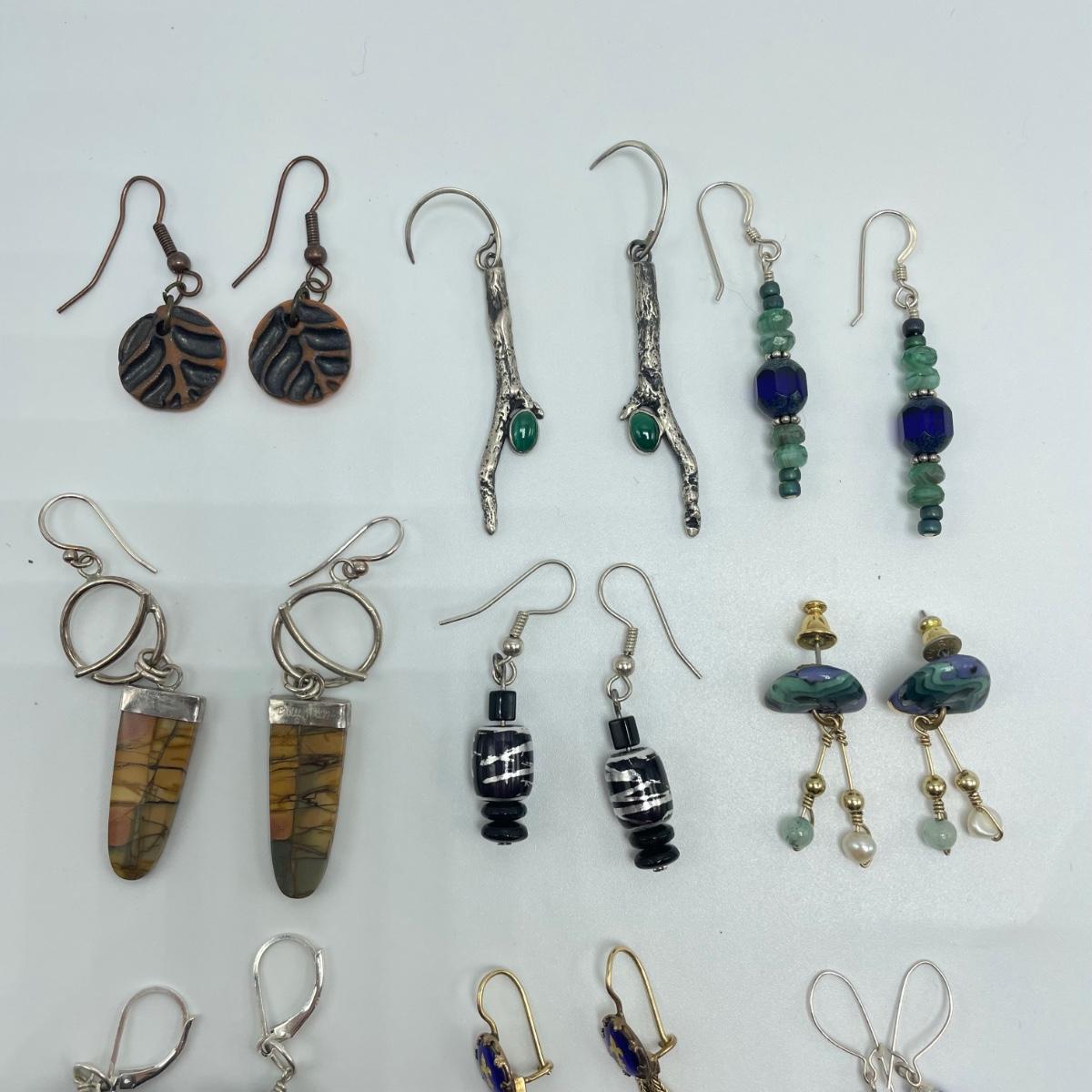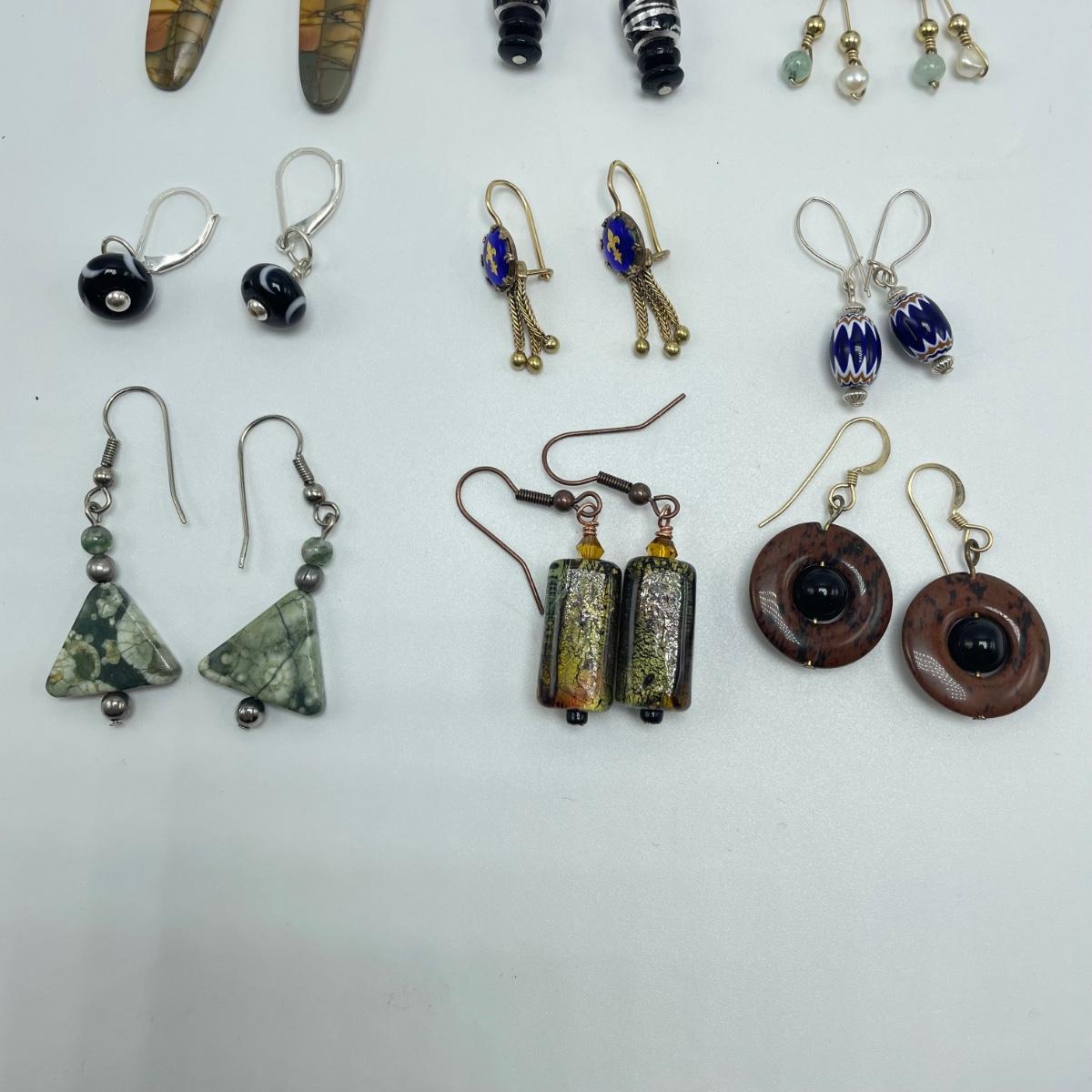Twelve modern pairs of dangle earrings. Materials appear to vary from unmarked silver toned metal, glass, resin, polymer, stones and beads. One silver and stone pair has been signed. See images. We cannot guarantee the authenticity of any gemstone. All sales are final. No returns or refunds. Please bid accordingly.