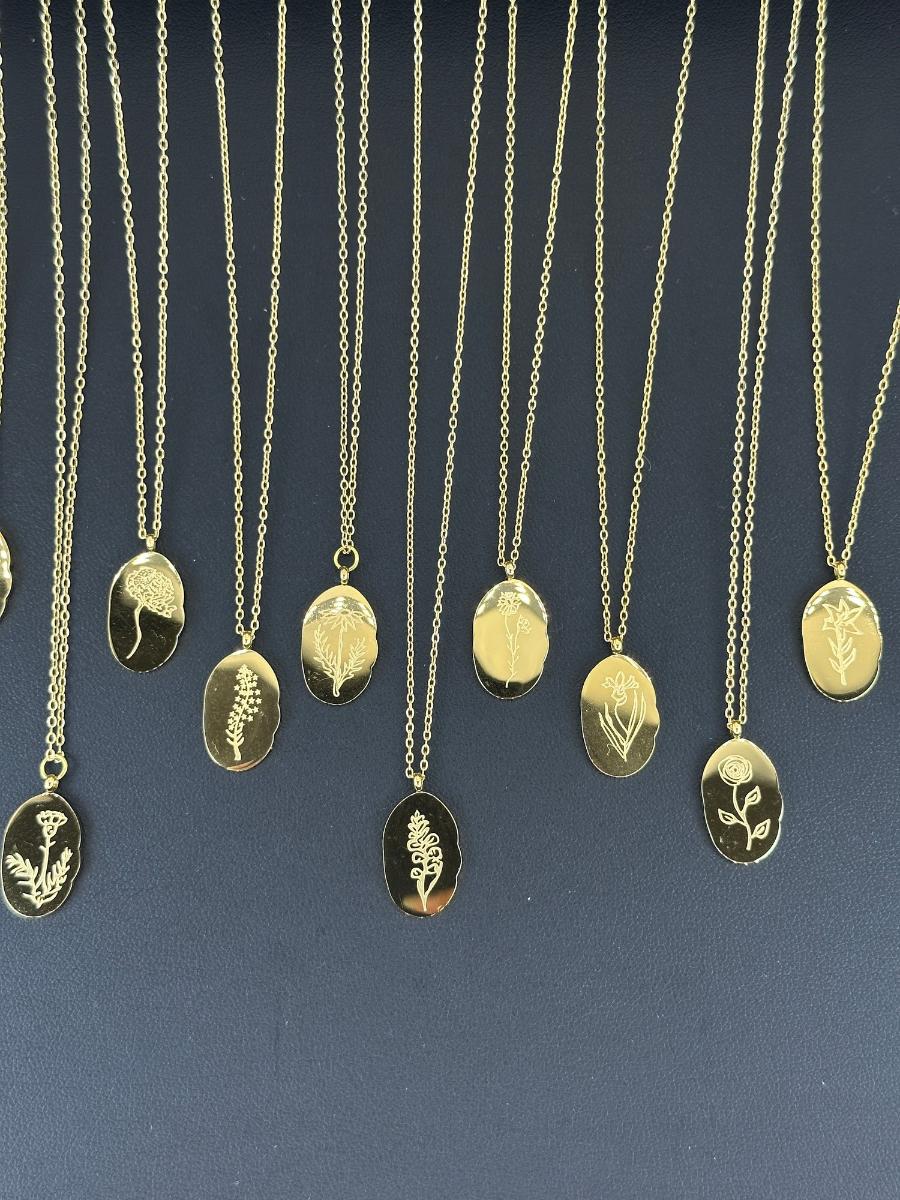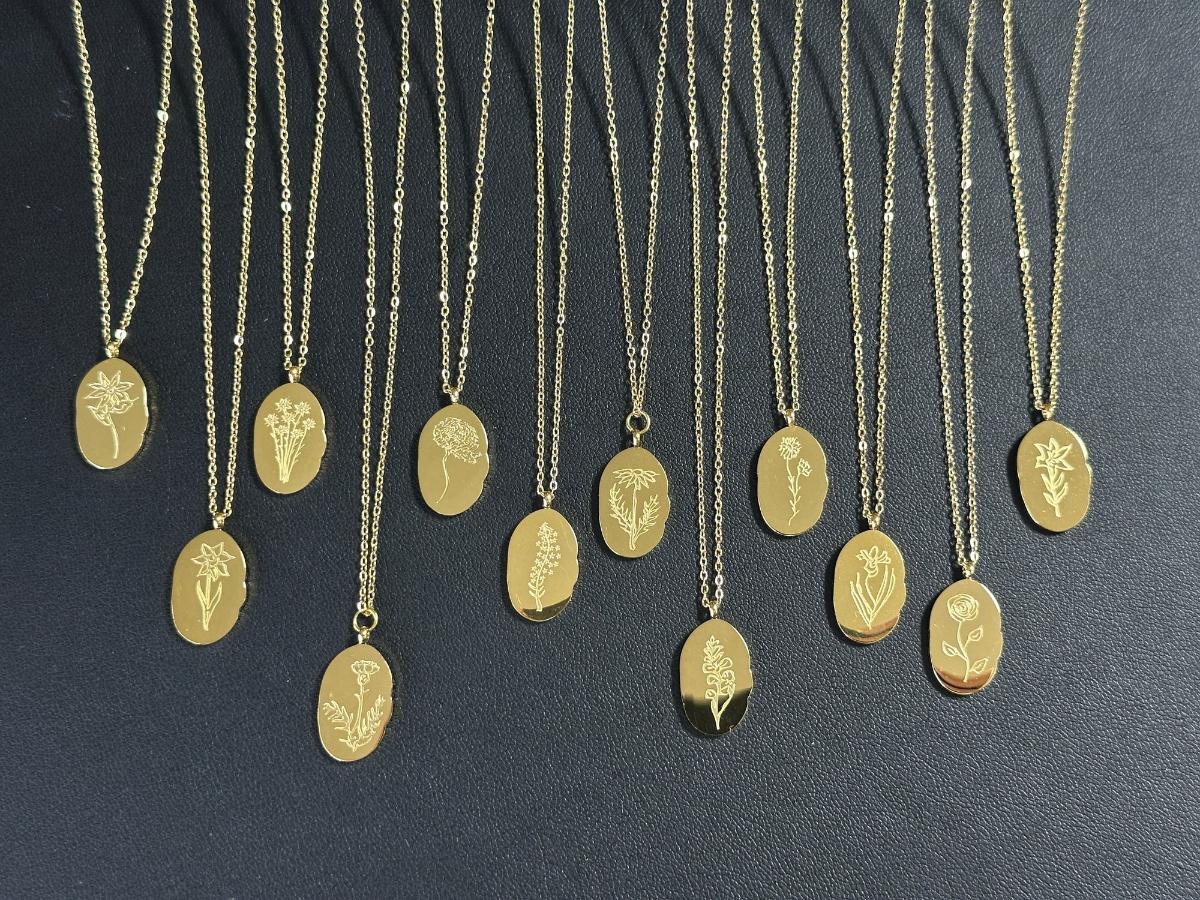 1. Birth Month Flower Collection Necklaces 12 Months. This is not real gold; it is a gold-colored piece matched to an 18K tone.