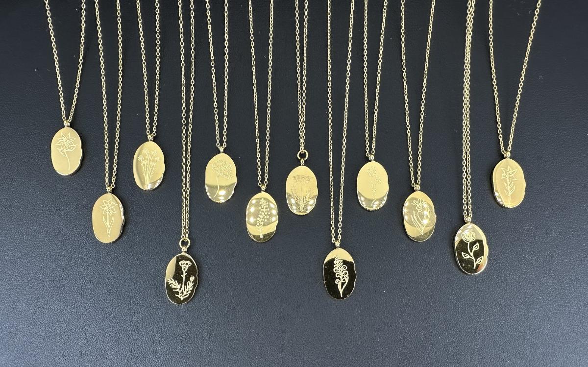1. Birth Month Flower Collection Necklaces 12 Months. This is not real gold; it is a gold-colored piece matched to an 18K tone.