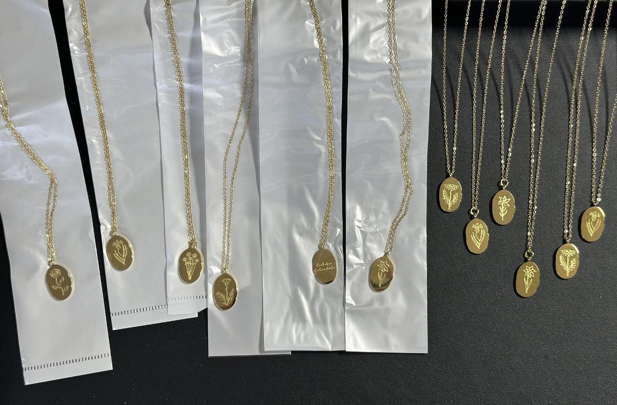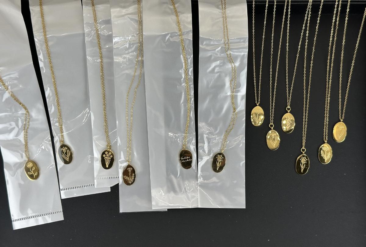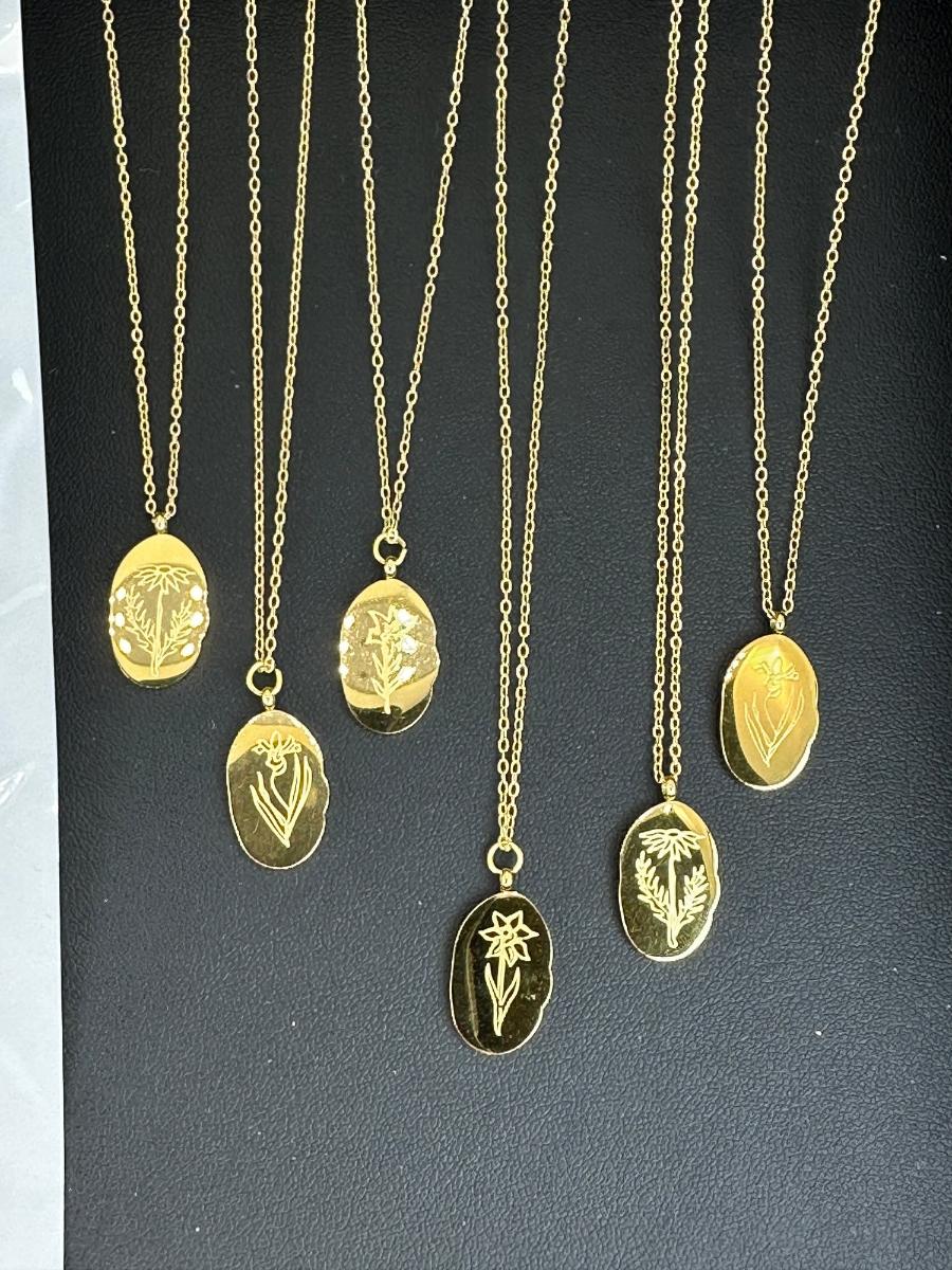 1. Birth Month Flower Collection Necklaces 12 Months MIX LOT. This is not real gold; it is a gold-colored piece matched to an 18K tone.