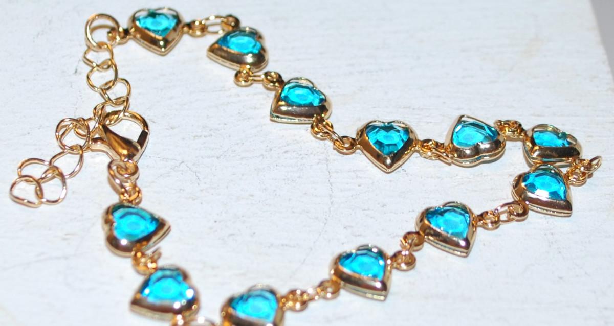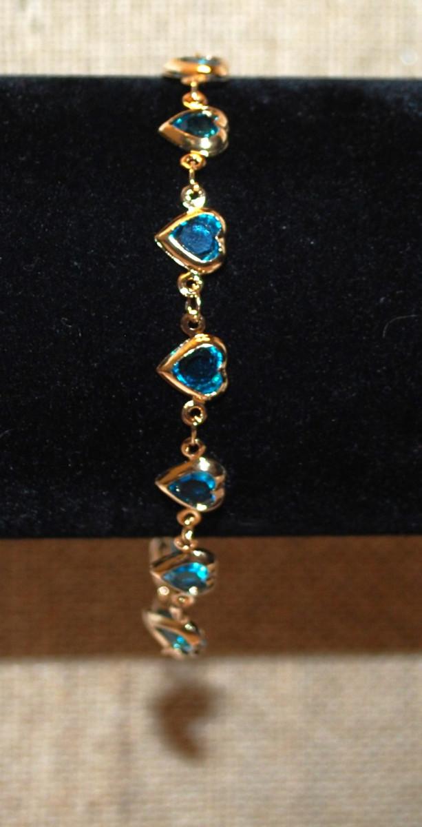12 Blue Hearts Bracelet with Gold Tone Surrounds & Chain 7" Circumference