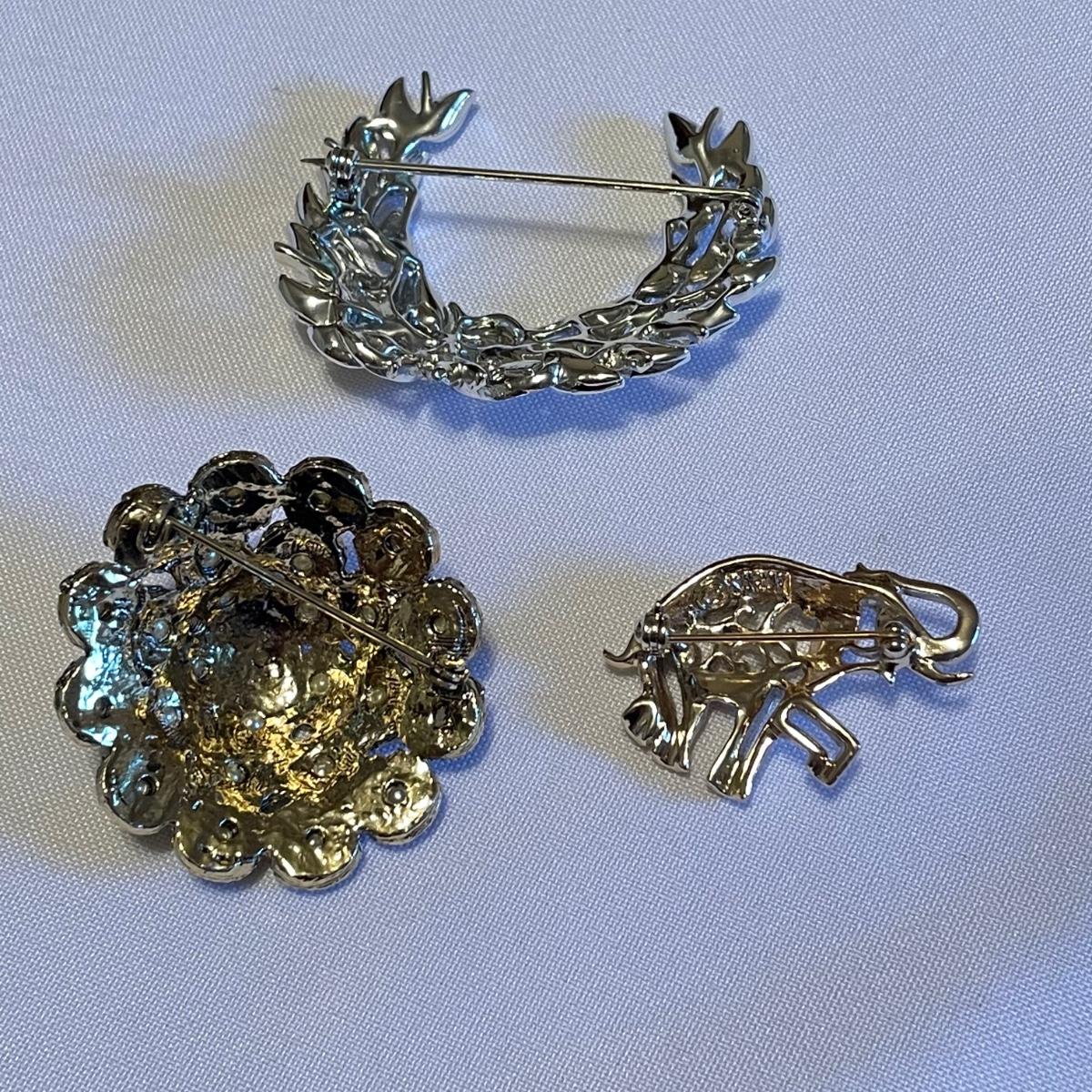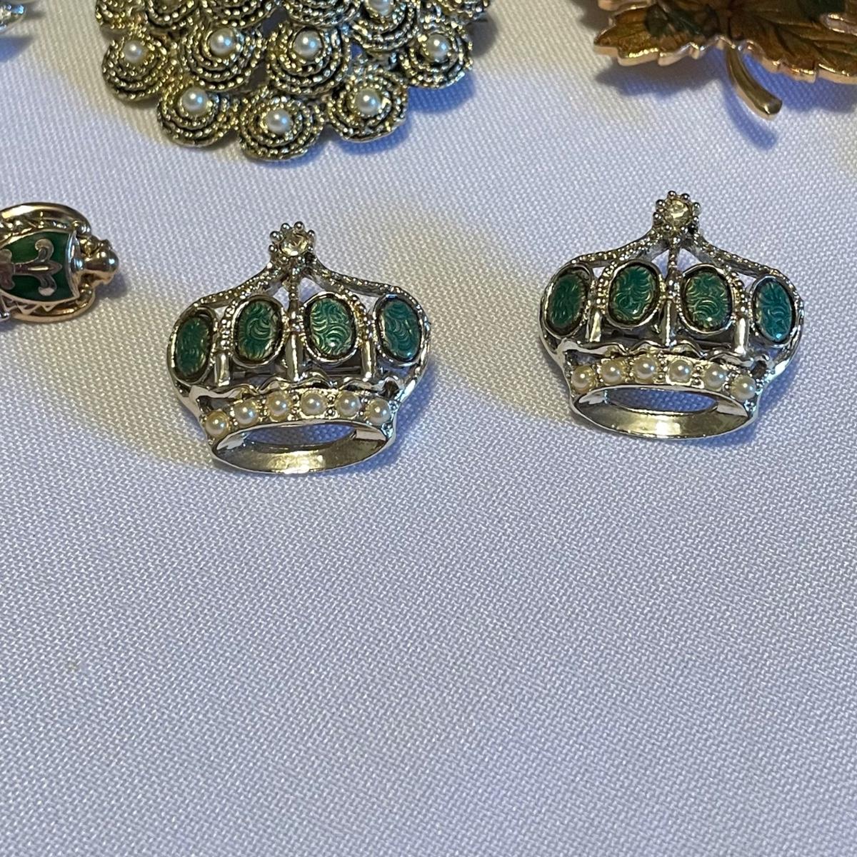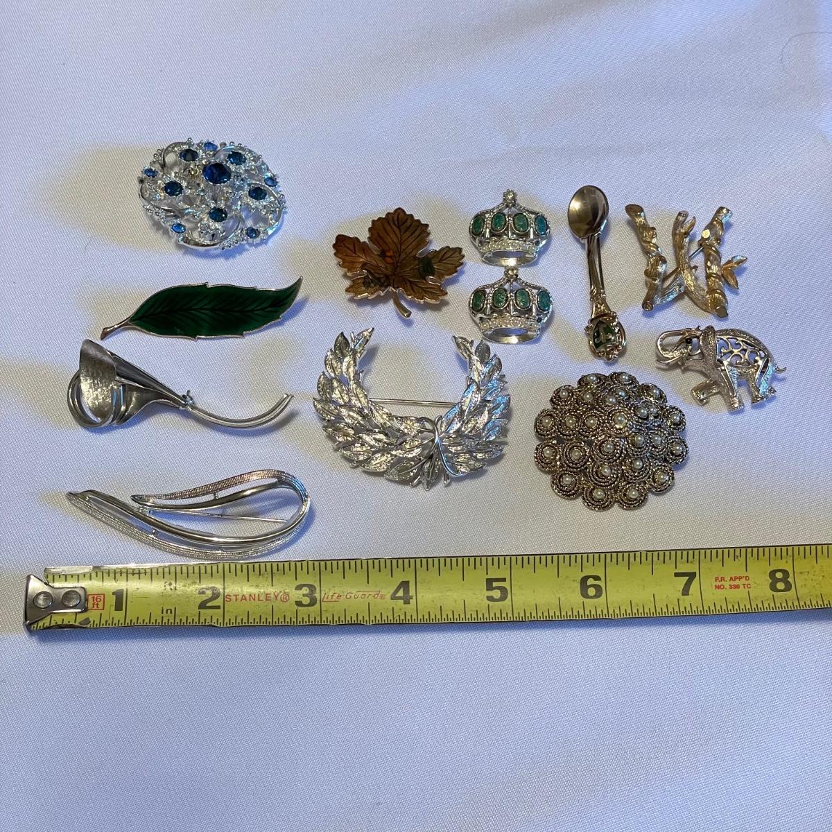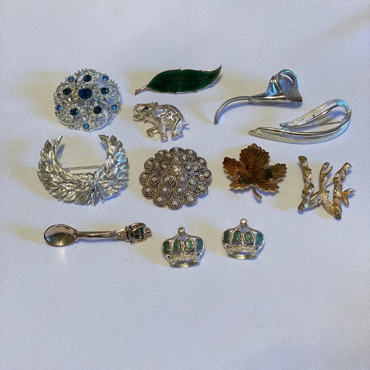 Twelve brooches to make any outfit sparkle and shine. The elephant brooch is marked Sarah, the round, silver colored brooch with blue gems is marked Cora. The two leaf brooches along with the shield on the spoon and green accents on the crowns appear to be enamel. The others are silver or gold colored metal with gems or pearly beads. All appear to be in very nice condition with working pins and latches. See images. Shipping available.