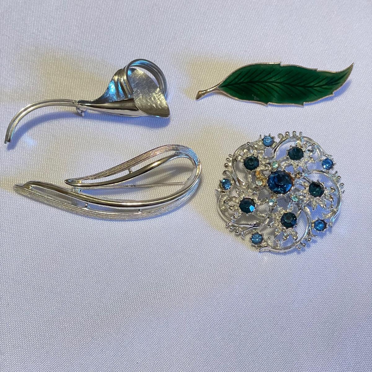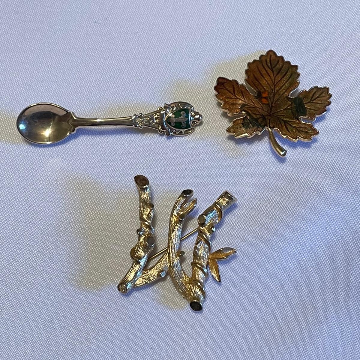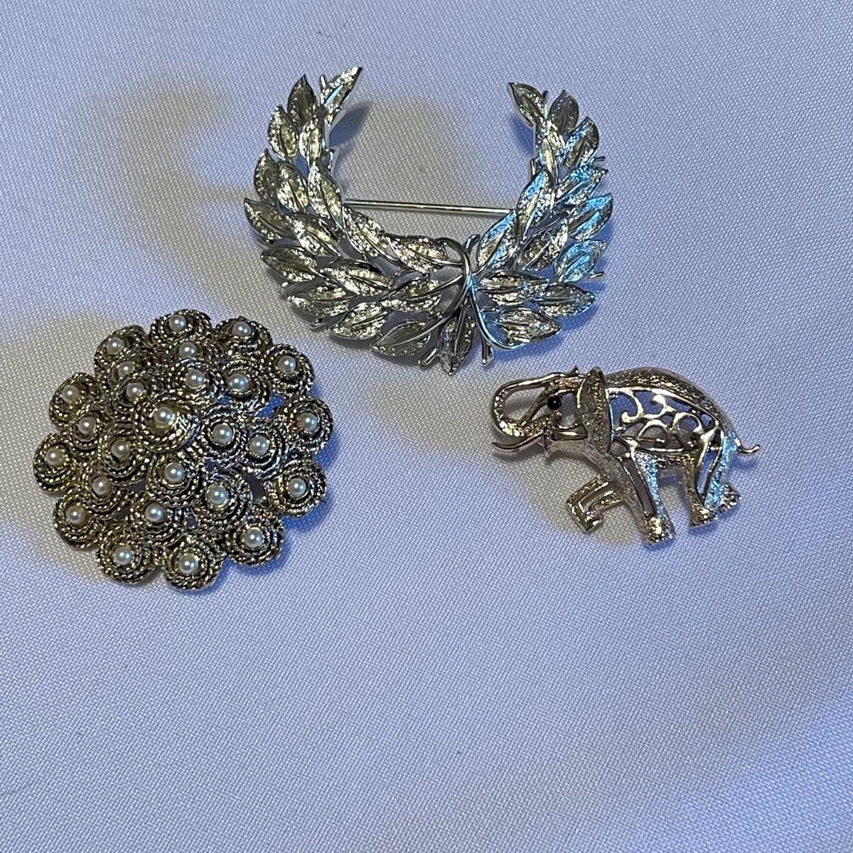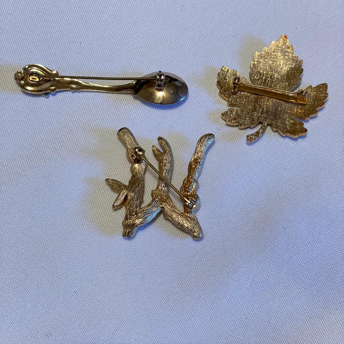 Twelve brooches to make any outfit sparkle and shine. The elephant brooch is marked Sarah, the round, silver colored brooch with blue gems is marked Cora. The two leaf brooches along with the shield on the spoon and green accents on the crowns appear to be enamel. The others are silver or gold colored metal with gems or pearly beads. All appear to be in very nice condition with working pins and latches. See images. Shipping available.