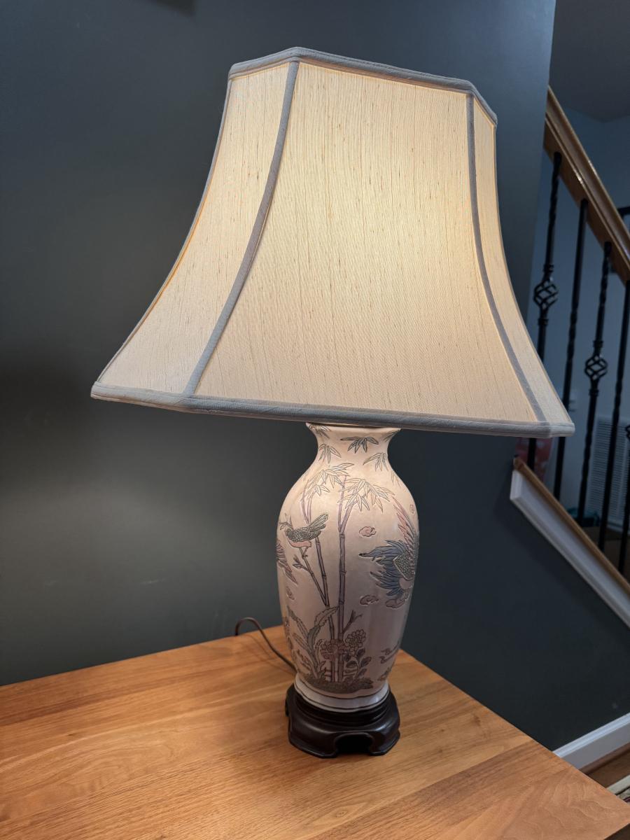 12” Ceramic Table Lamp. Asian Influence with Cranes & Wood Base. Lamp Only.