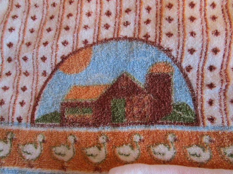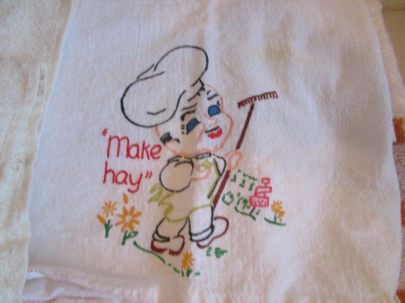 2 new dish towels, 1 embroidered with light stain, 2 other dish towels, 4 napkins