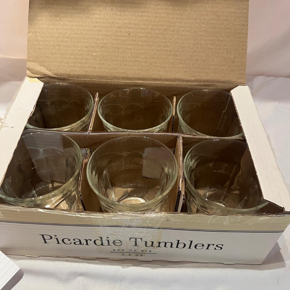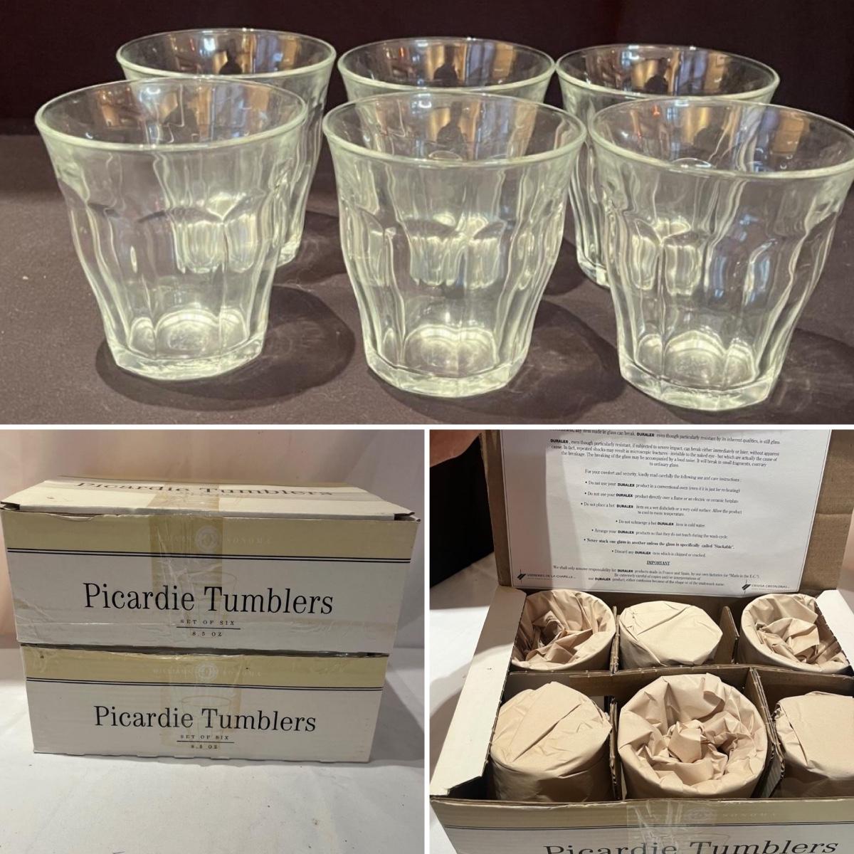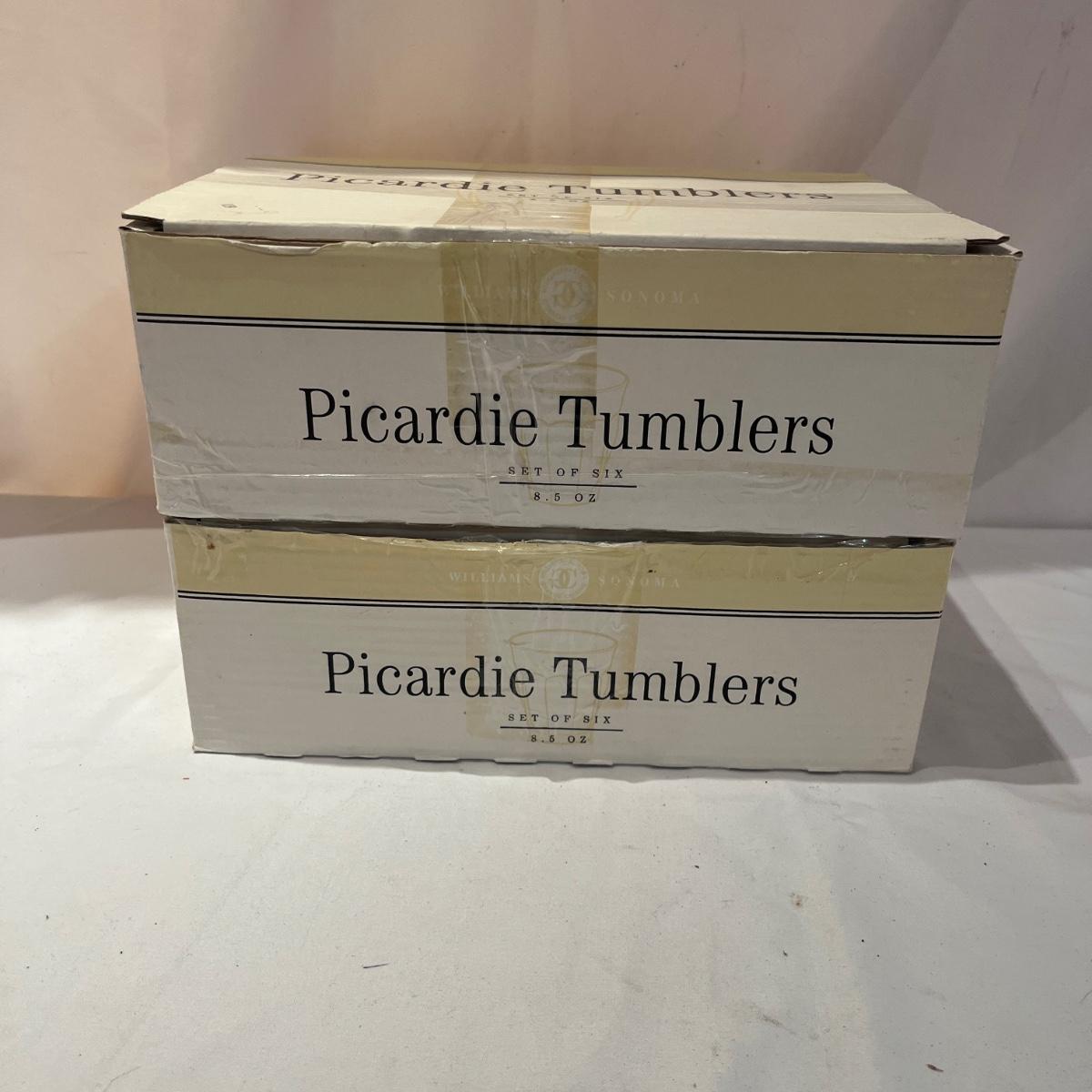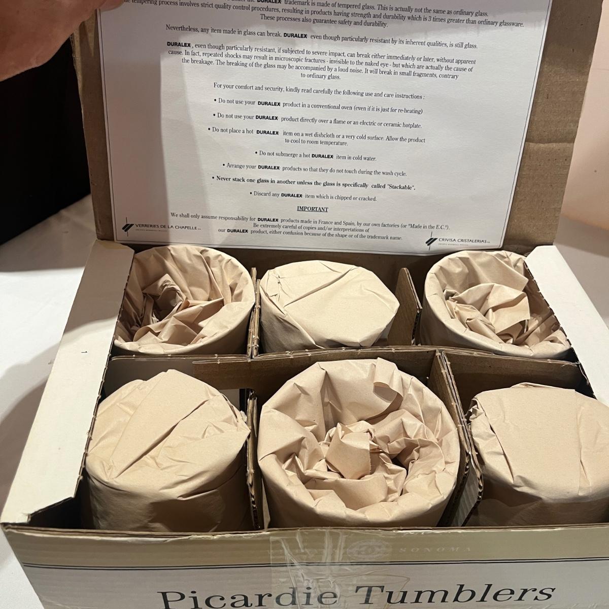 Lot includes two boxes of six Duralex Picardie glass tumblers from Williams Sonoma. The glasses were all still wrapped in original packing paper, one box was unwrapped to show the glasses. Each tumbler measures 3.5”D x 3.5”H.