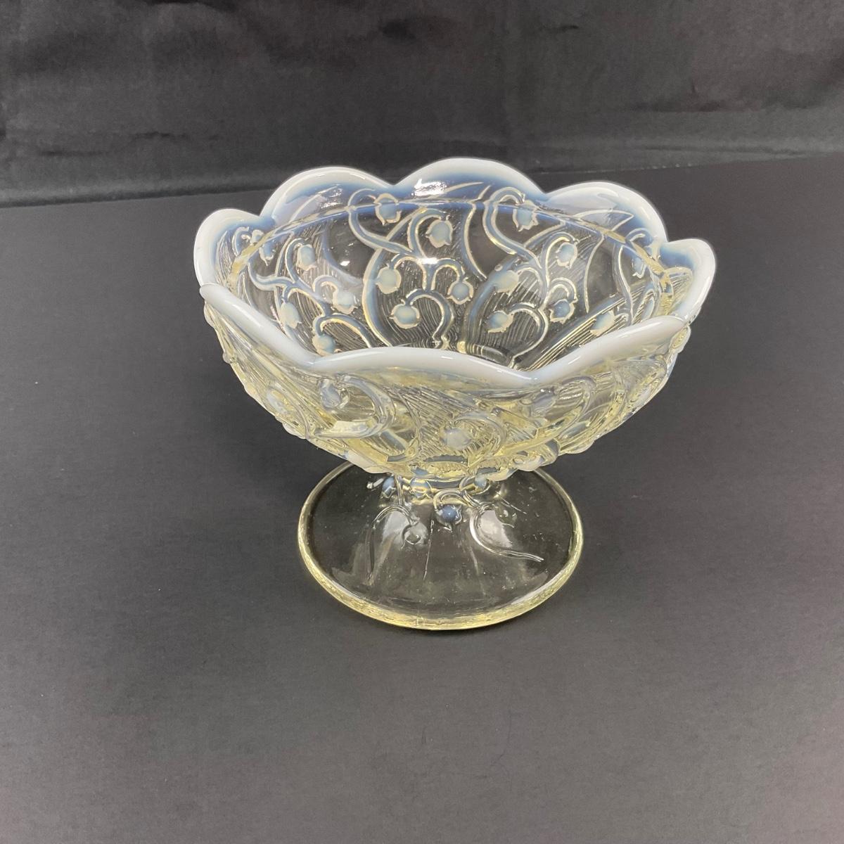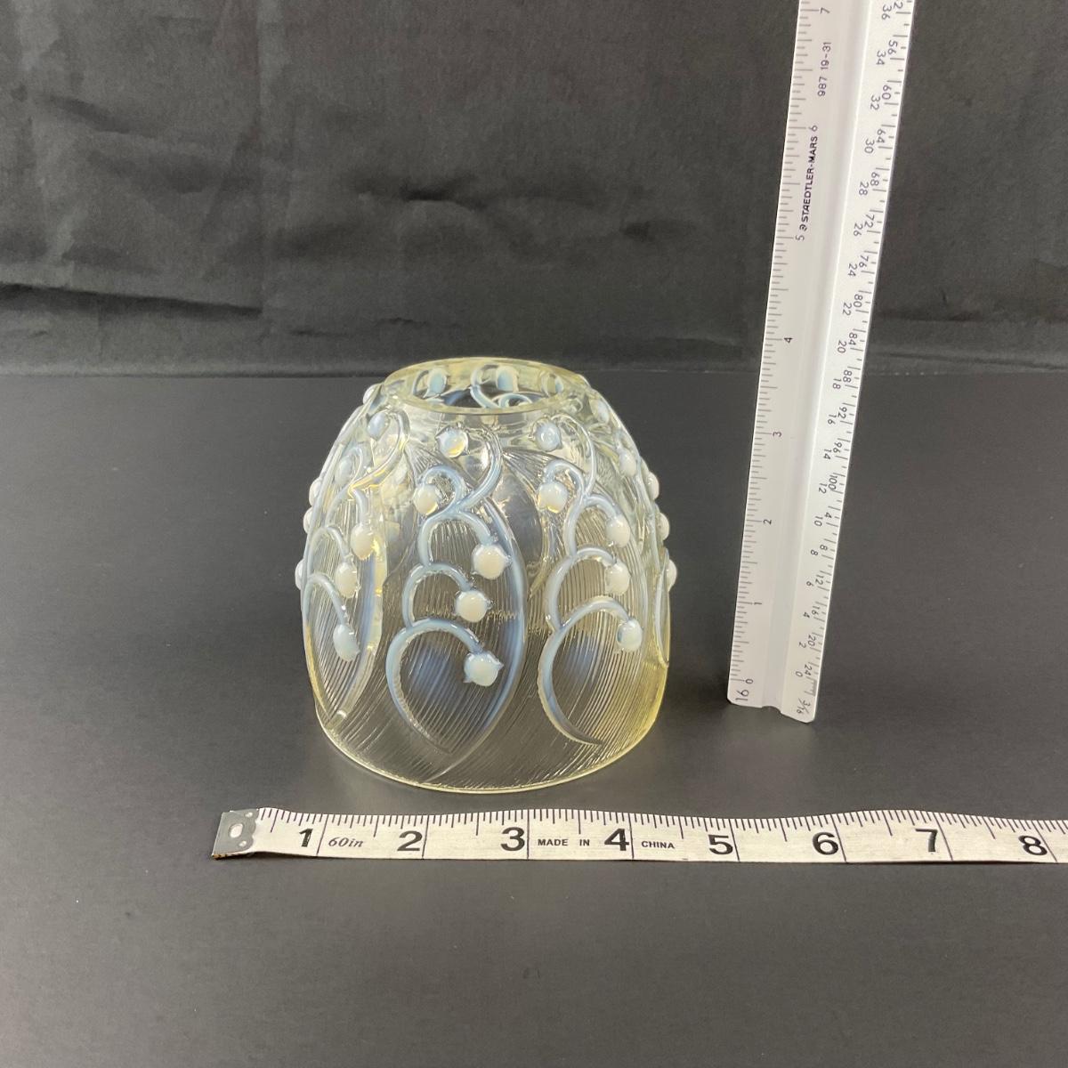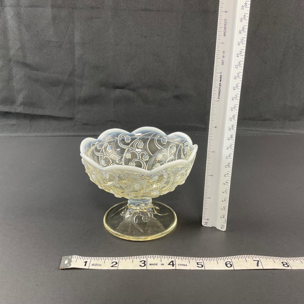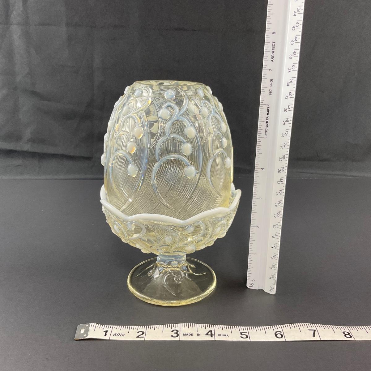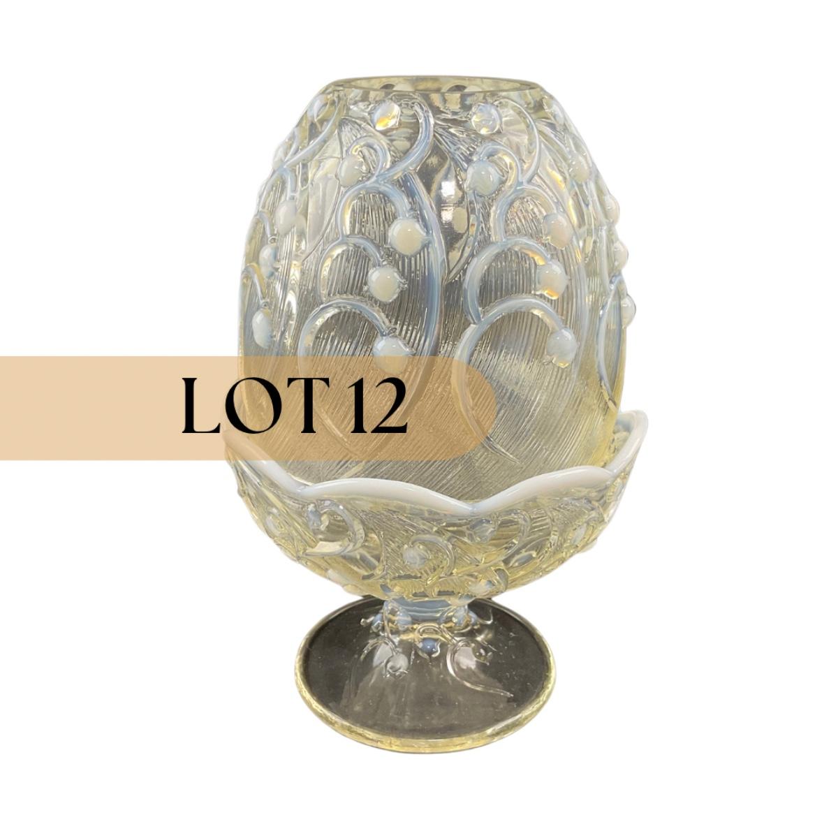 Add a touch of magic to your house with this stunning Fenton opalescent White Lily of the Valley fairy lamp. The base of the bottom does have a stamped Fenton logo. This piece has no damage, and appears to be in great shape with no visable chips, cracks, or broken pieces. Please see photos for details and condition. Any condition statement is given as a courtesy to a client, is an opinion, and should not be treated as a statement of fact. Reference to condition written, oral or within a condition report shall not be regarded as a full account of condition and may not include all defects, alterations, or restorations. Absence of a condition report does not imply a lot is flawless or lacking imperfections or damage. Katherine’s Auction & Appraisal Service shall have no responsibility for any error or omission. Returns shall not be accepted on the basis of condition. ::: Shipping is available on this lot. If you require shipping you must let us know at the close of the auction. We will coordinate with you after the item has been won. Shipping fees will include insurance up to or exceeding the value of all items being mailed. If you have any questions regarding this lot please contact the auctioneer either via this website, by direct email or by phone. PICK UP TIMES and other important information can be found in the TERMS and DESCRIPTION of the auction. Please take a look for pertinent information. Thanks!