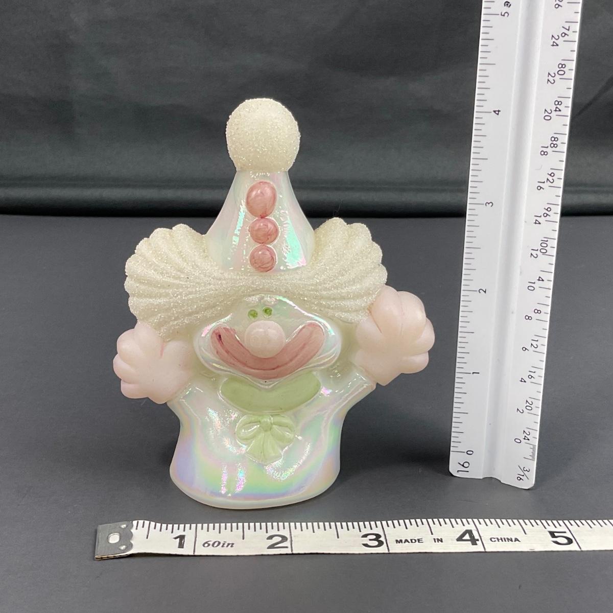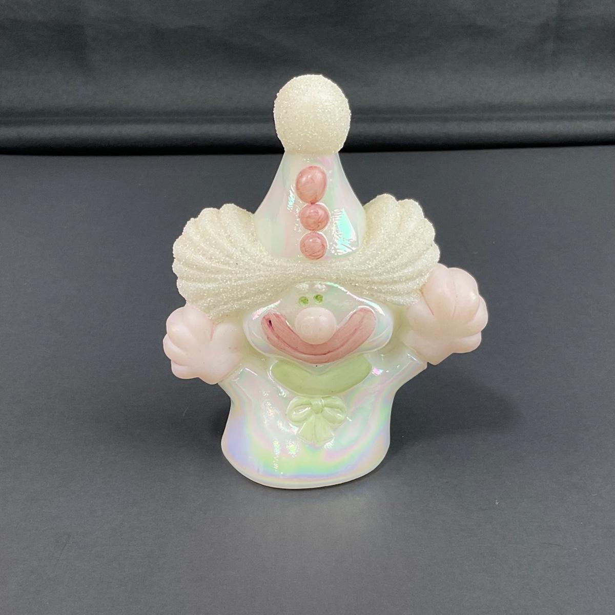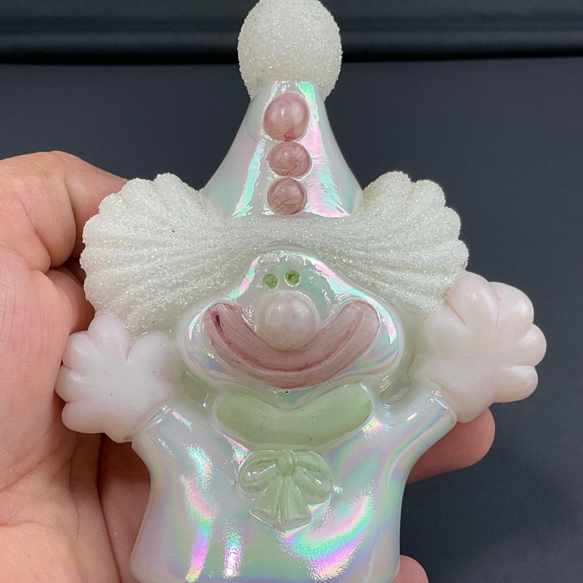 -12- FENTON | White & Pink Opalescent Frosted Hand Painted Clown | “Fools In Love”