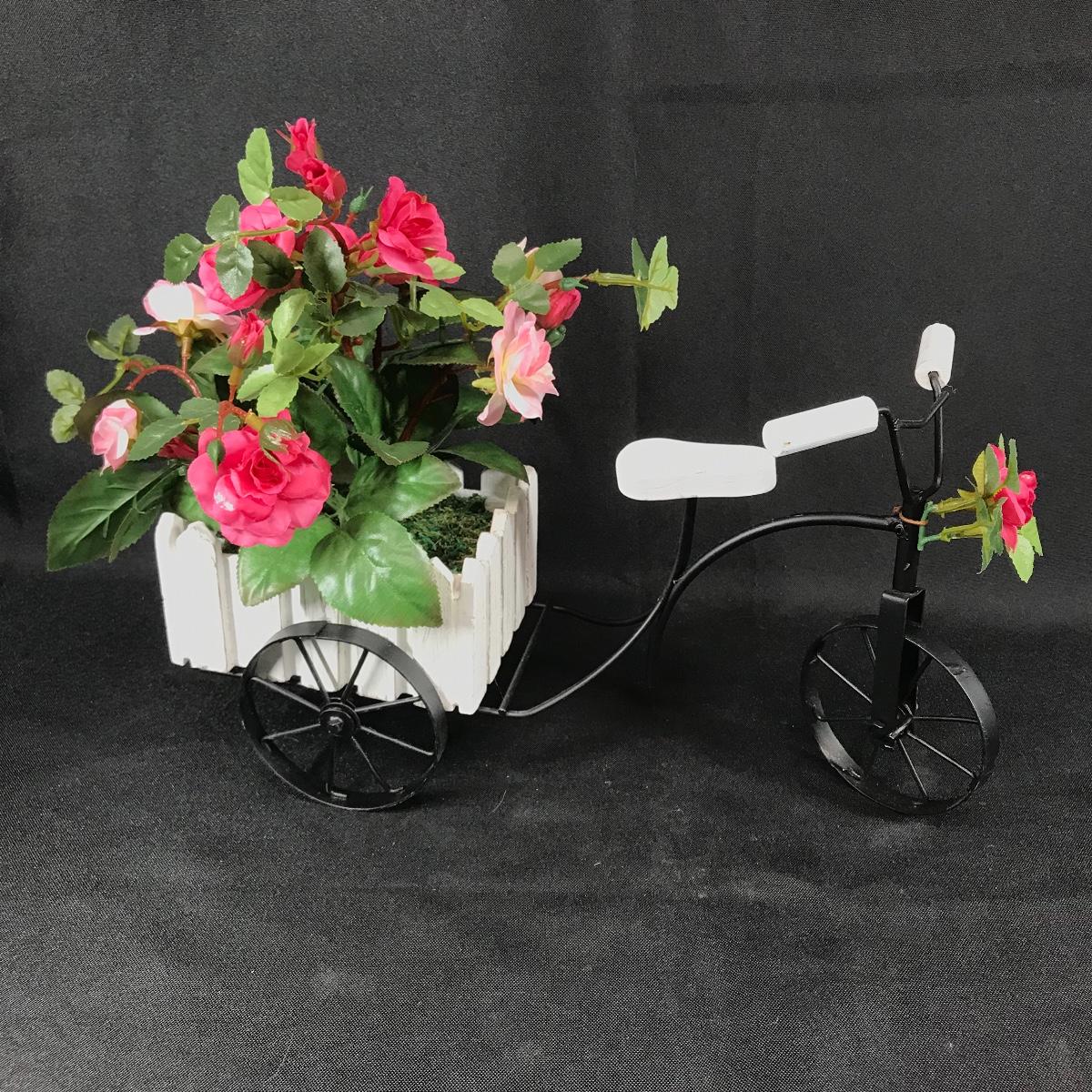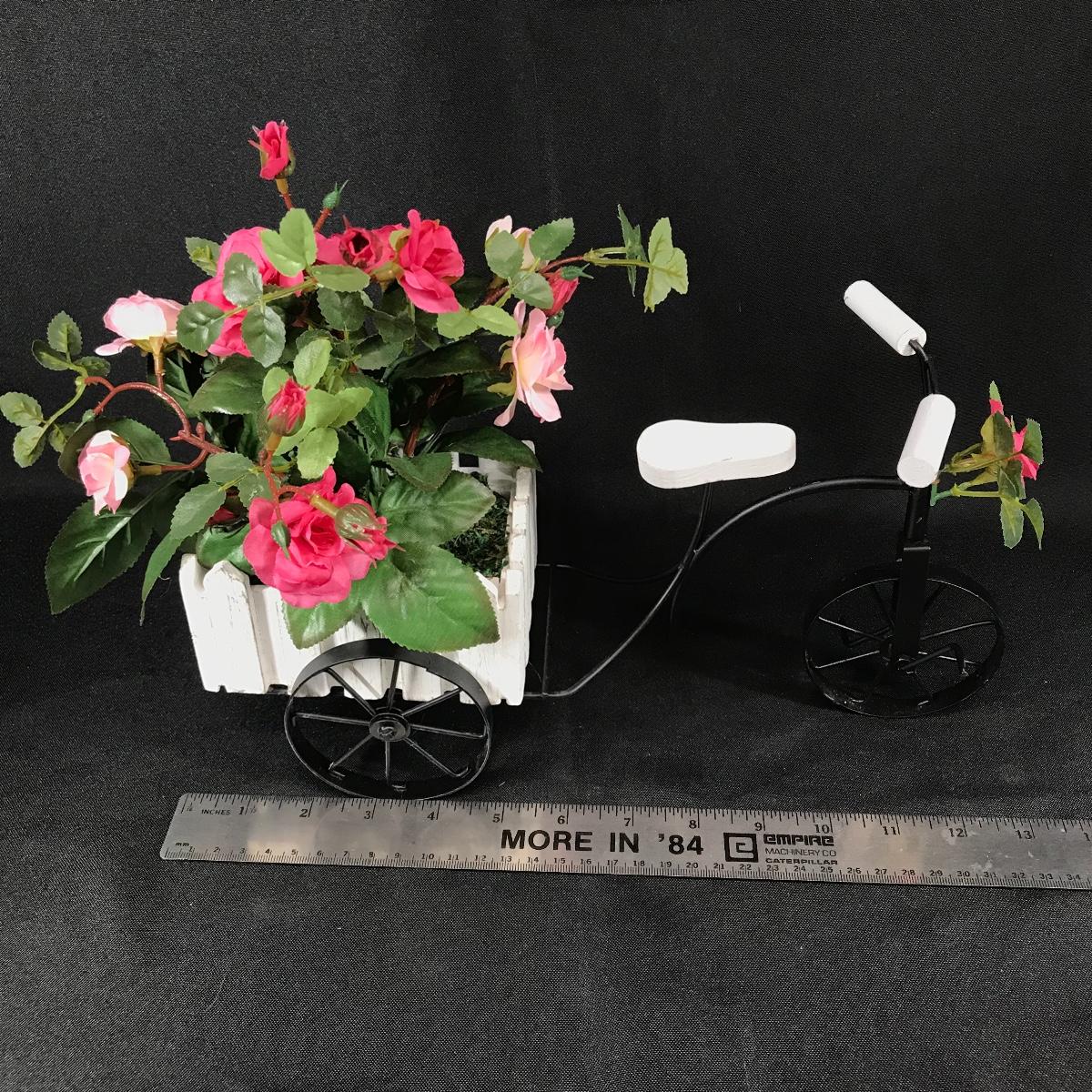 Up for auction is a flower cart tricycle. It measures approximately 1 foot in length and is made of a wooden body with metal frame and wheels. The flowers inside the box are synthetic; see pictures.