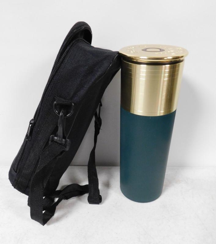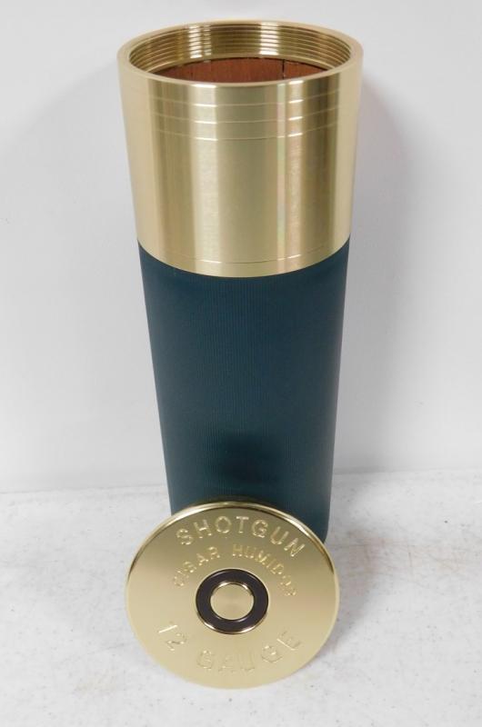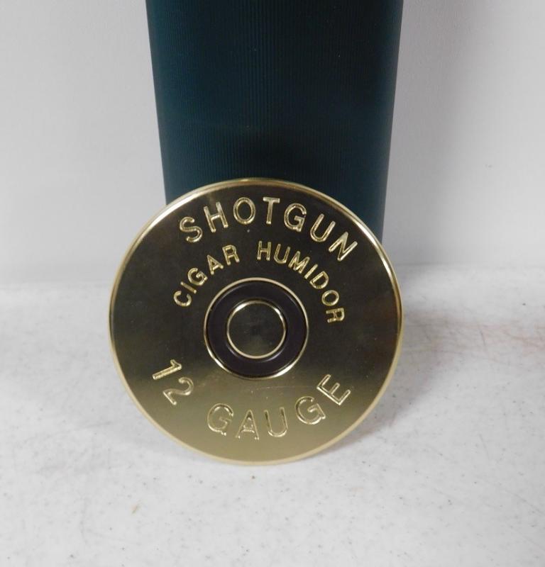 12 Gauge Shot Gun Shell Cigar Humidor with brass top and plastic body. Interior lined with cedar. Comes with carry case. appears to be new.