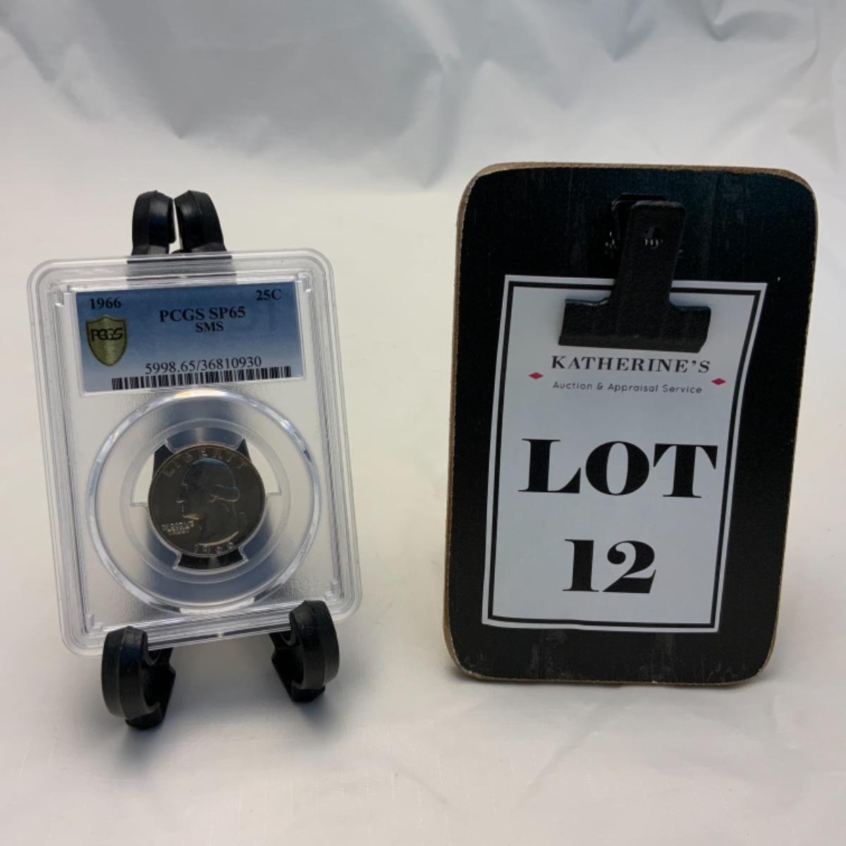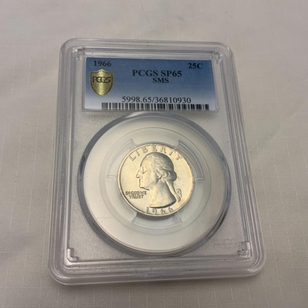 Graded 1966 Quarter in slab. SP 65 SMS as determined by PSGS. Please see photos for details and condition. ::: Shipping is available on this lot. If you require shipping you must let us know at the close of the auction. We will coordinate with you after the item has been won. Shipping fees will include insurance up to or exceeding the value of all items being mailed. If you have any questions regarding this lot please contact the auctioneer either via this website, by direct email or by phone. PICK UP TIMES and other important information can be found in the TERMS and DESCRIPTION of the auction. Please take a look for pertinent information. Thanks!
