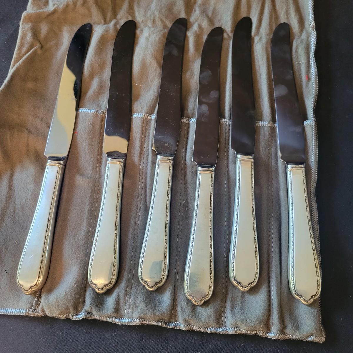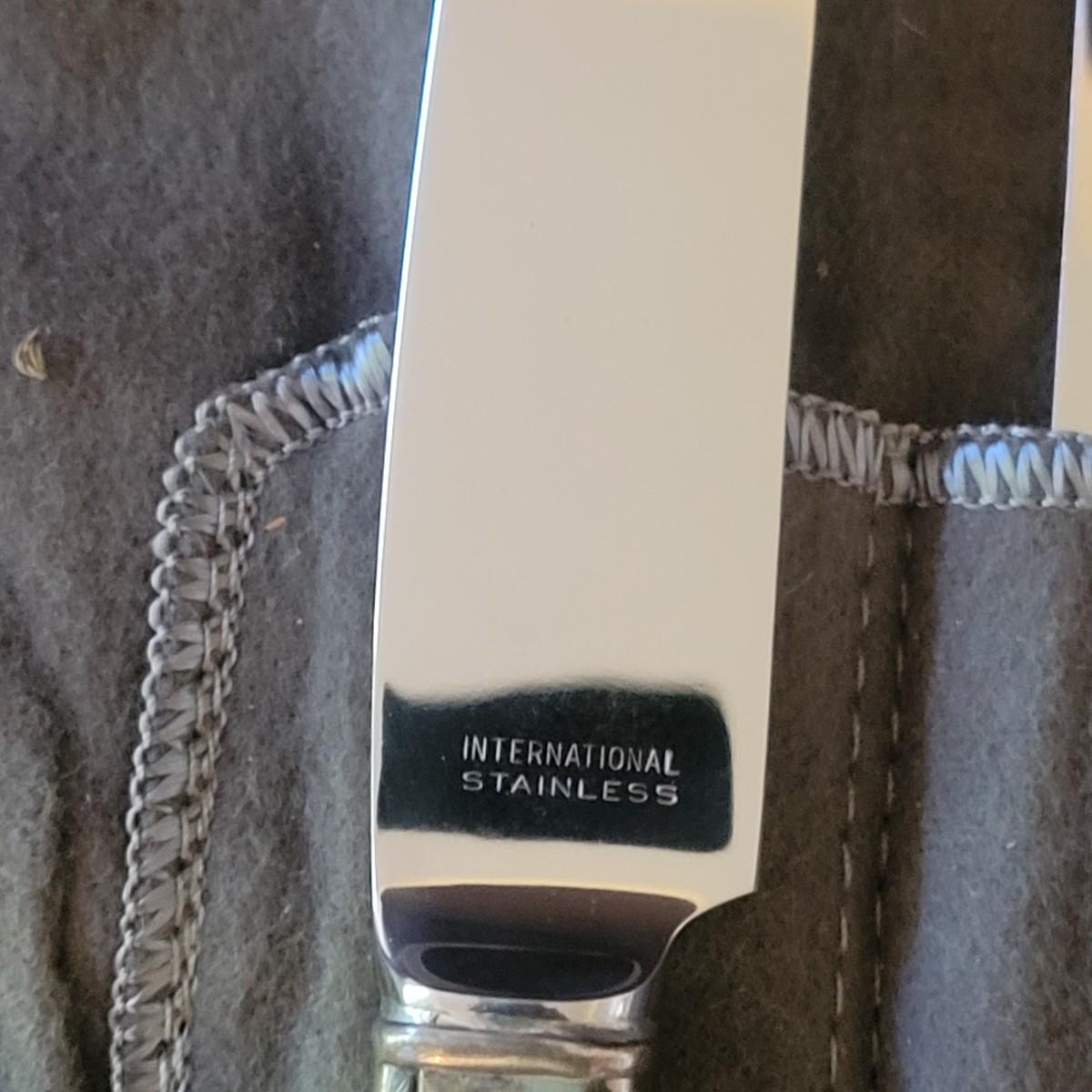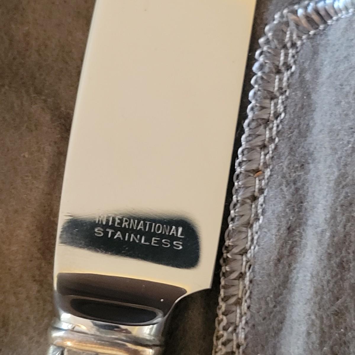 12 stainless steel knives manufactured by International in felt wraps. It appears there are plated silver inserts on the handles. All are in excellent condition. Shipping available