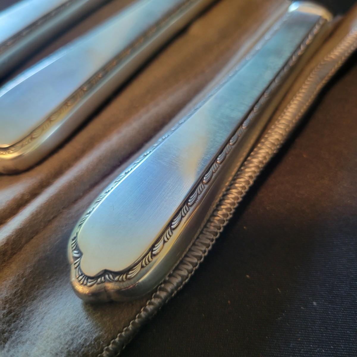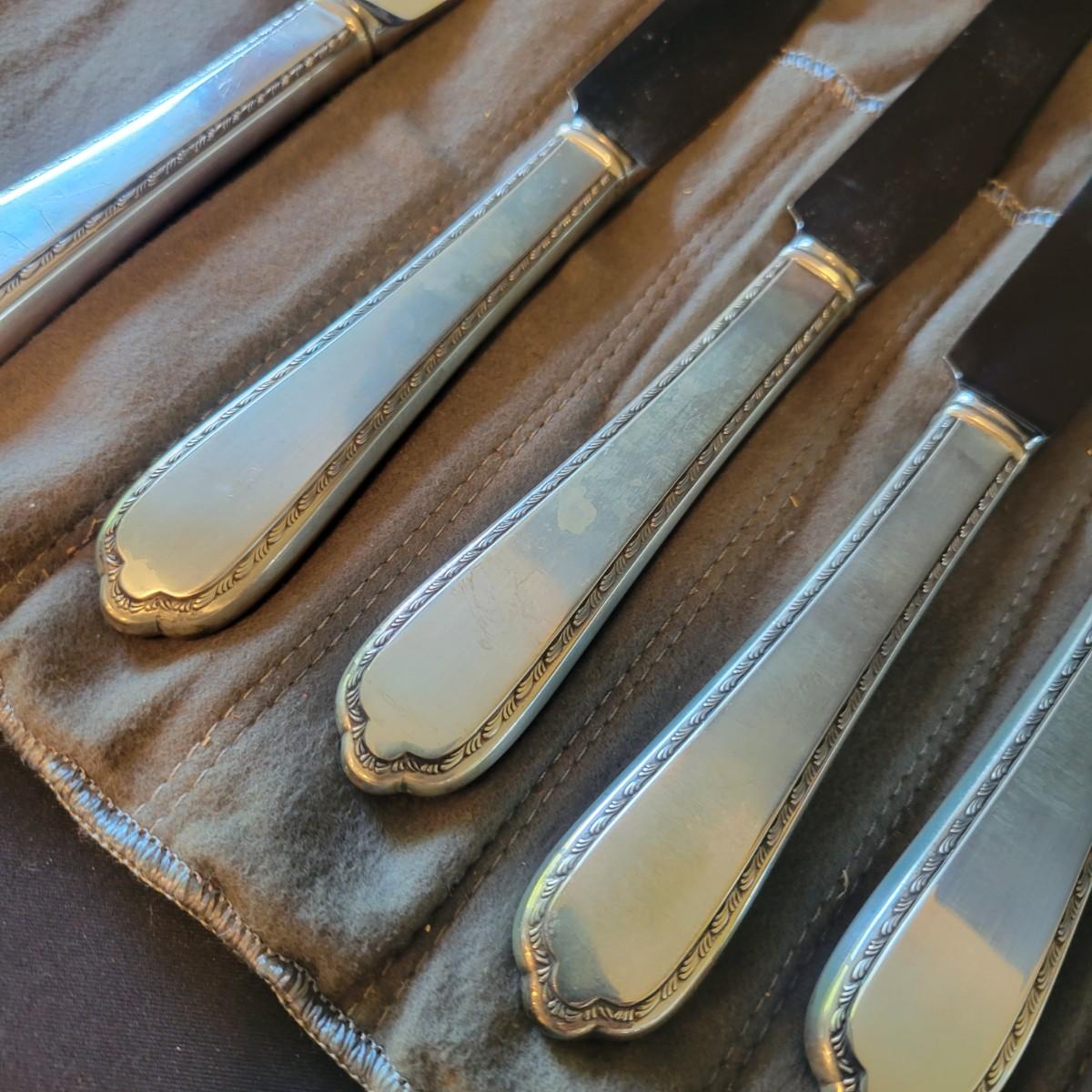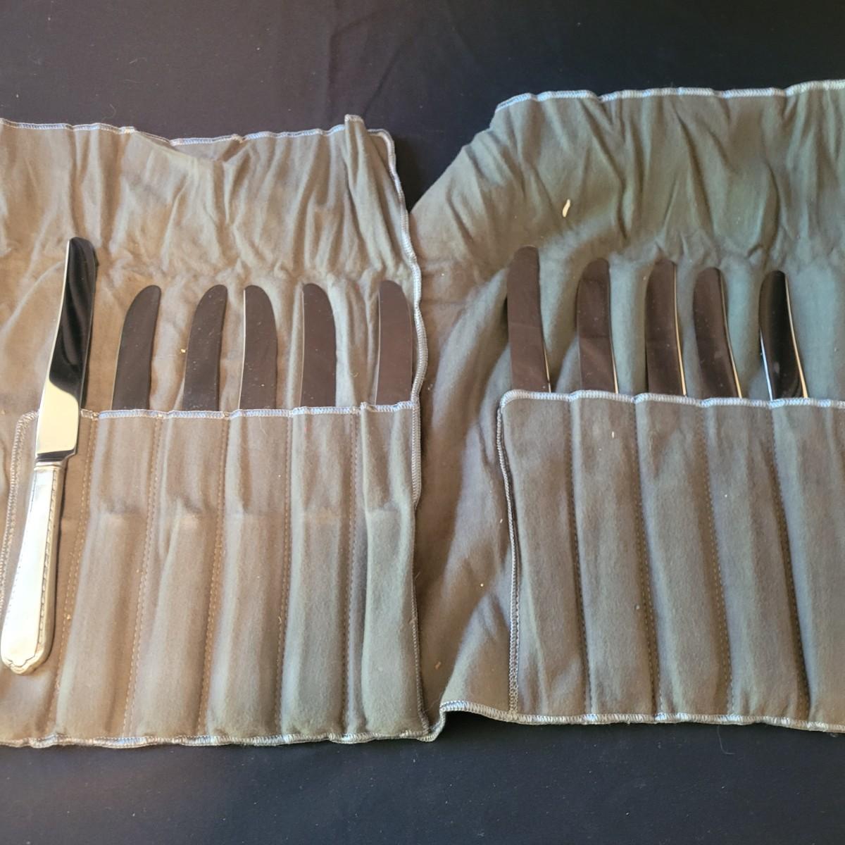 12 stainless steel knives manufactured by International in felt wraps. It appears there are plated silver inserts on the handles. All are in excellent condition. Shipping available