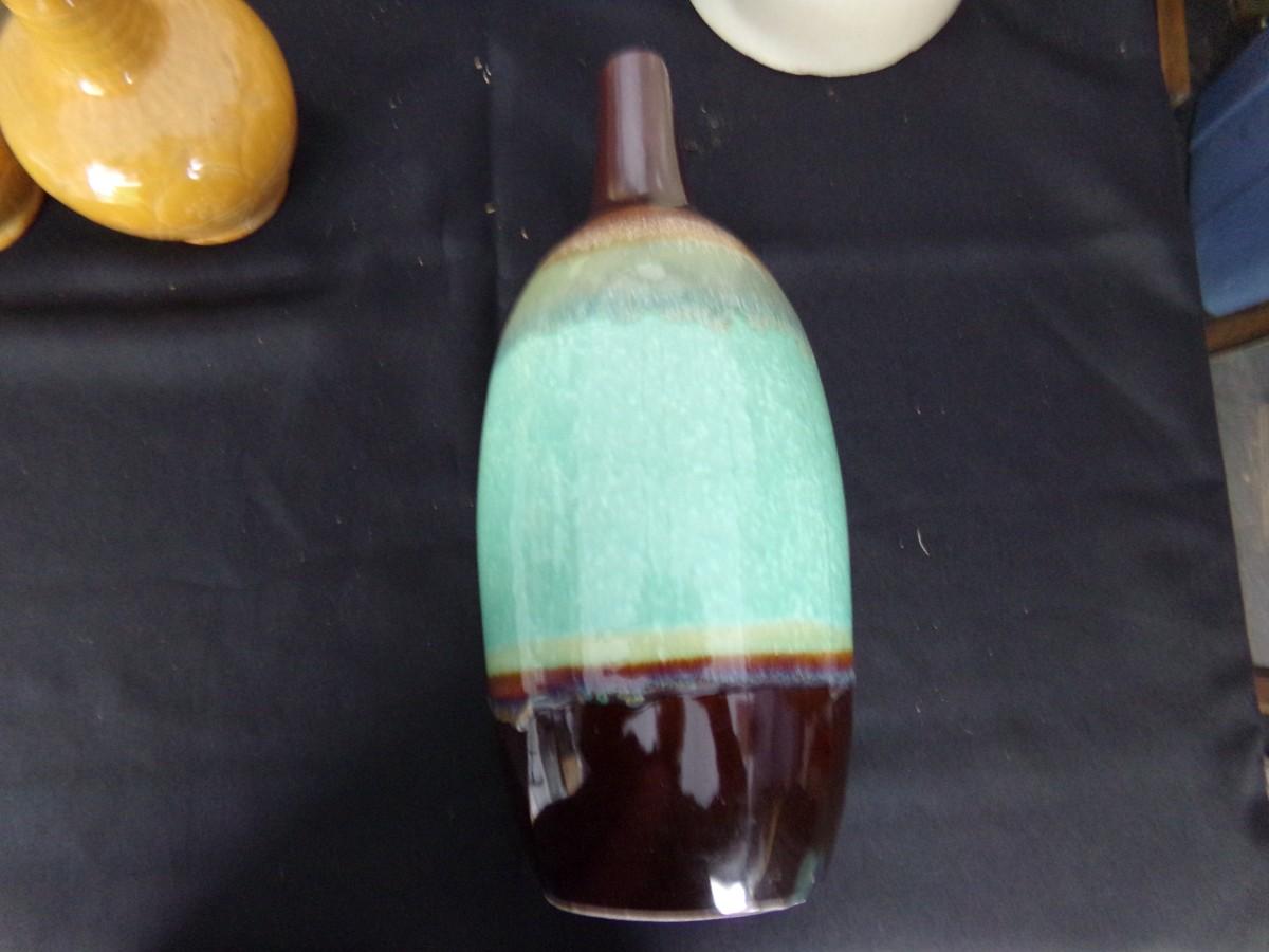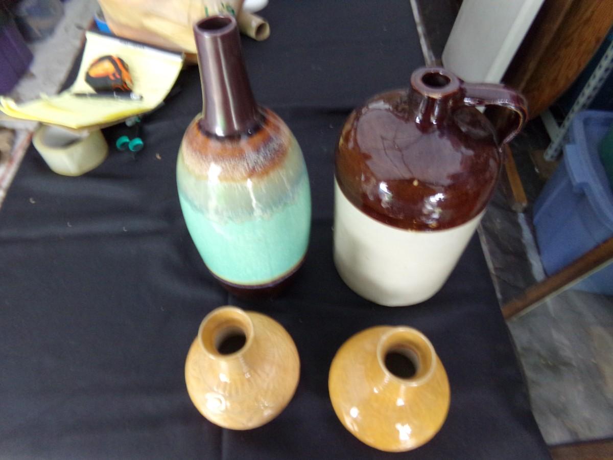 7"X12" JUG, 5"X14" GREEN VASE, 2 5"X7" VASES.