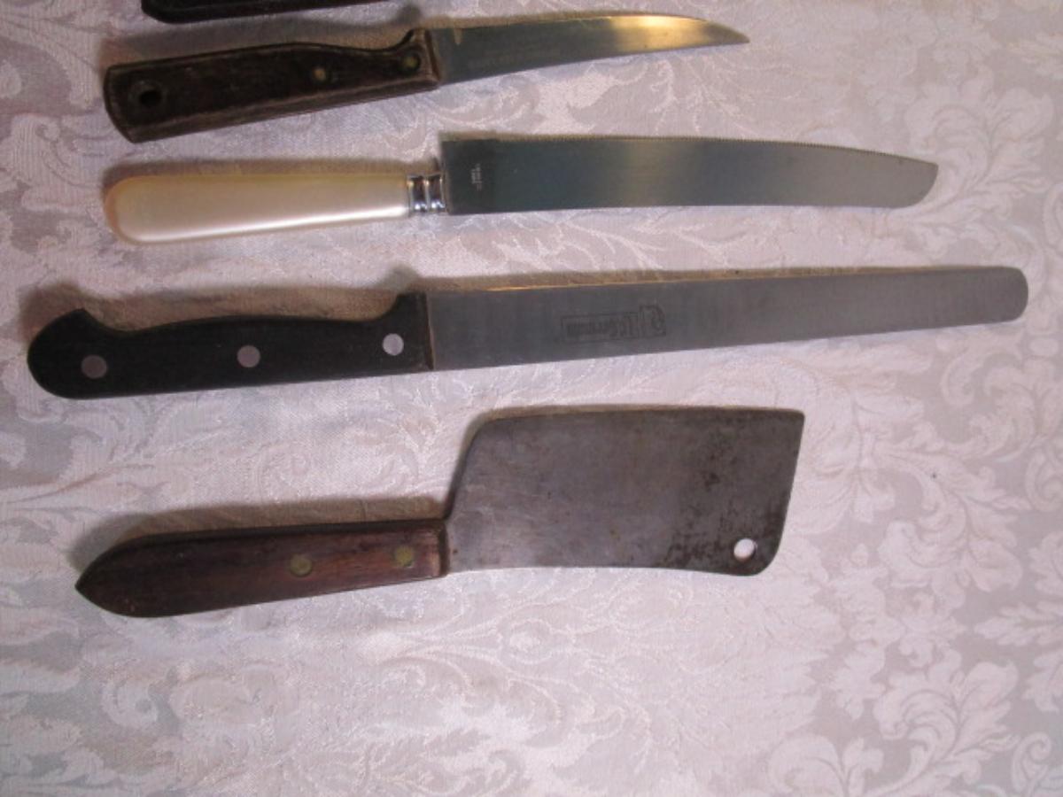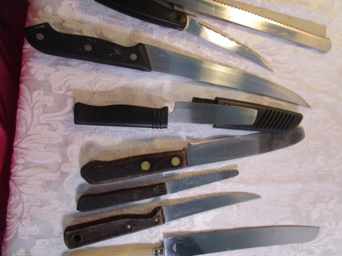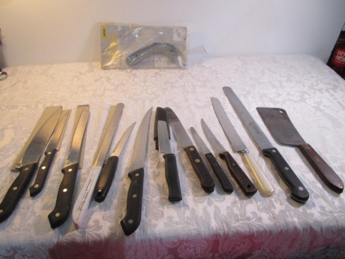 12 kitchen knives, 1 cleaver, 1 knife sharpener