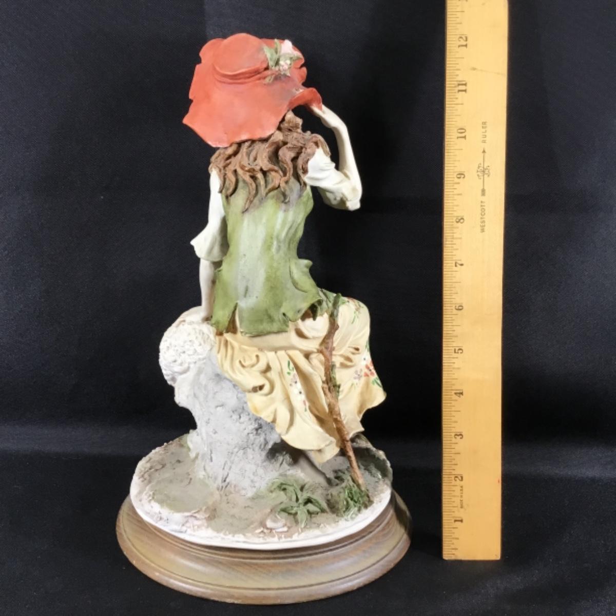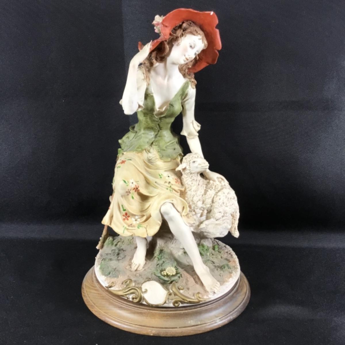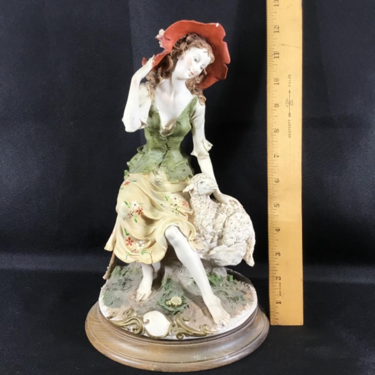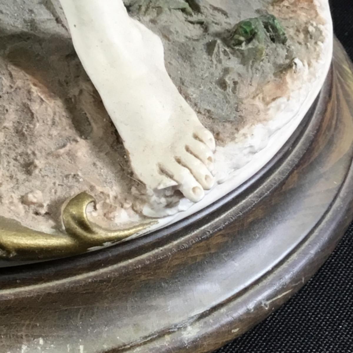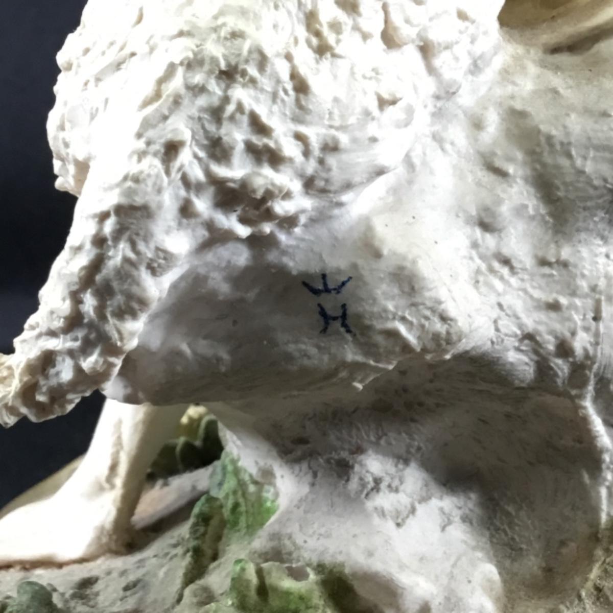 Resin atop a wood base. The shepherds left big toe has been broken off; see pictures. There is a marking on the sheet that appears to be an H with a crown on top.