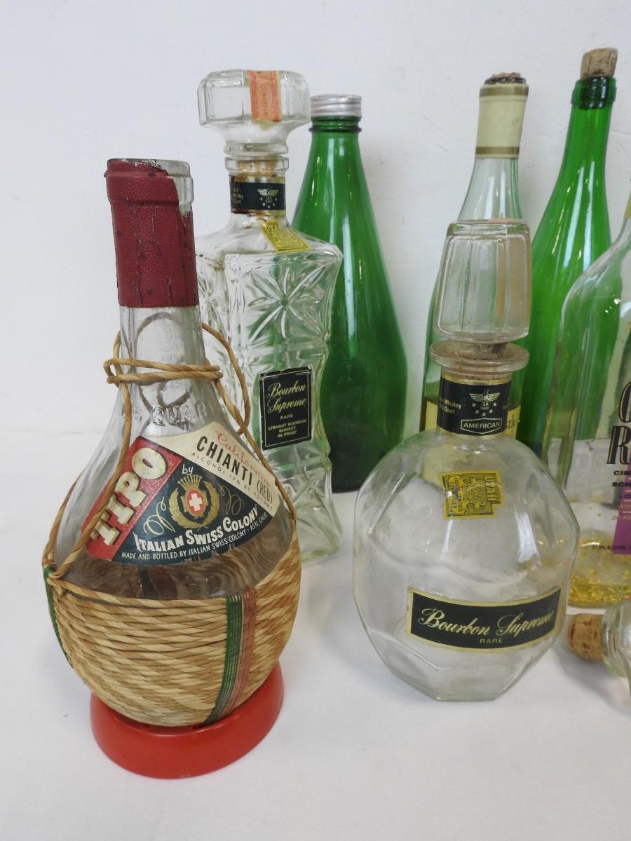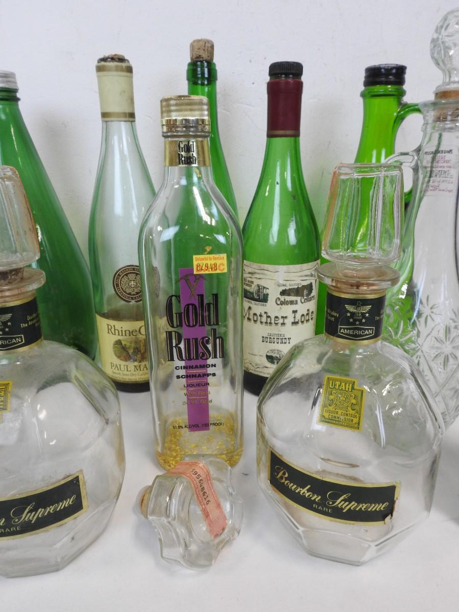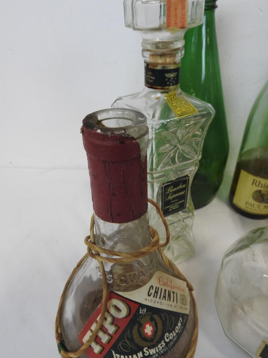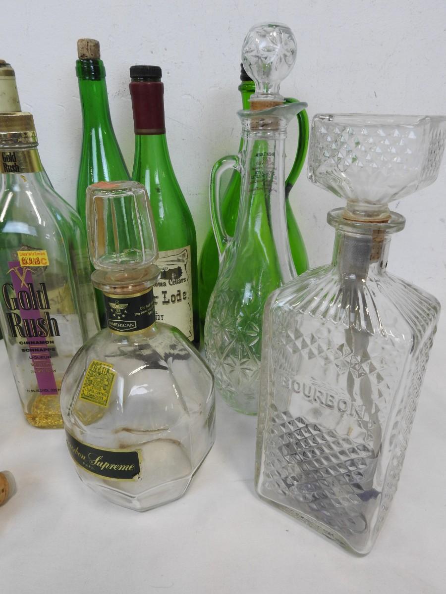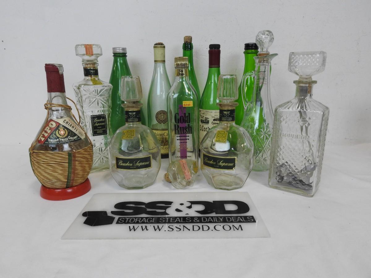 12 Liquor Bottles: 11 W/topper, 1 Without Topper, Various Shapes/Colors, 1 Extra Topper
